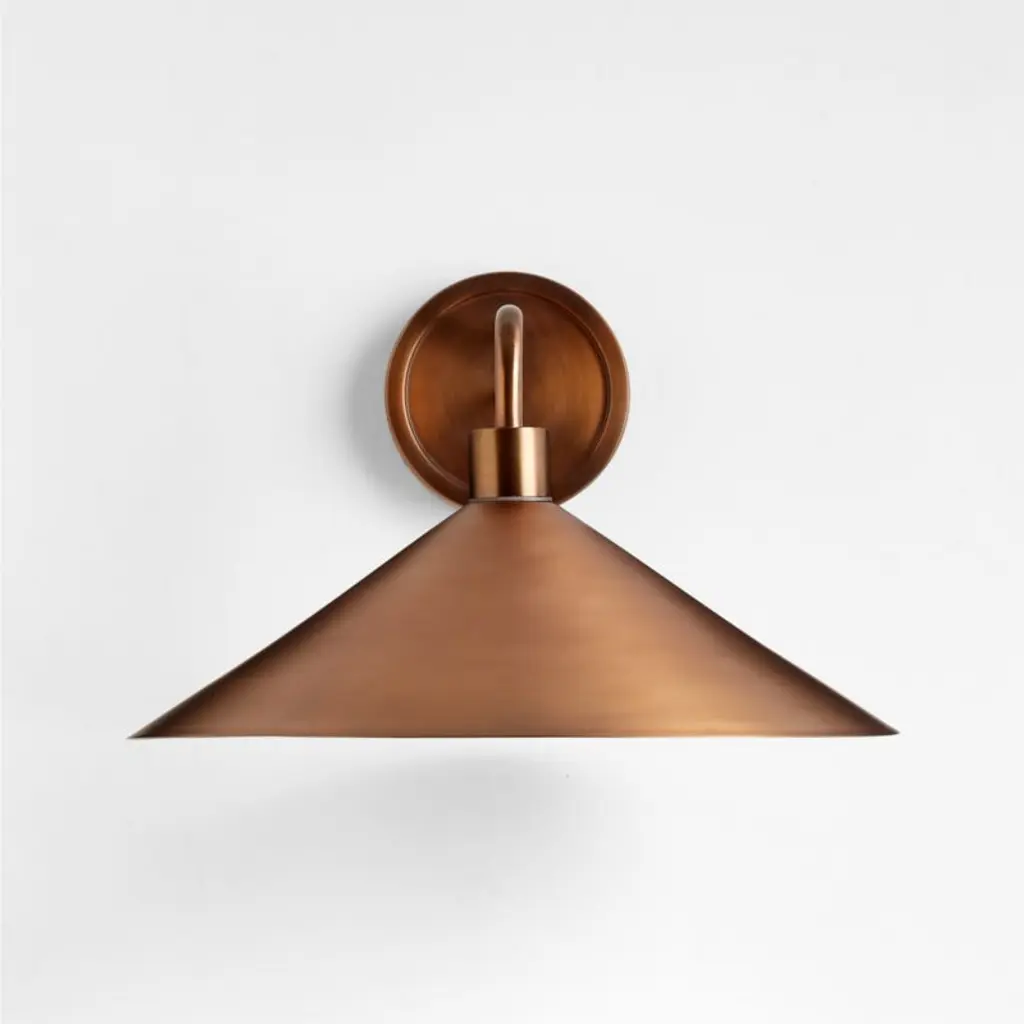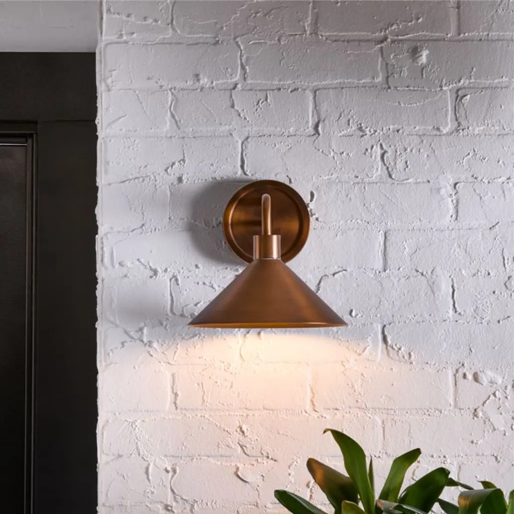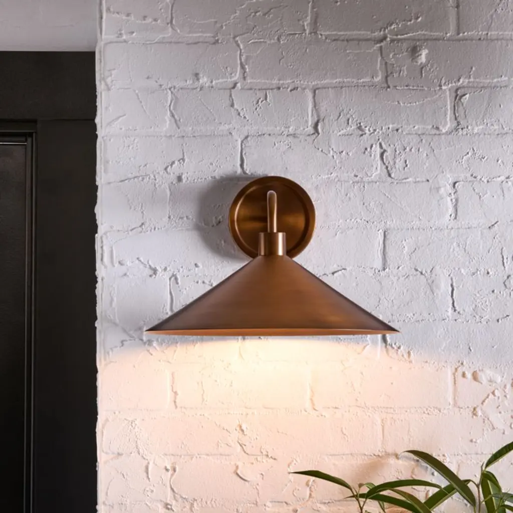 Graceful in brushed brass-finished steel, our versatile indoor/outdoor Andre sconce adorns your home like a piece of modern, minimalist jewelry. Slender, parallel tubes curve to support a broad conical shade that washes walls with light. Hung on a front porch, over a kitchen sink or installed in multiples lining a hallway, the large wall light offers an illuminating mix of task and ambient lighting.
