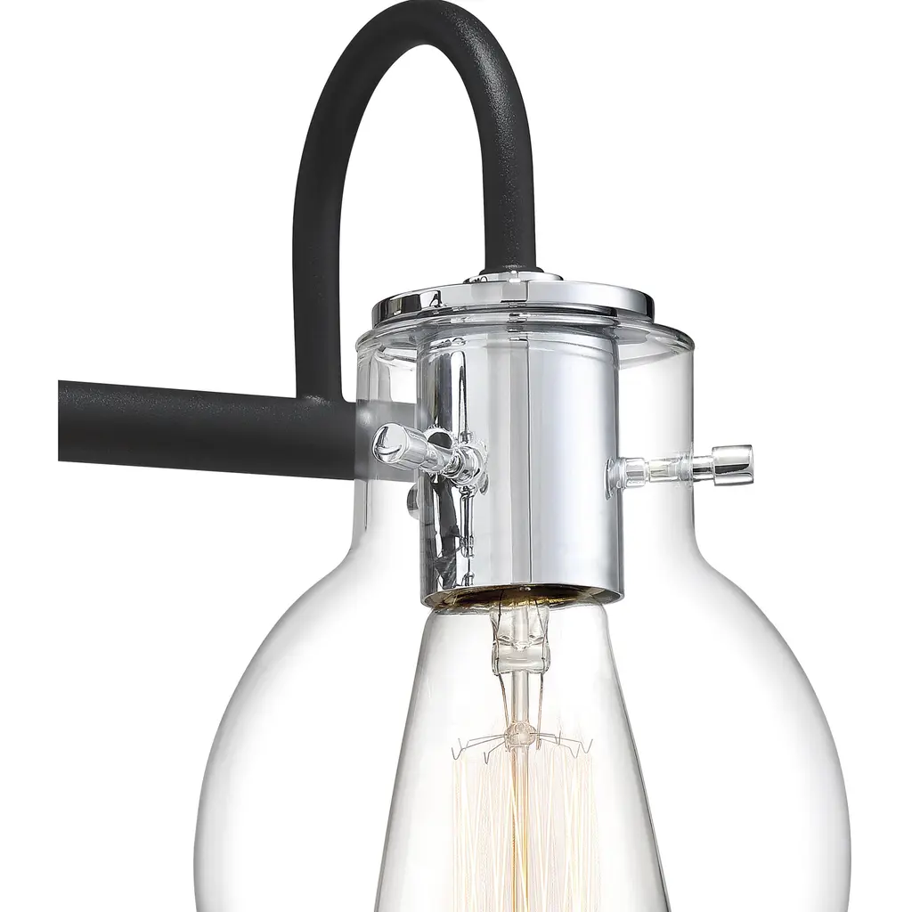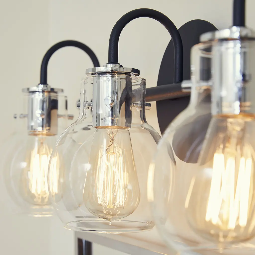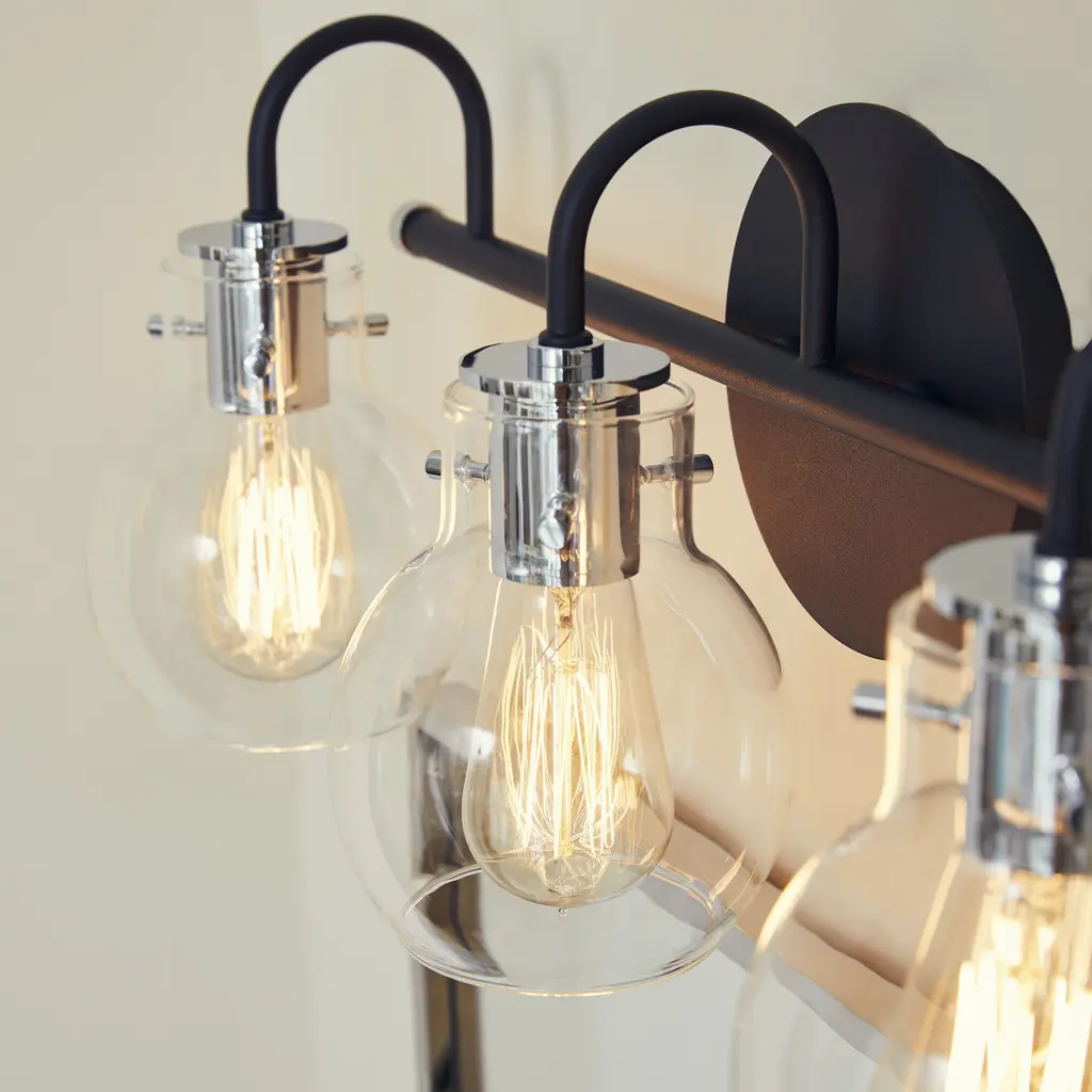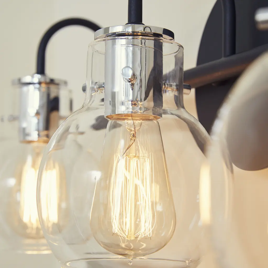 The ageless style of the Andrews Bath Collection is synonymous with classic industrial design. The clear glass shades encircle the sockets and appear as though they are floating over the vintage filament bulbs. The earth black finish on the backplate, support bar and arms is the perfect contrast to the chrome accents. We recommend utilizing vintage Edison-style bulbs for maximum effect.