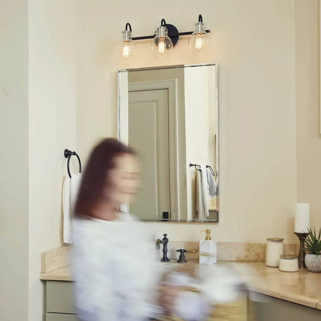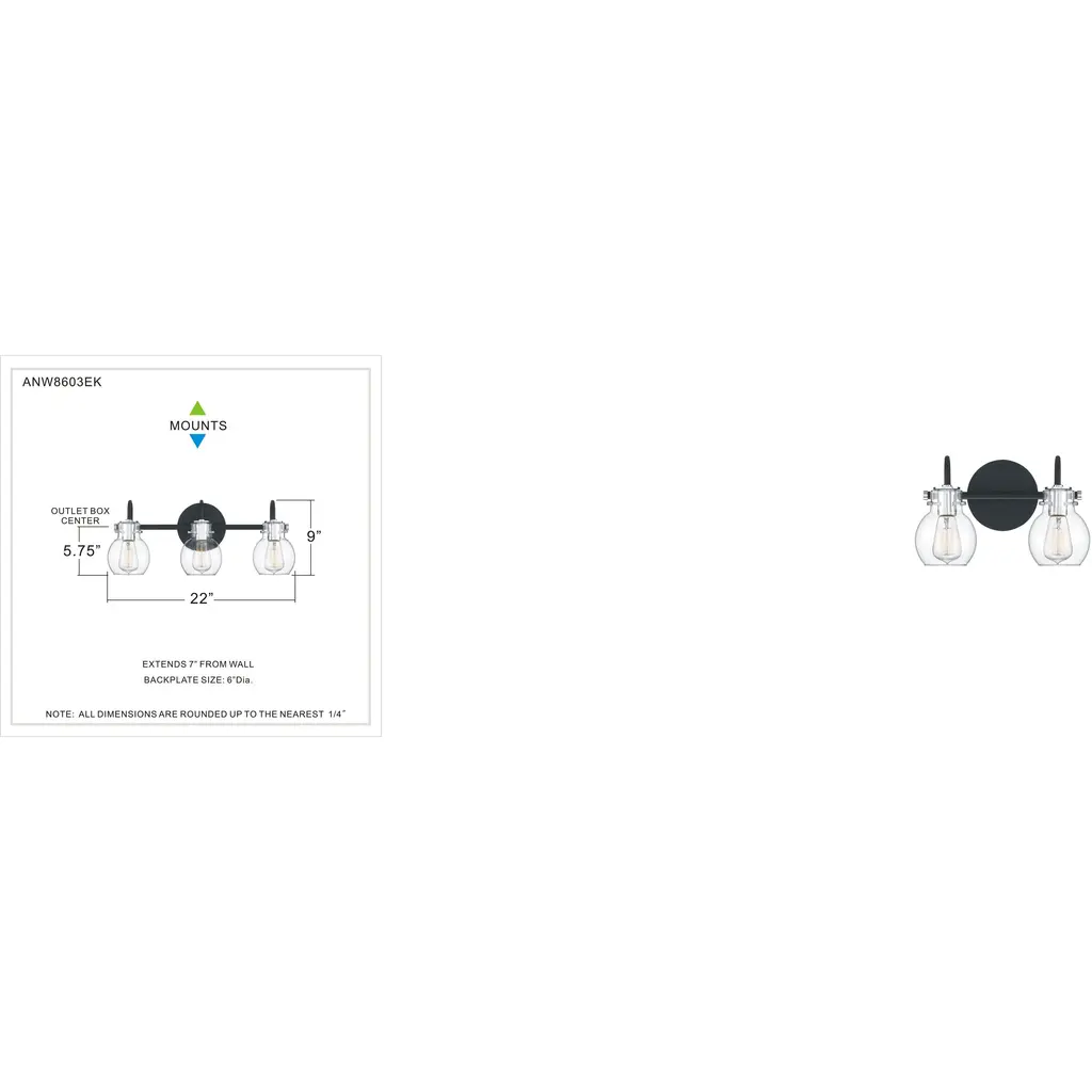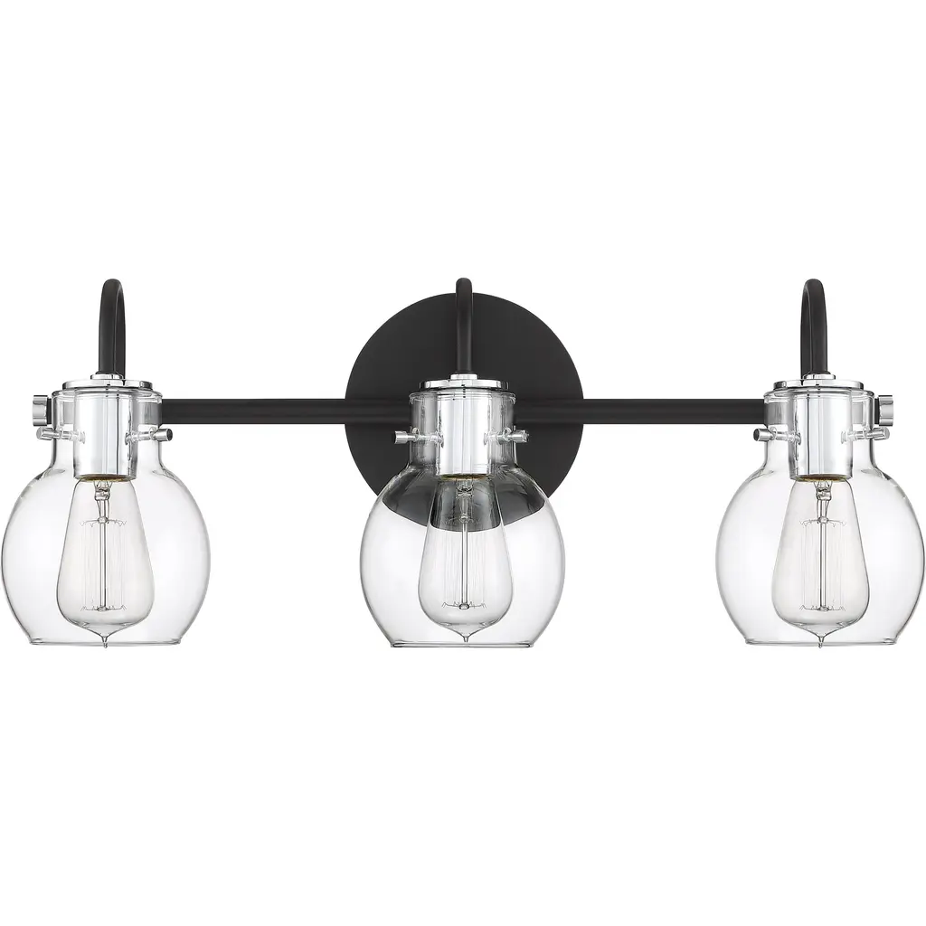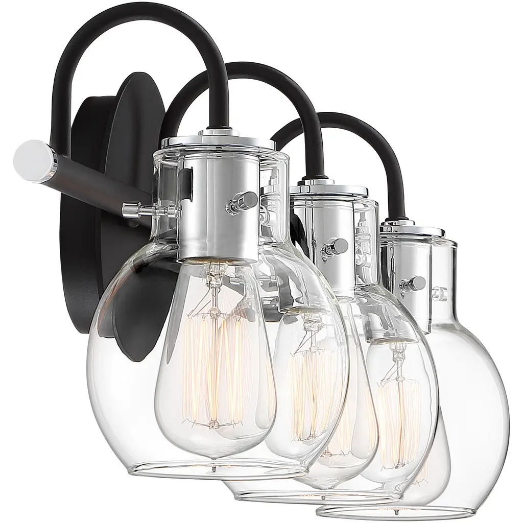 The ageless style of the Andrews Bath Collection is synonymous with classic industrial design. The clear glass shades encircle the sockets and appear as though they are floating over the vintage filament bulbs. The earth black finish on the backplate, support bar and arms is the perfect contrast to the chrome accents. We recommend utilizing vintage Edison-style bulbs for maximum effect.