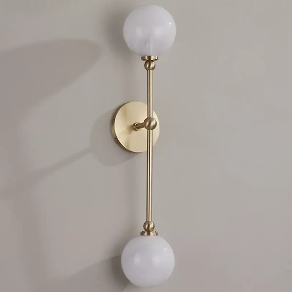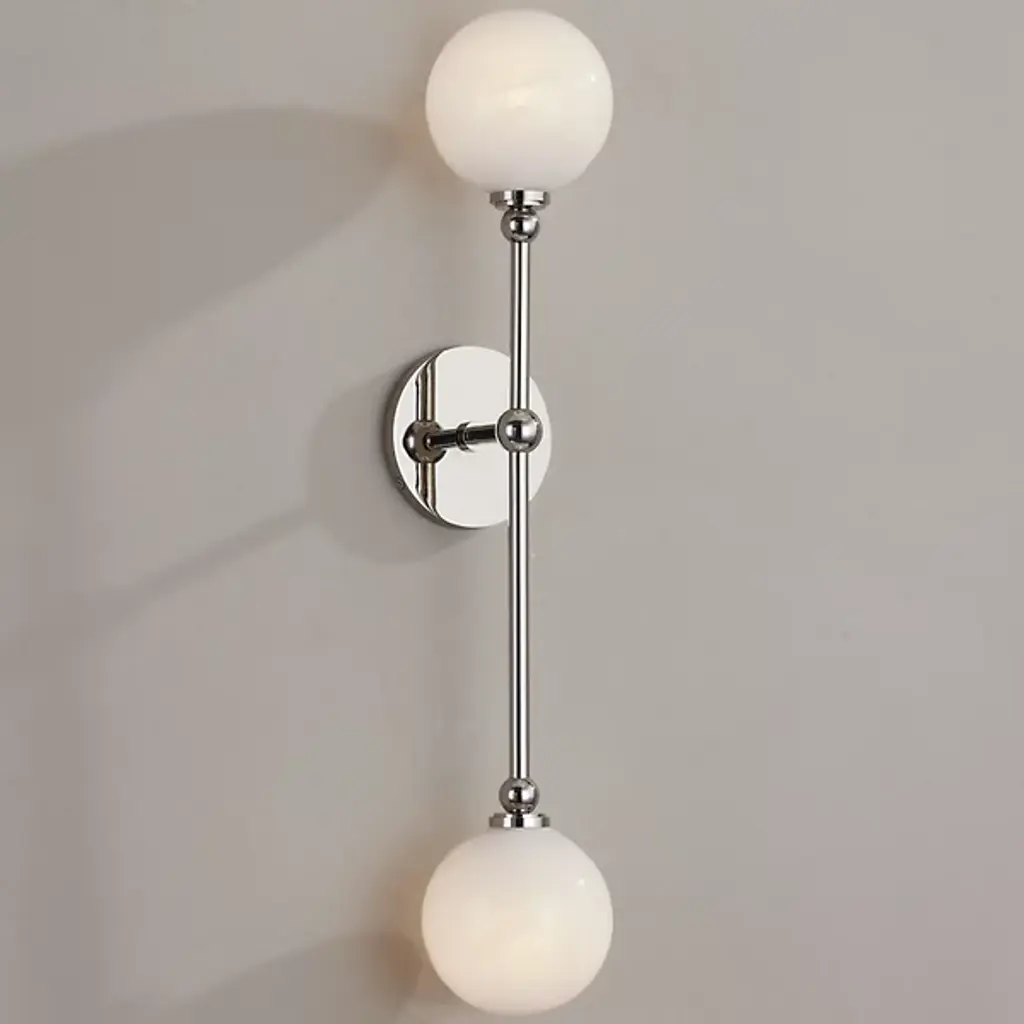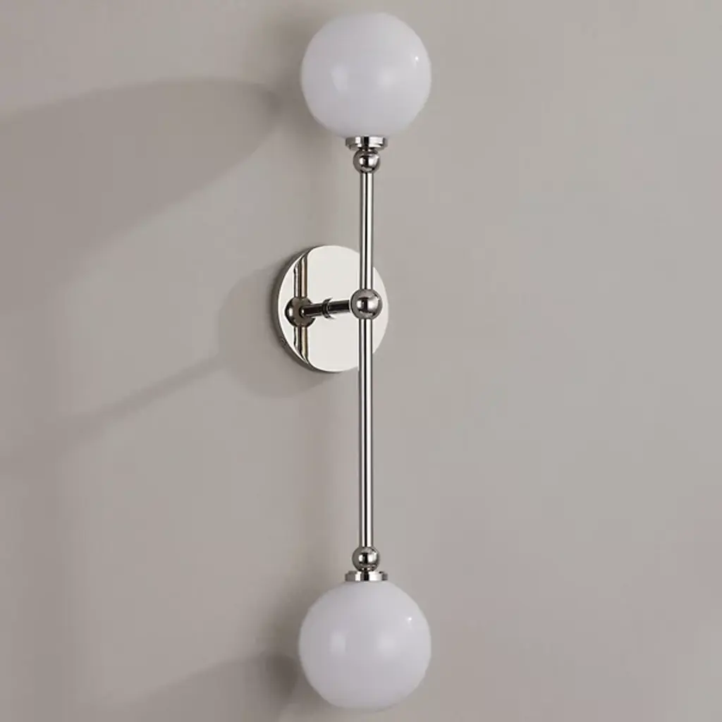 Add vintage flair to inside walls with the inspired, stately style of Andrews Wall Sconce from Hudson Valley Lighting. A steel disc wall mount extends a short rod to the sides, each end of the bar setting energy-friendly LED lamping beneath rounded globe shades. The cloudy inner texture of each globe obscures direct glare from the lamping, while rounded accents threaded onto the slender stem provide a final pop of inspired accent.