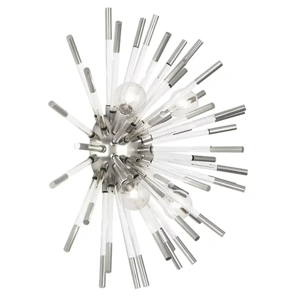 The Andromeda Wall Sconce by Robert Abbey blends high-functionality and visually-appealing aesthetics for contemporary living spaces. The fixture sports a starburst silhouette which consists of clear acrylic rods which extend from a domed wall plate and culminate in finished metal tips, hence its namesake. A series of exposed Halogen bulbs (not included) hide within the rods, providing a warm, shimmering ambiance once lit. This piece is best suited for areas like entryways, conference rooms, and dining areas.