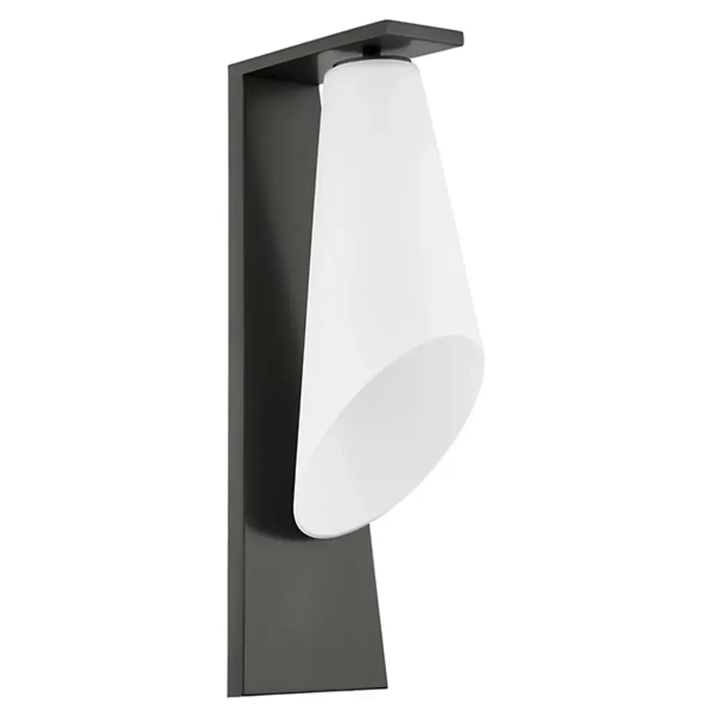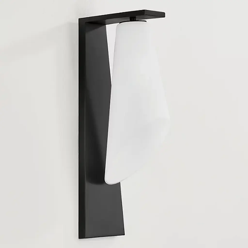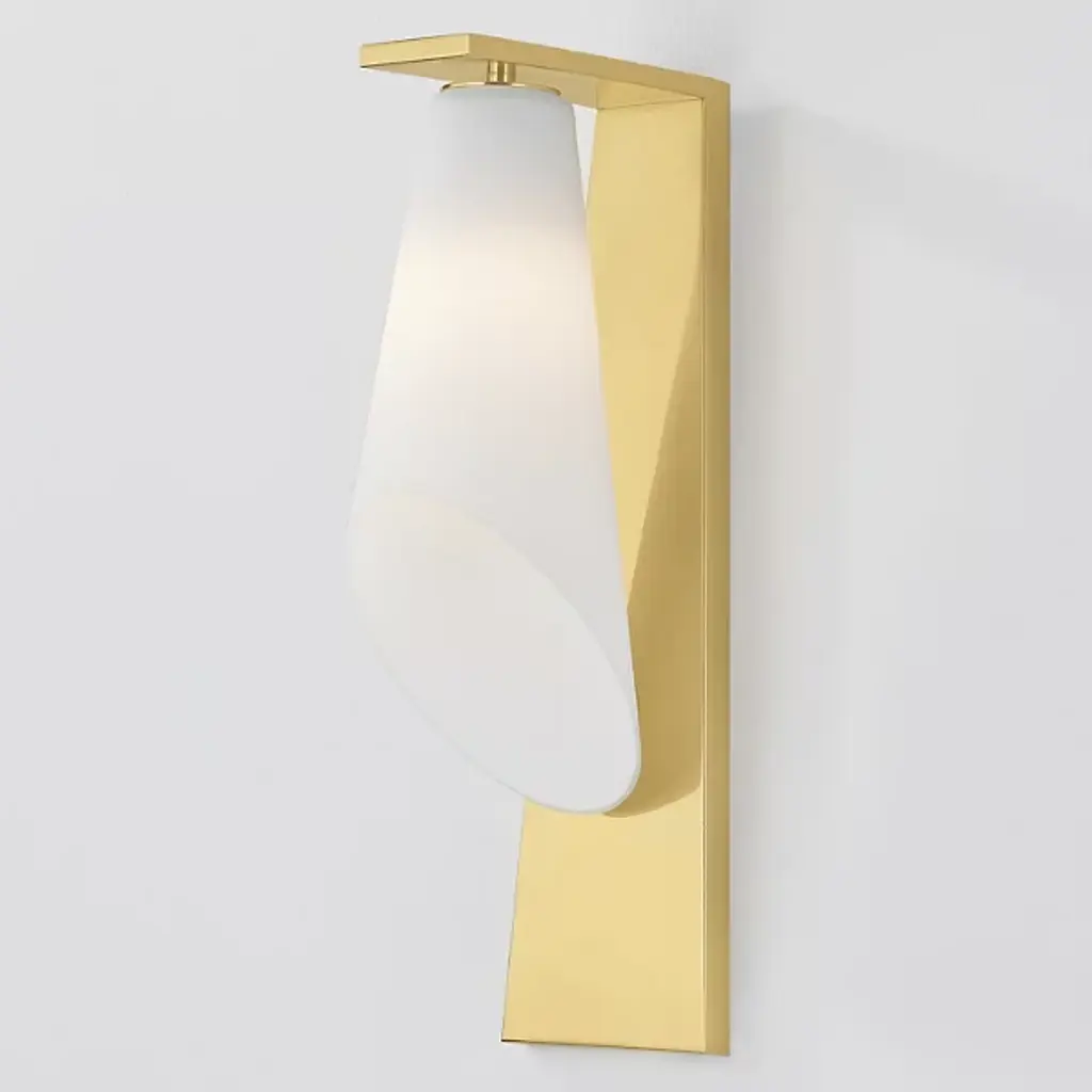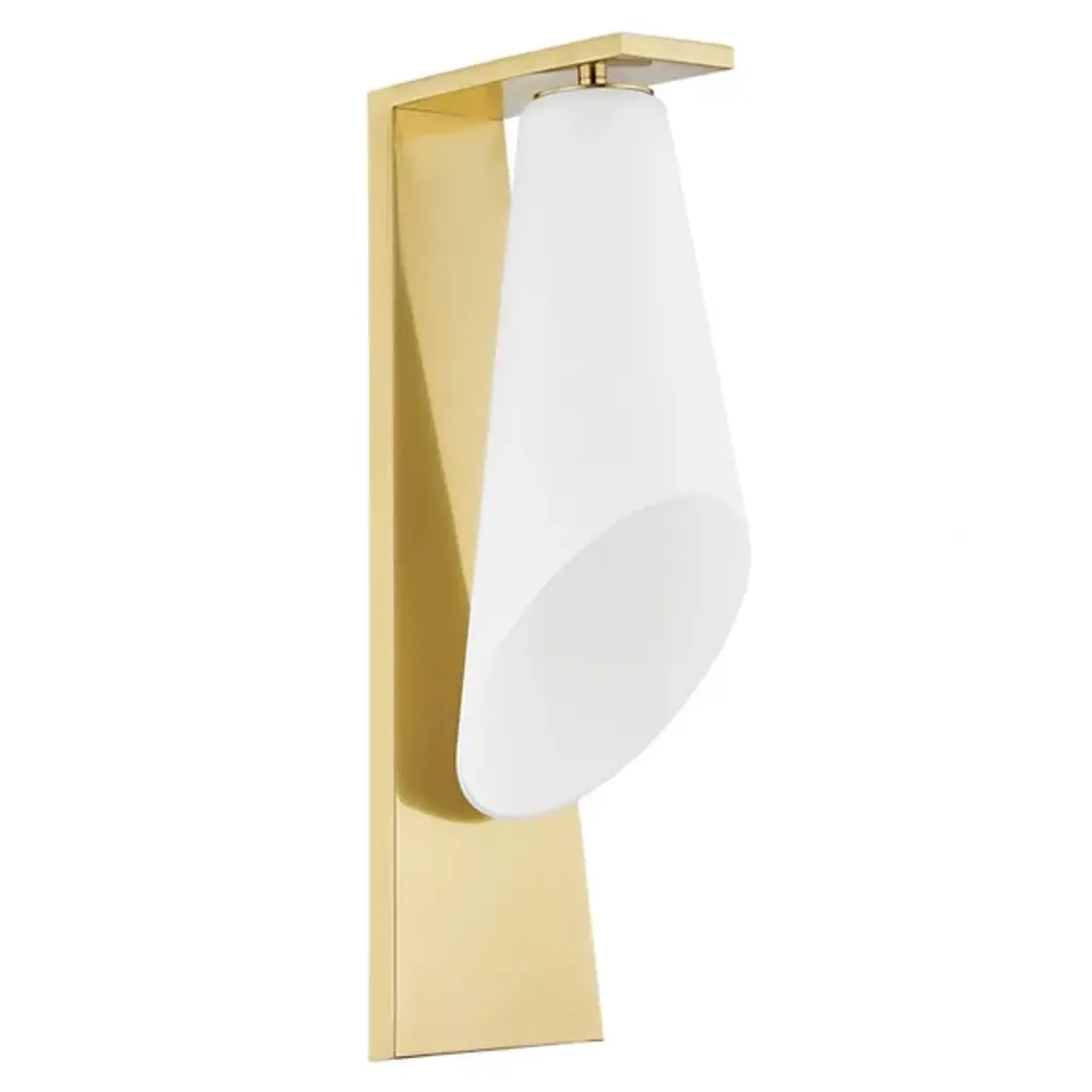 The Andros Wall Sconce from Hudson Valley Lighting introduces architectural interest through its distinctive bias-cut shade. The conical glass diffuser extends from an L-shaped backplate, creating an elliptical opening that directs light outward. The angular metalwork and curved shade play off each other to produce a sconce that's both functional and expressive. The glass appears to float from its minimal mount, while the oblique angle of the shade's opening produces intriguing light patterns that enhance any wall space.