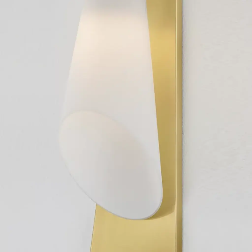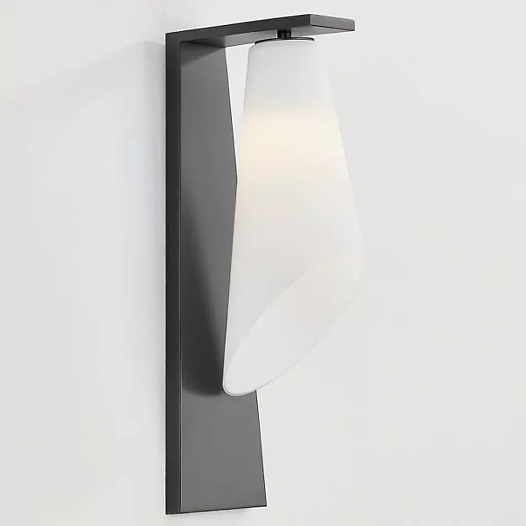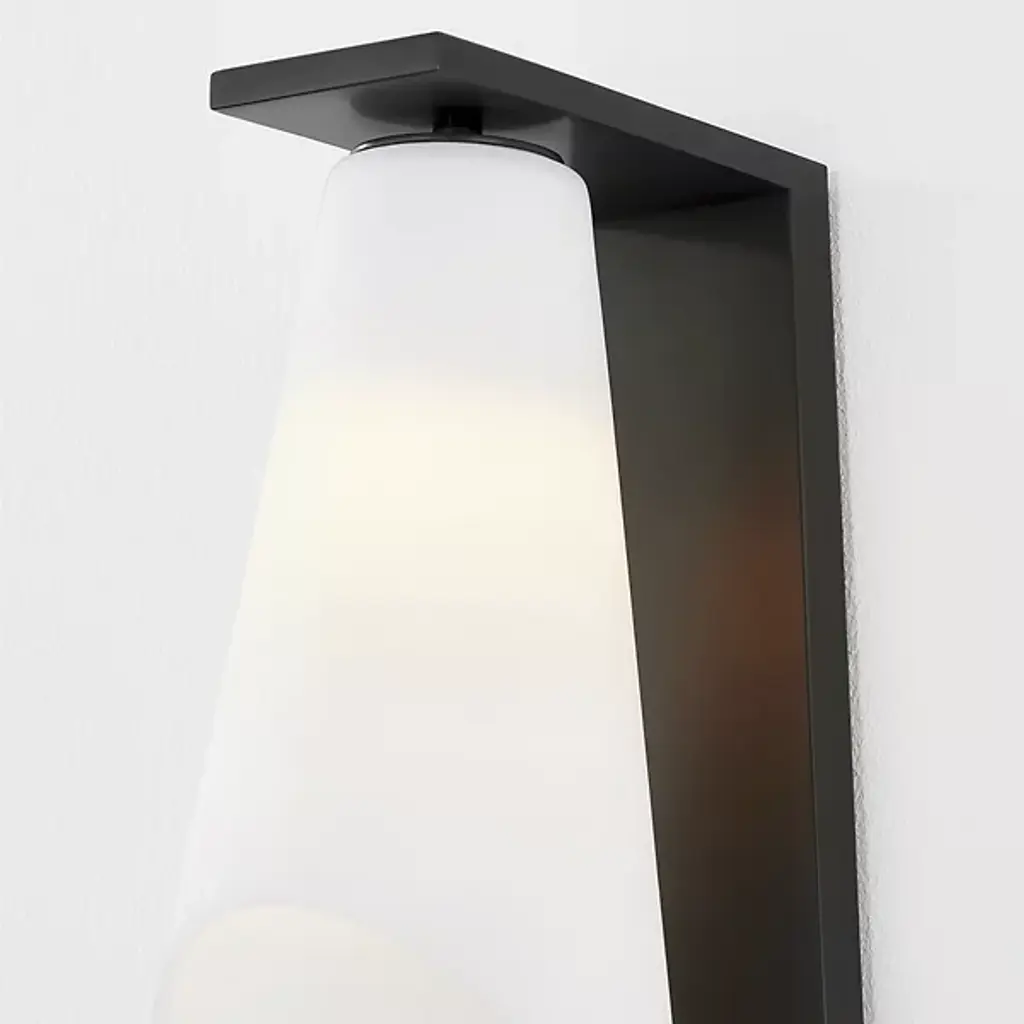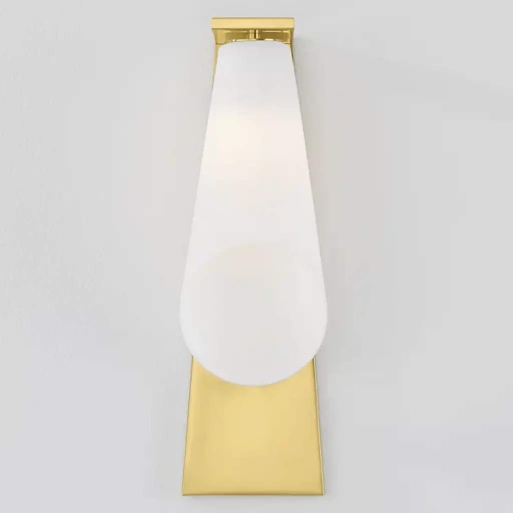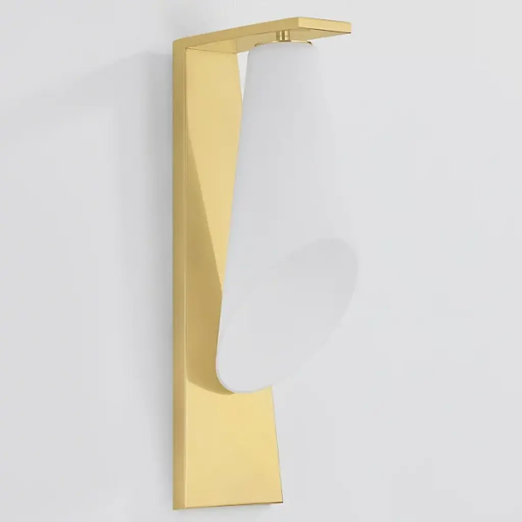 The Andros Wall Sconce from Hudson Valley Lighting introduces architectural interest through its distinctive bias-cut shade. The conical glass diffuser extends from an L-shaped backplate, creating an elliptical opening that directs light outward. The angular metalwork and curved shade play off each other to produce a sconce that's both functional and expressive. The glass appears to float from its minimal mount, while the oblique angle of the shade's opening produces intriguing light patterns that enhance any wall space.