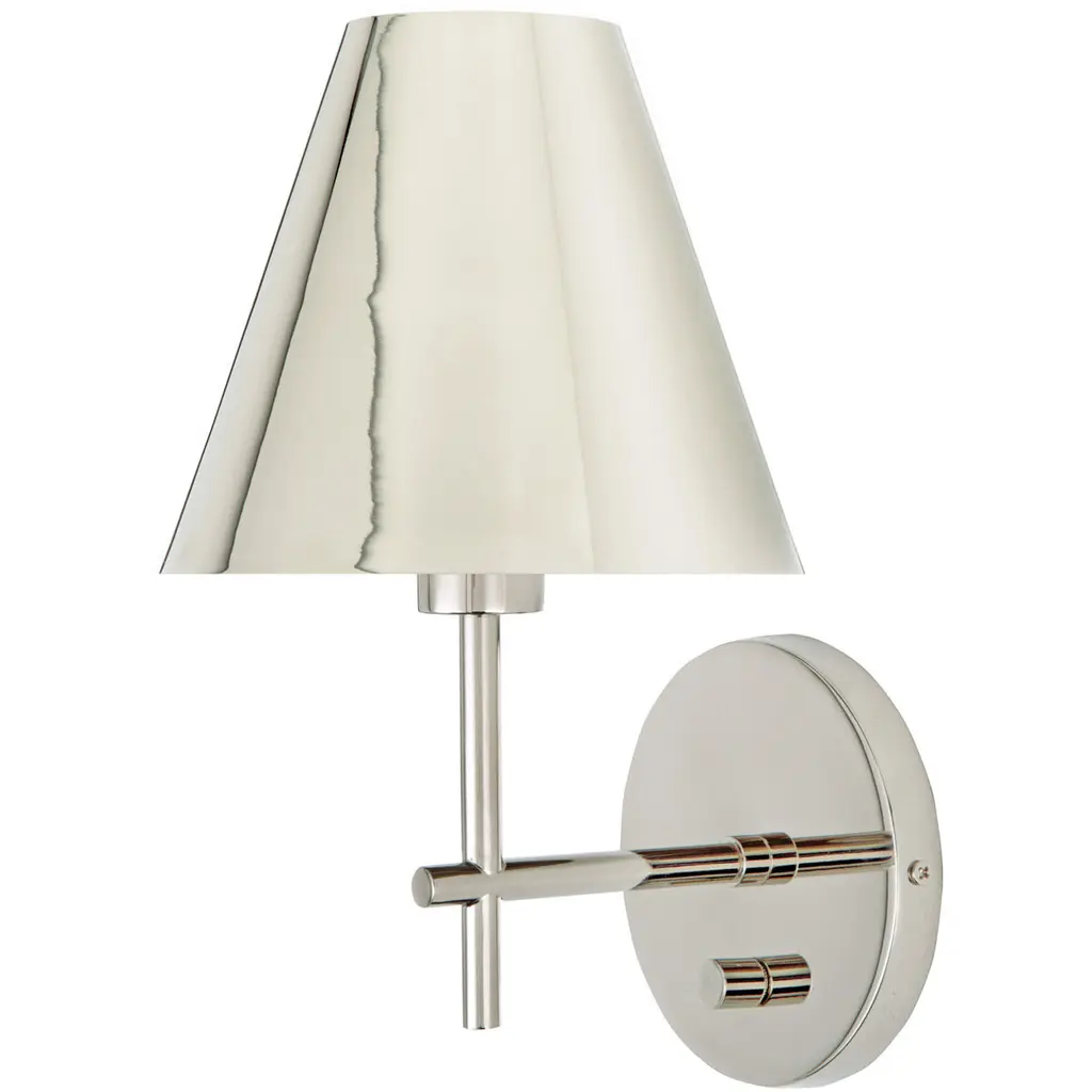 A standout addition to any space, this sconce is enhanced by a riveted shade and the geometric lines of its backplate. Hardwired.