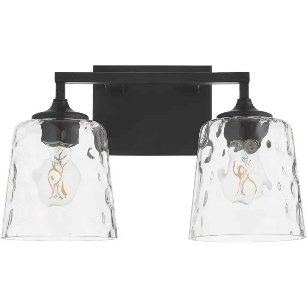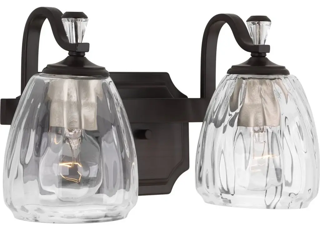 A distinctive collection with casual crystal details. Each fixture in the Anjoux family features variations of complementary designs. Sconces are highlighted by clear water glass shades, while chandeliers are adorned by elegant crystal finials. A flush mount version emulates cascading embers with teardrop crystal accents. Anjoux is a truly versatile lighting collection that can complement a wide range of design spaces. Uses (2) 100-watt medium bulbs (not included). UL Certified: YesETL Certified: No