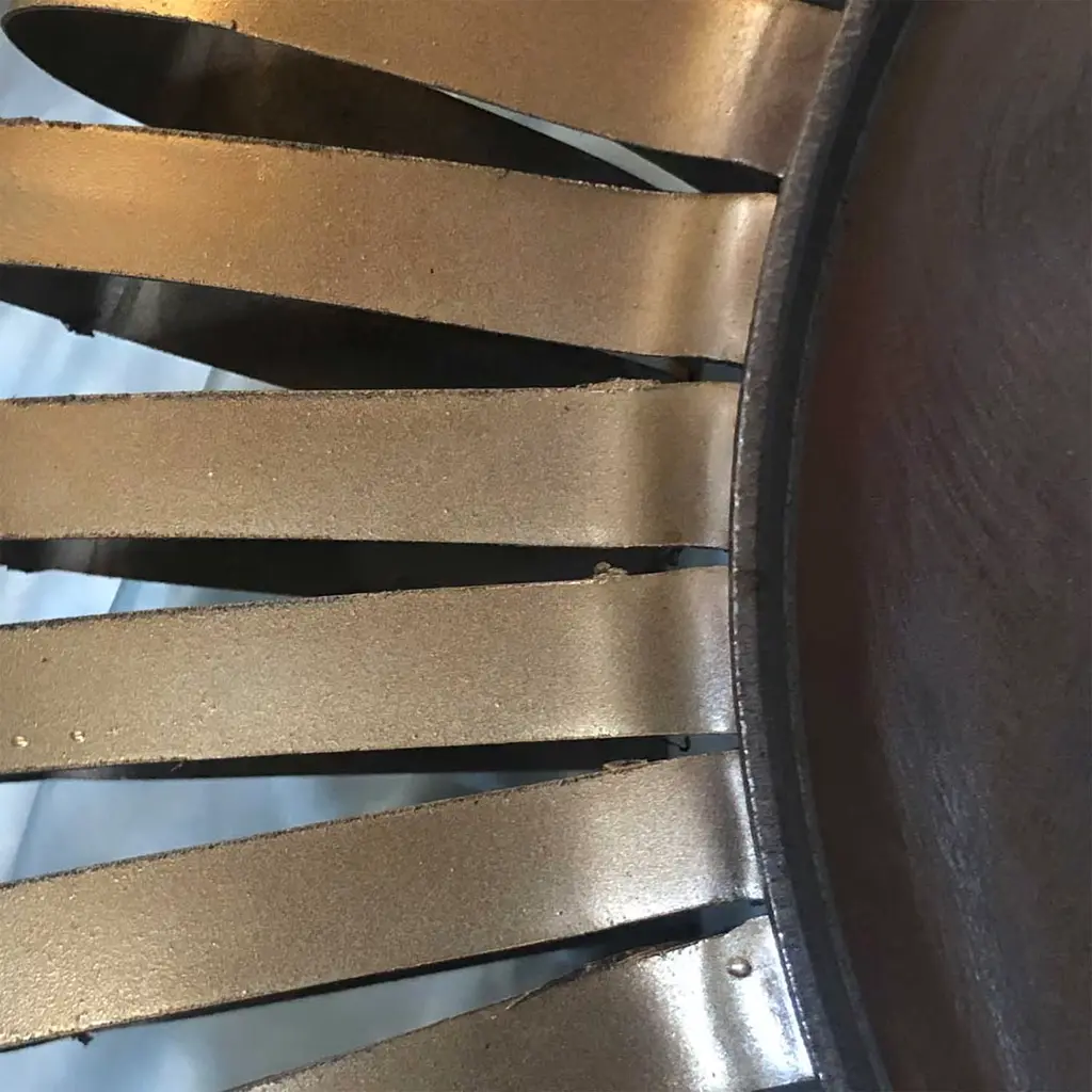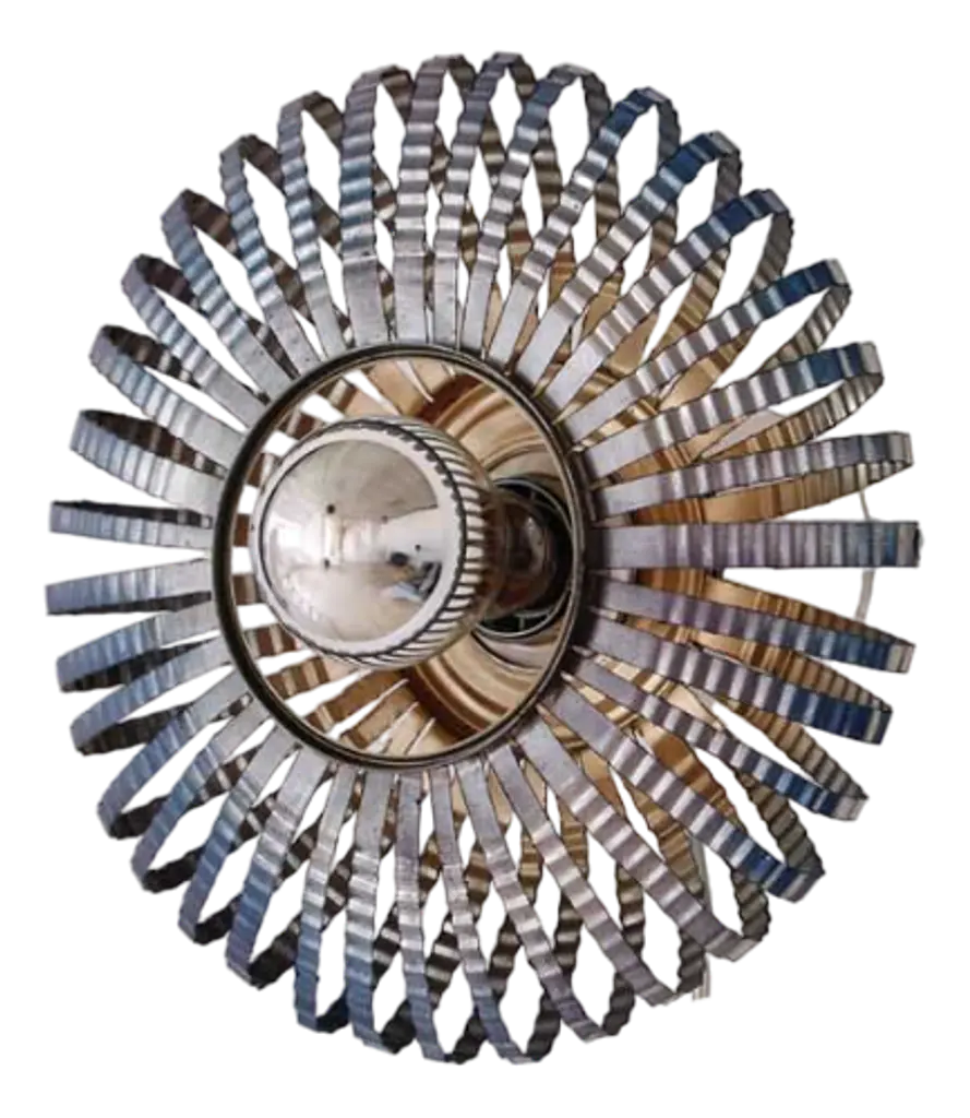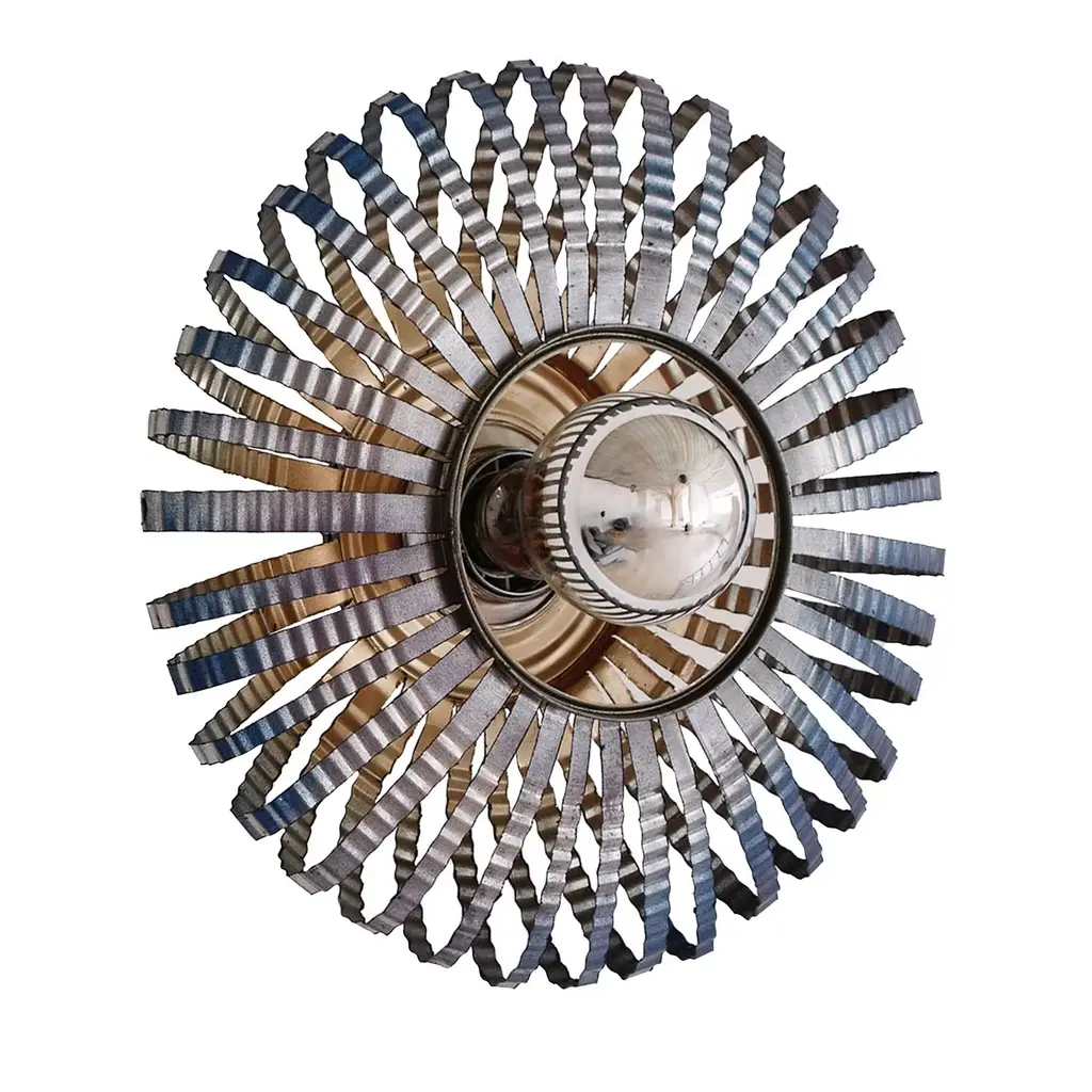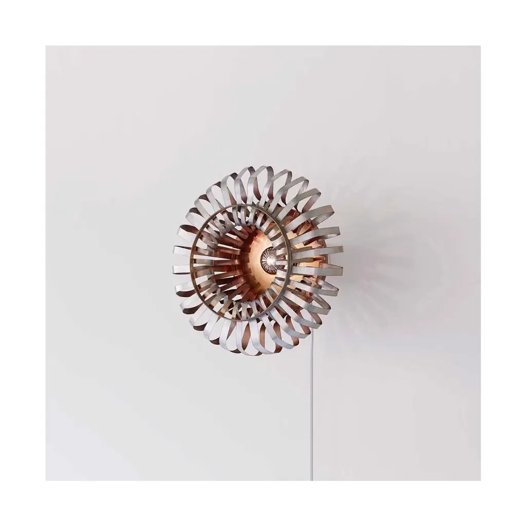 Annerose is an artistic interpretation of the classic lampshade. Providing a magical striped light all around it. Made out of recycled and repurposed metal objects like food and paint cans, this ceiling light showcases a captivating shade composed of a silver and copper exterior and copper and gold interior color. Annerose is entirely cut and assembled by hand, each object is a unique artisanal piece. Delivered with a white simple twist wall fixture, cable and warm tone silver shaded lightbulb.