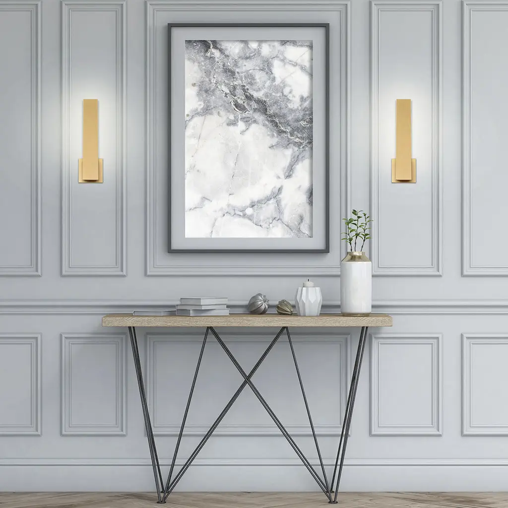 A flat rectangular panel extrudes from a backplate made of the same anodized metal for a seamless, unified look. The flat form, sitting vertically, creates a structural design that perfectly accentuates minimalist spaces.