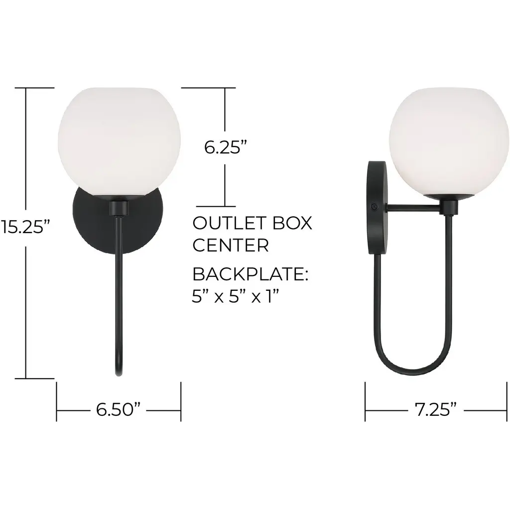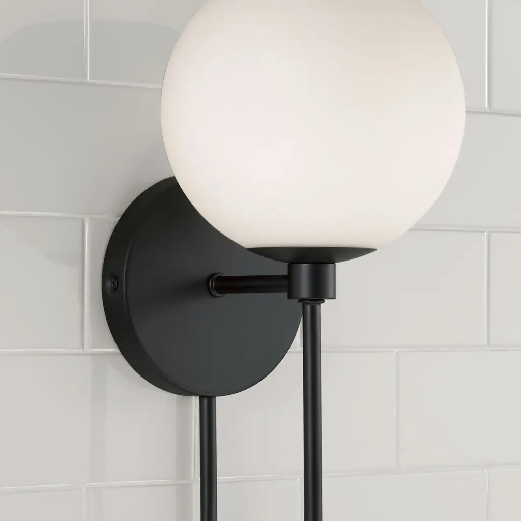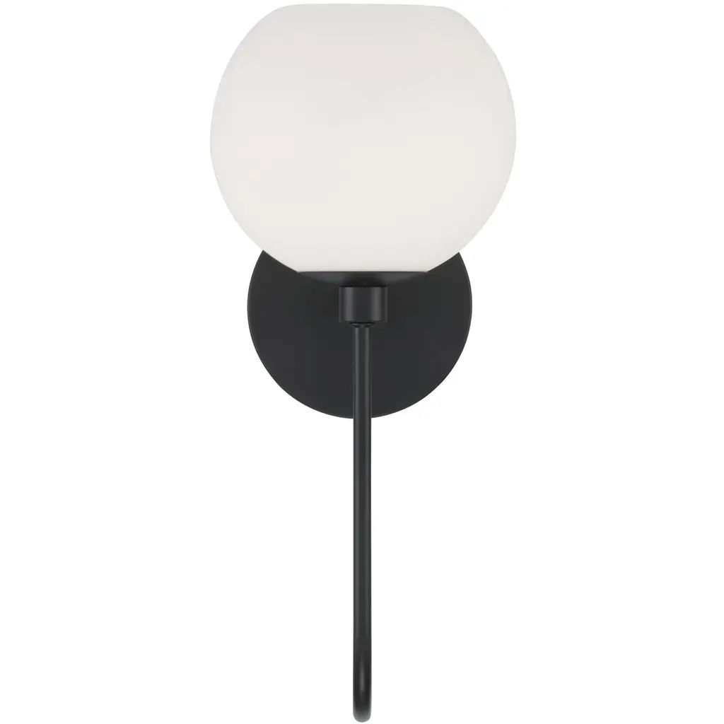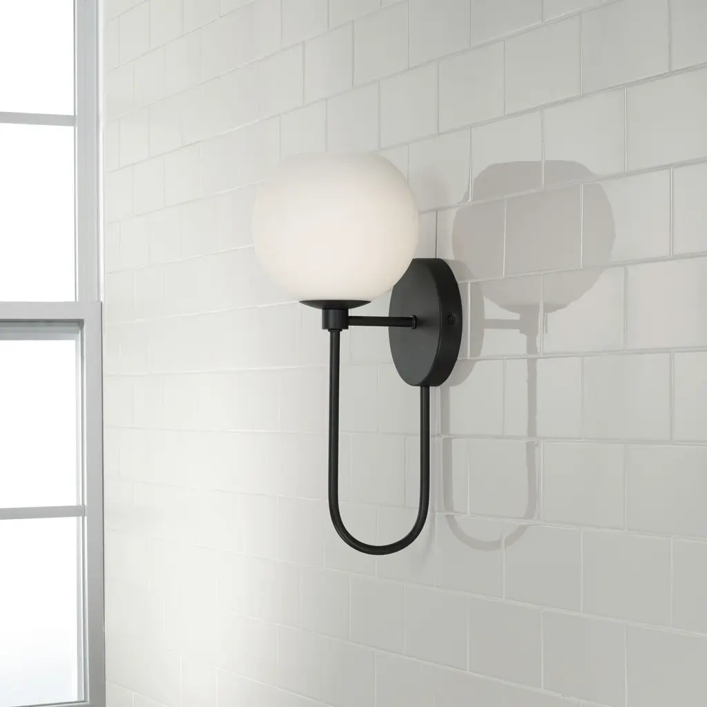 Playful forms meet sophisticated style in the Ansley 1-Light Sconce for HomePlace. The curved stem draws the eye toward the Soft White glass globe shade, while the Matte Black finish creates contrast.