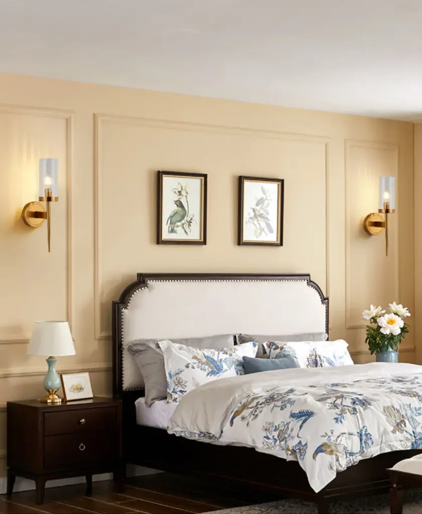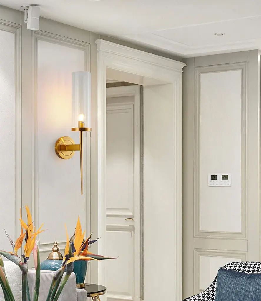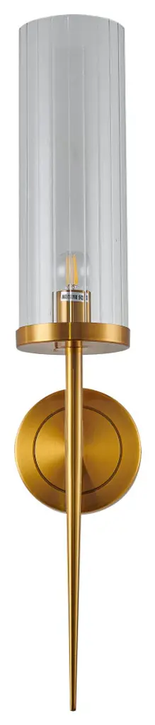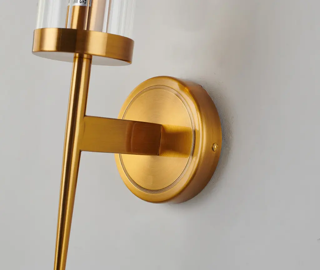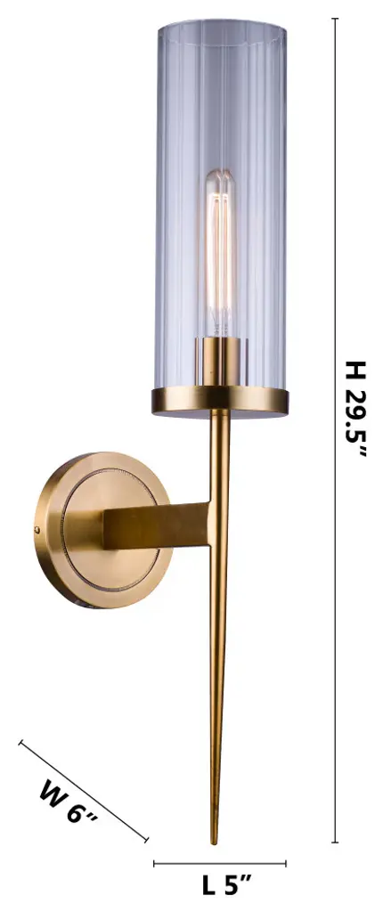This wall sconce is in an antique brass finish. The frame is made out of iron with a clear cylinder glass shade. Exquisite wall sconce can be used in modern vanities, hallways, and more.Lighting Information:-Bulb type: E12-Max wattage: 40-Number of bulbs: 1-Bulbs not included