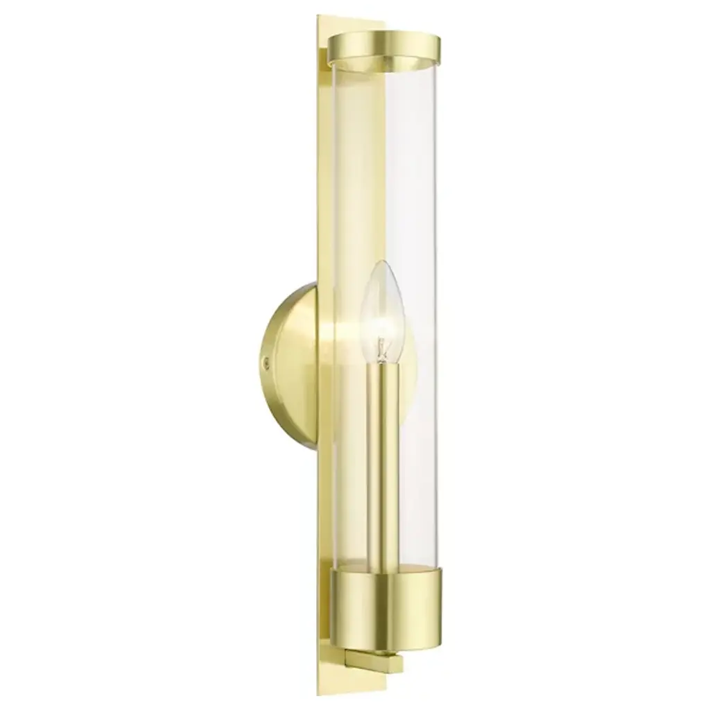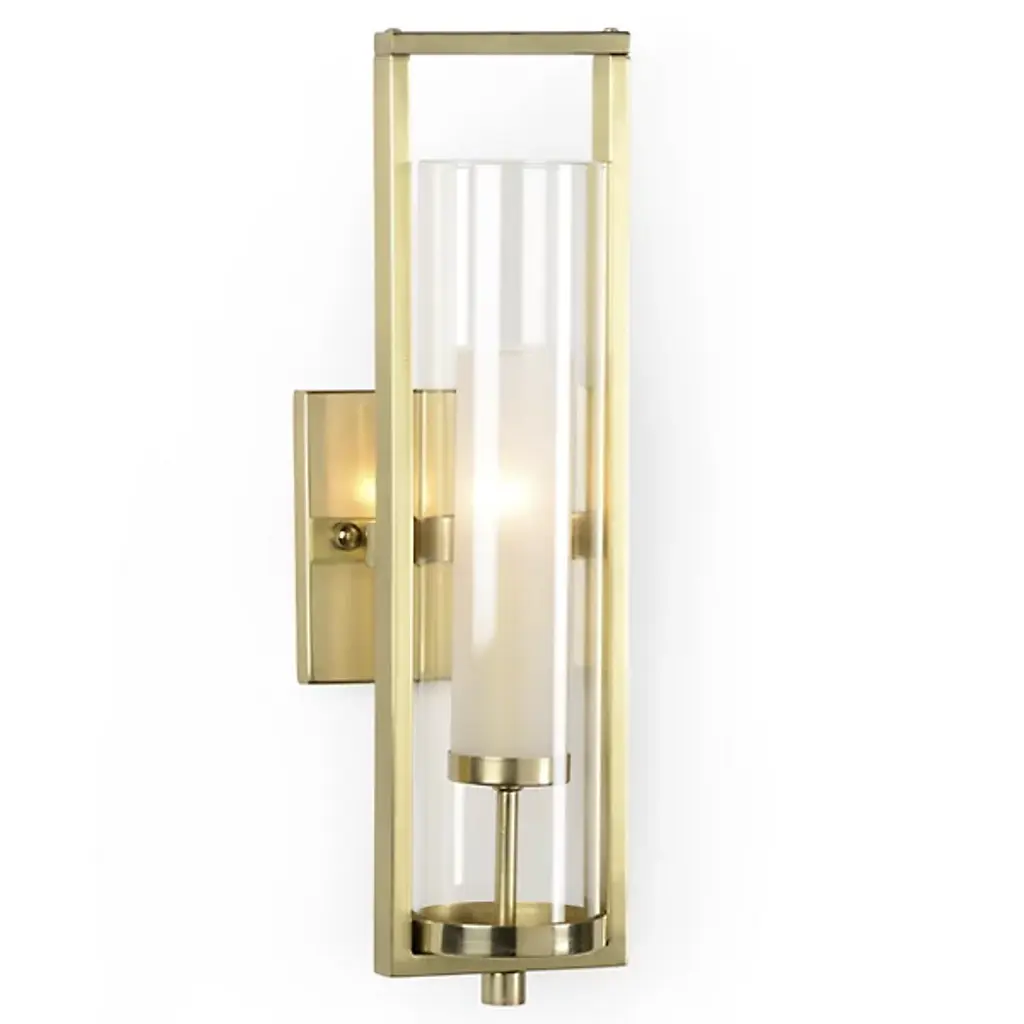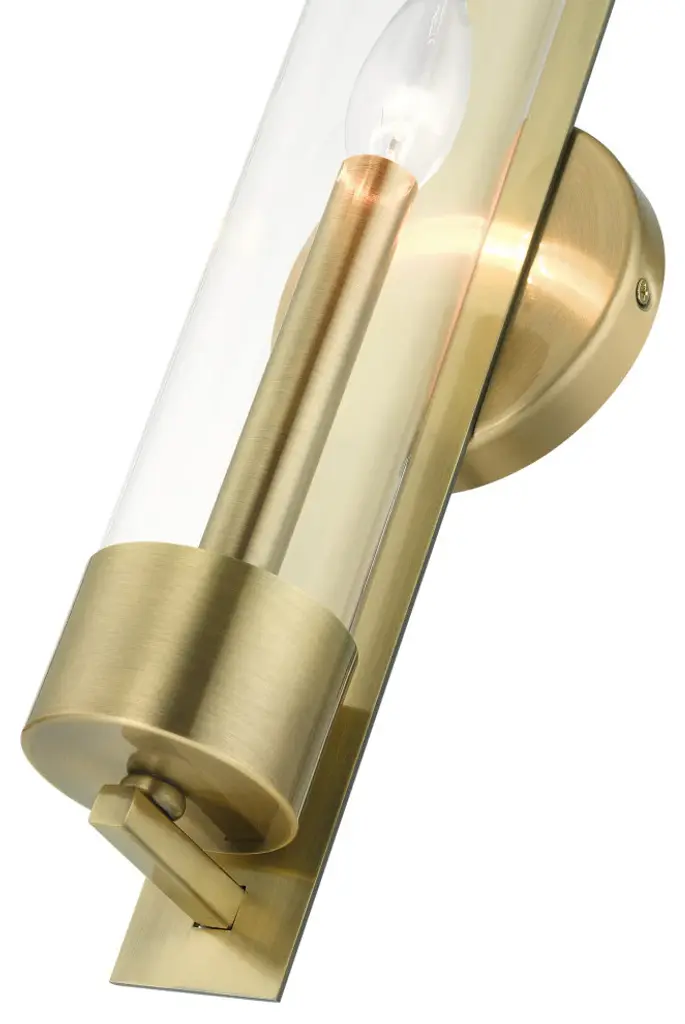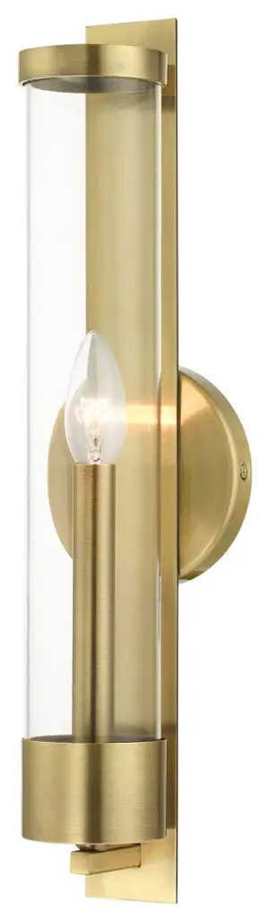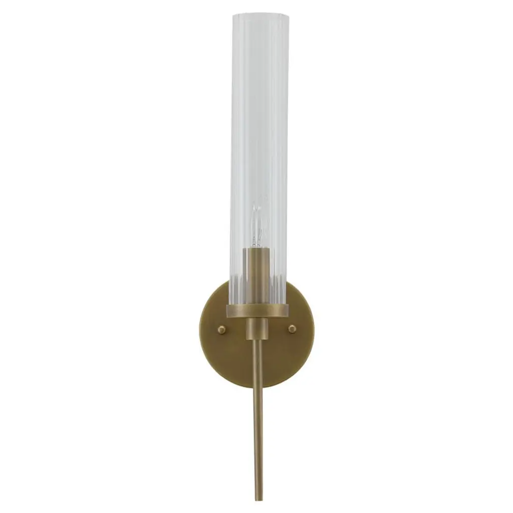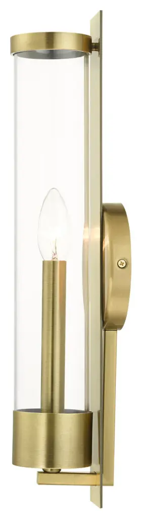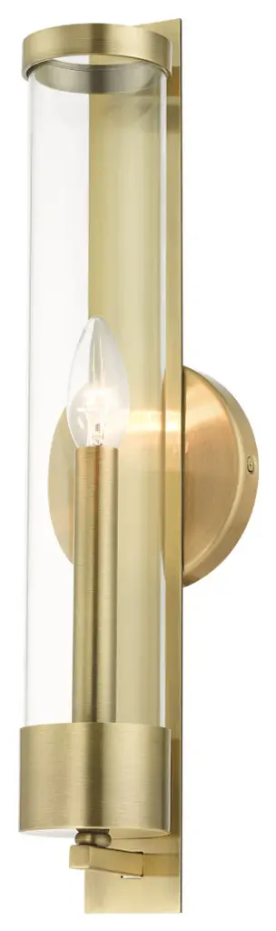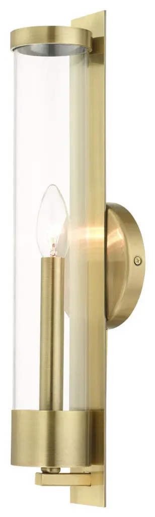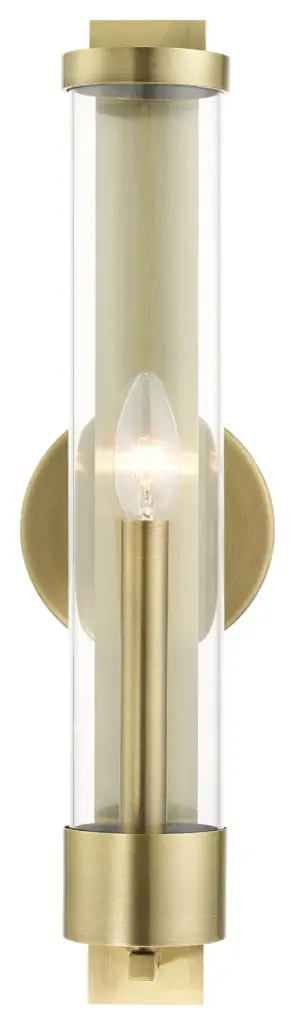 A glass cylinder shines with light as steel straps and a rounded back plate ground this Castleton sconce with a modern style. The clean, transitional, versatile sleek look will add romantic light while maintaining your minimalist interior. This beautiful sconce comes in an antique brass finish. With its easy installation and low upkeep requirements, this light will not disappoint.Bulb Type: Candelabra BaseNumber of Bulbs: 1Bulbs Included?: NoUL Listed: ULBulb Wattage: 60Hardwire or Plug: Hardwire