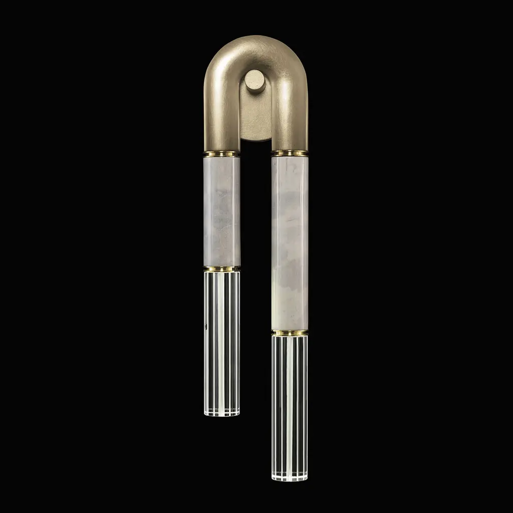 Right-facing sconce featuring soft curves and the inclusion of metals carefully handcrafted to transition from parchment to magnificent glass, culminating in a stunning beam of light. Available in a wide range of exquisite finishes, including our five sta