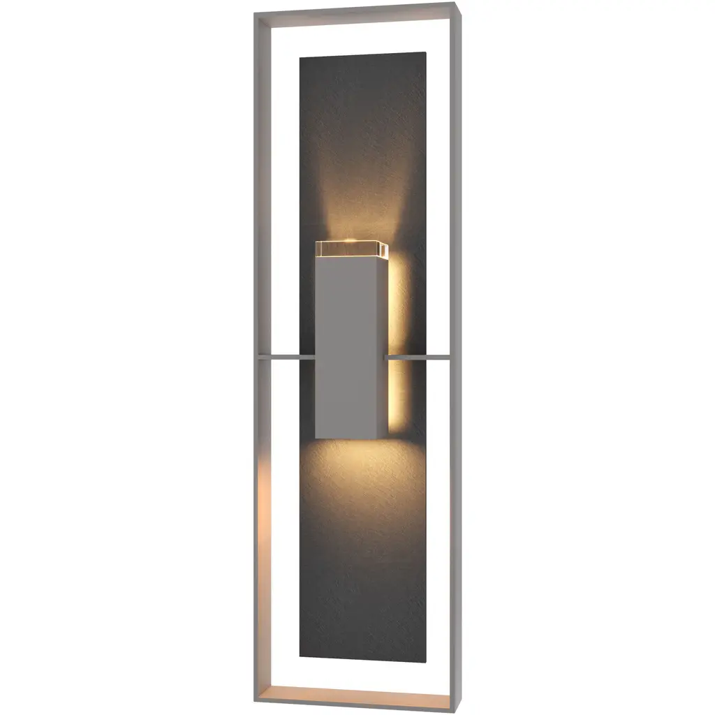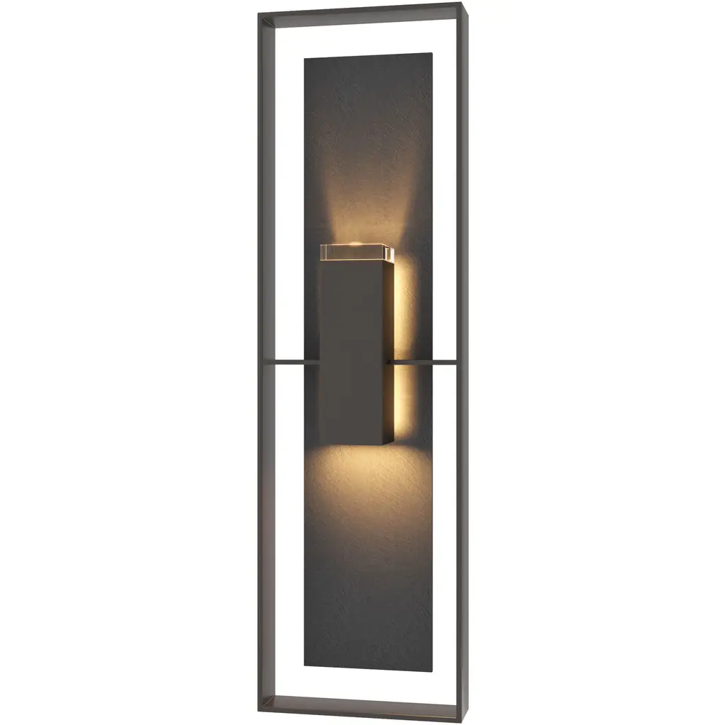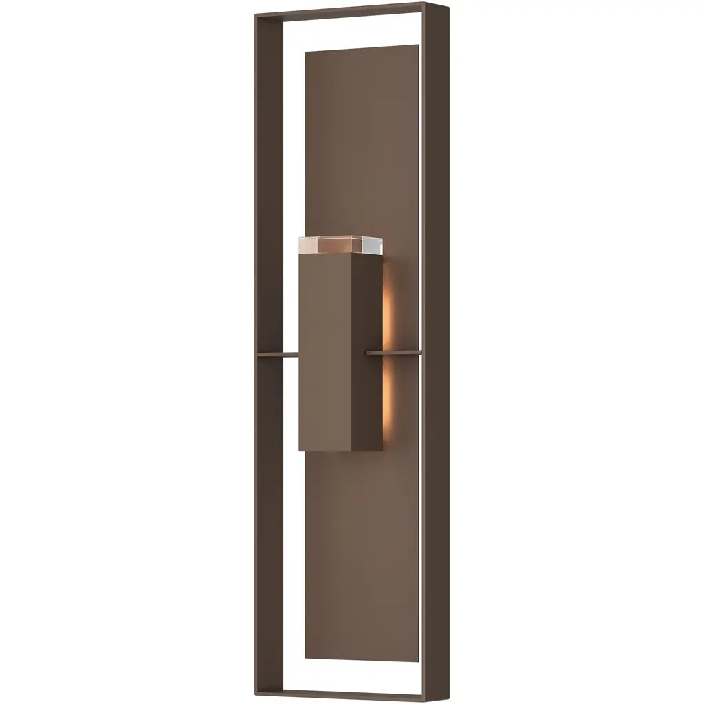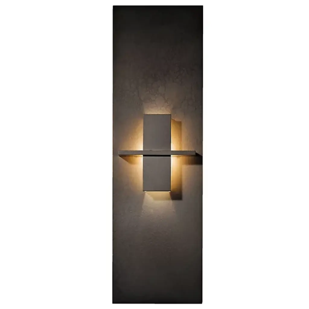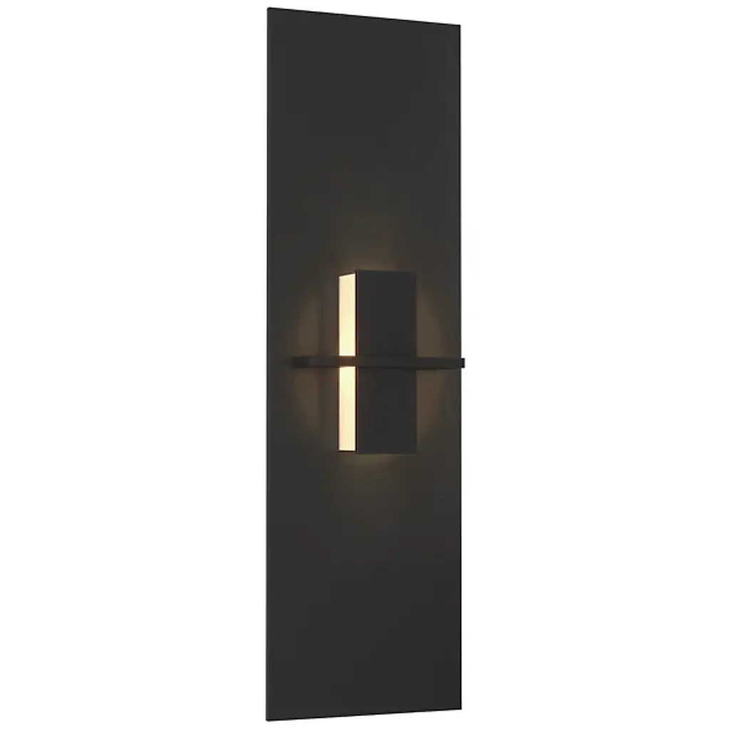 Like all the sconces in the Aperture line, the Hubbardton Forge Aperture Vertical Sconce features accent light, shadow and the distressed textures of hand-forged wrought iron. The transluscent art glass shade is available in either White (for a brighter glow) or topaz (for richer, more golden light). It is tucked behind a small rectangle of wrought iron to keep the light glowing in a wash up, down and across the lengthy textured back panel. Available in a number of attractive finishes. ADA compliant.