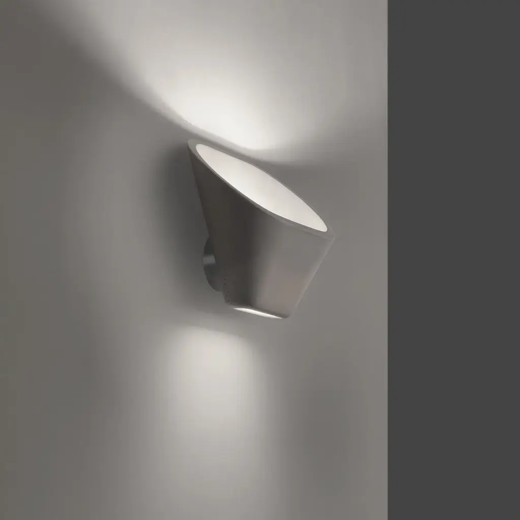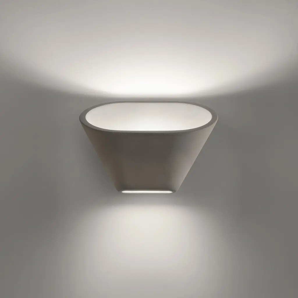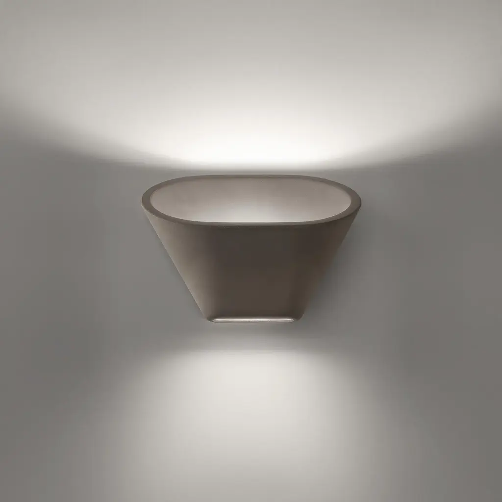 Aplomb takes raw cement—pigmented, hand-poured, left agreeably grainy—and turns it into a wall light that feels more like a small architectural feature than a fixture. Lucidi + Pevere angle the mouth of the sconce upward, so most of the glow slides across wall and ceiling in a broad wash while a narrower beam slips through the lower lip to sketch a soft underline. The result is quiet drama: no glare, just layered light and a subtle halo that changes with nighttime traffic or passing clouds. Choose grey for honest concrete, warm brown for a clay-like note, or crisp white when you want the form to melt into plaster—each hue is mixed into the cement itself, not painted on. Pair two in a hallway, flank a mantel, or use one beside the bed; wherever it lands, the Aplomb speaks fluent minimalism in the solid language of concrete.