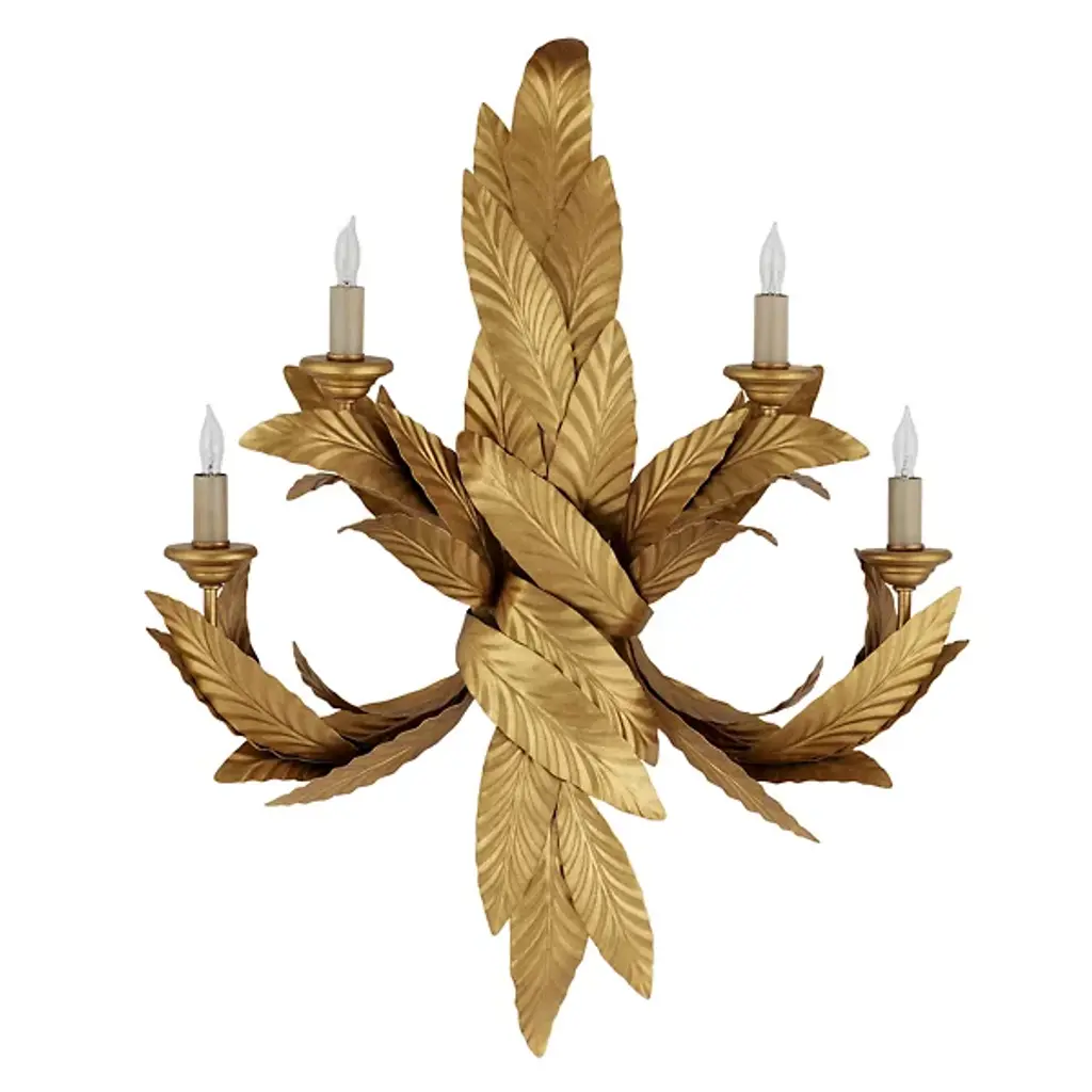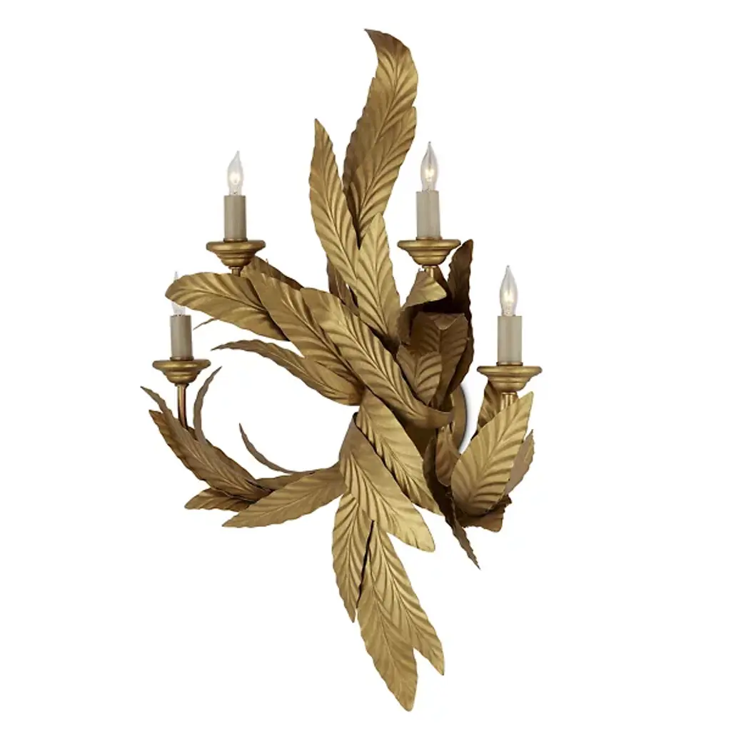The Apollo Wall Sconce from Currey & Company expands its surroundings with a glittering, open display of ambiance. A layered fixture extending two tiers of lamping from a hidden wall mount, it sends up arcing arms covered in stylized wrought-iron leaves to create an intricate work of art. Each arm ends in open lamping, extending a short, candelabra-style lamping upward, extending a bright, broad-reaching light in all directions that reflects off the surface of each leaf, burnishing its surroundings with a glittering glow.