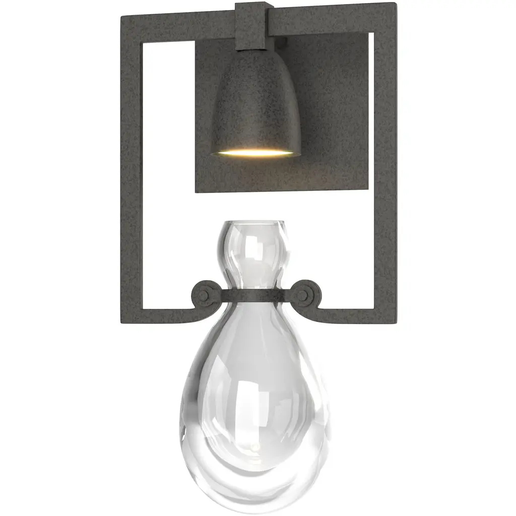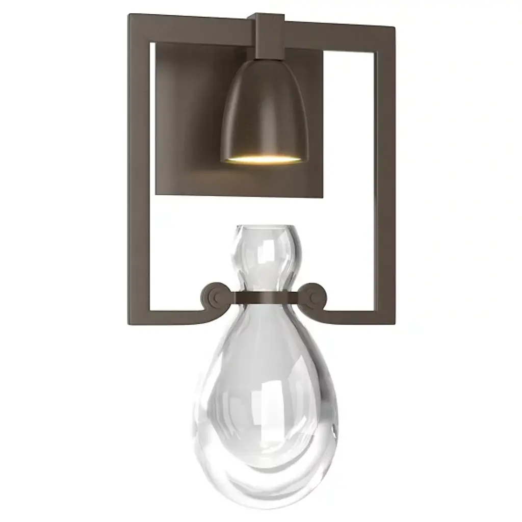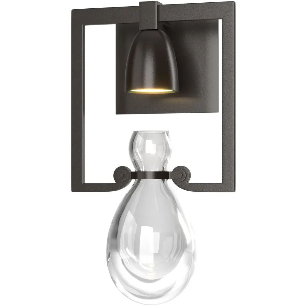 Giving age old apothecary-inspired design a futuristic update. The Apothecary Wall Sconce by Hubbardton Forge features a beautiful, hand-blown hourglass-shaped structure that is held in mid-air by a rectangular frame. An inverted bowl-shaped pendant with a concealed light source is hooked to the top of the frame. When illuminated, the light trickles onto the glass structure and is reflected to create an intriguing visual experience. Suspended from a square backplate, this fixture gives an artful, modern flair to living spaces, entryways, hallways and bedrooms.
