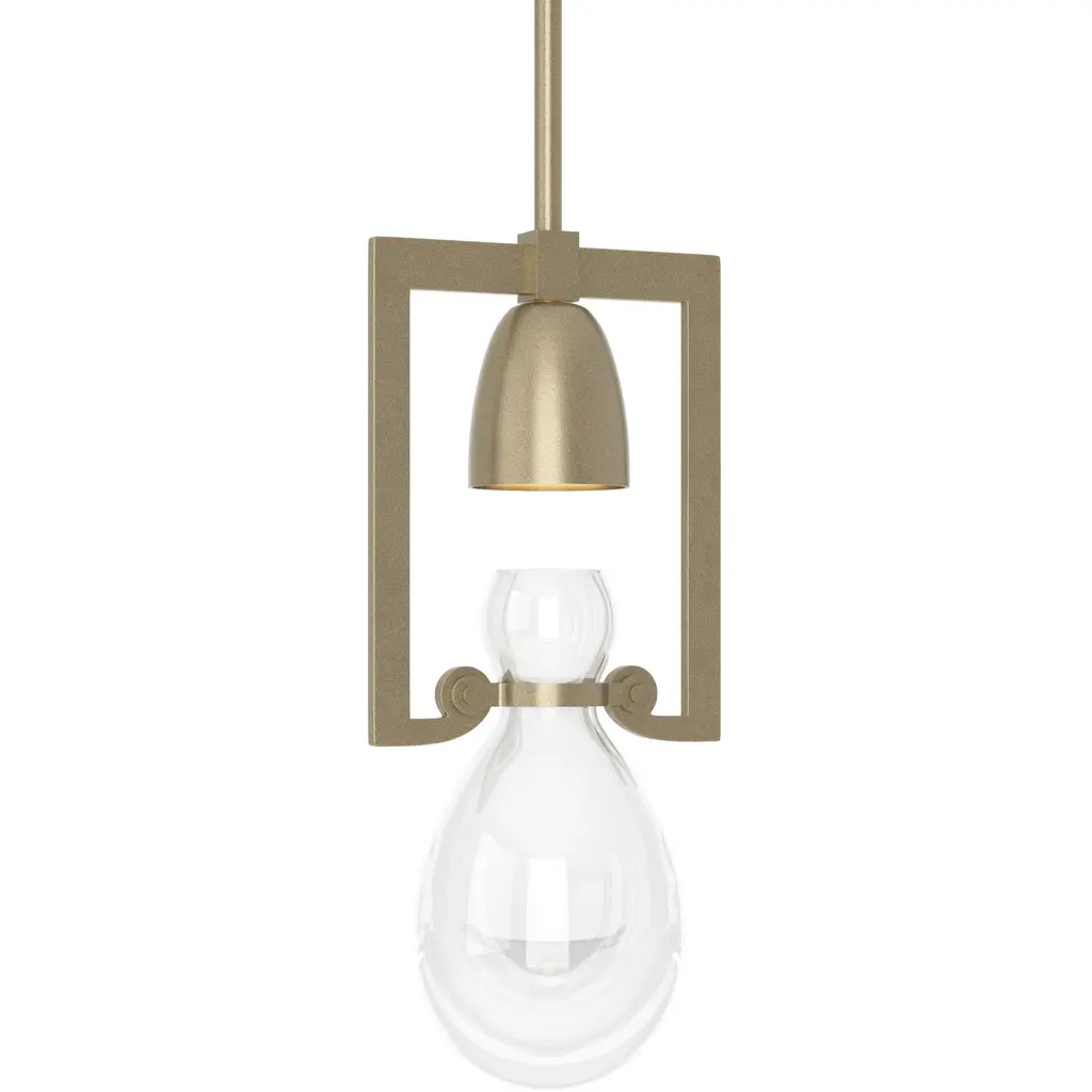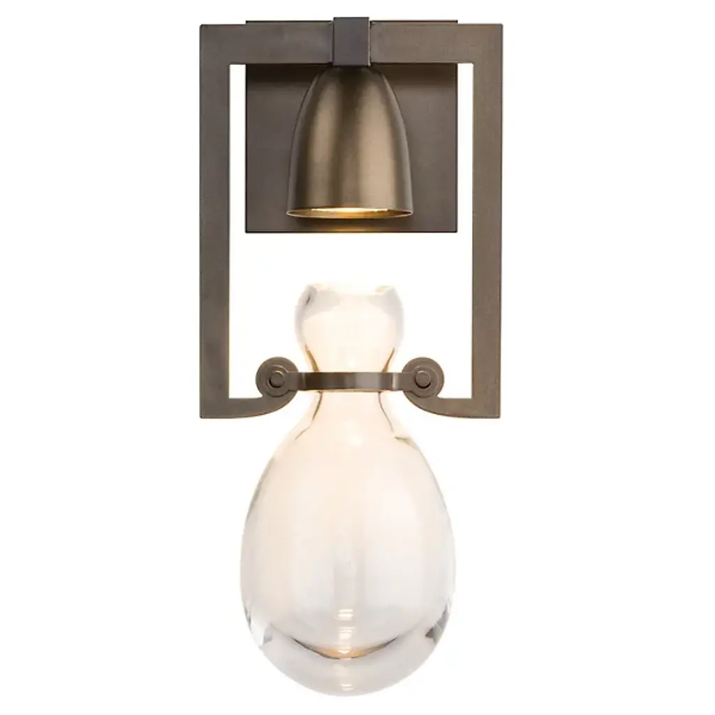 Giving age old apothecary-inspired design a futuristic update. The Apothecary Wall Sconce by Hubbardton Forge features a beautiful, hand-blown hourglass-shaped structure that is held in mid-air by a rectangular frame. An inverted bowl-shaped pendant with a concealed light source is hooked to the top of the frame. When illuminated, the light trickles onto the glass structure and is reflected to create an intriguing visual experience. Suspended from a square backplate, this fixture gives an artful, modern flair to living spaces, entryways, hallways and bedrooms.