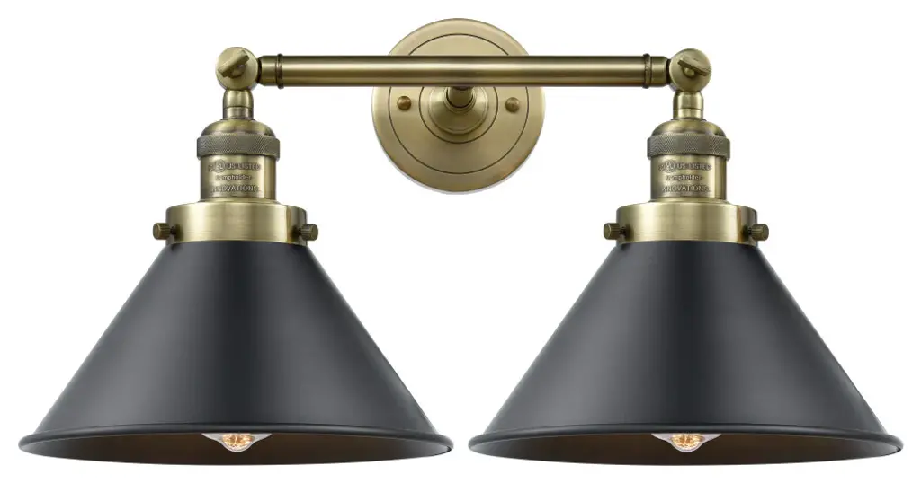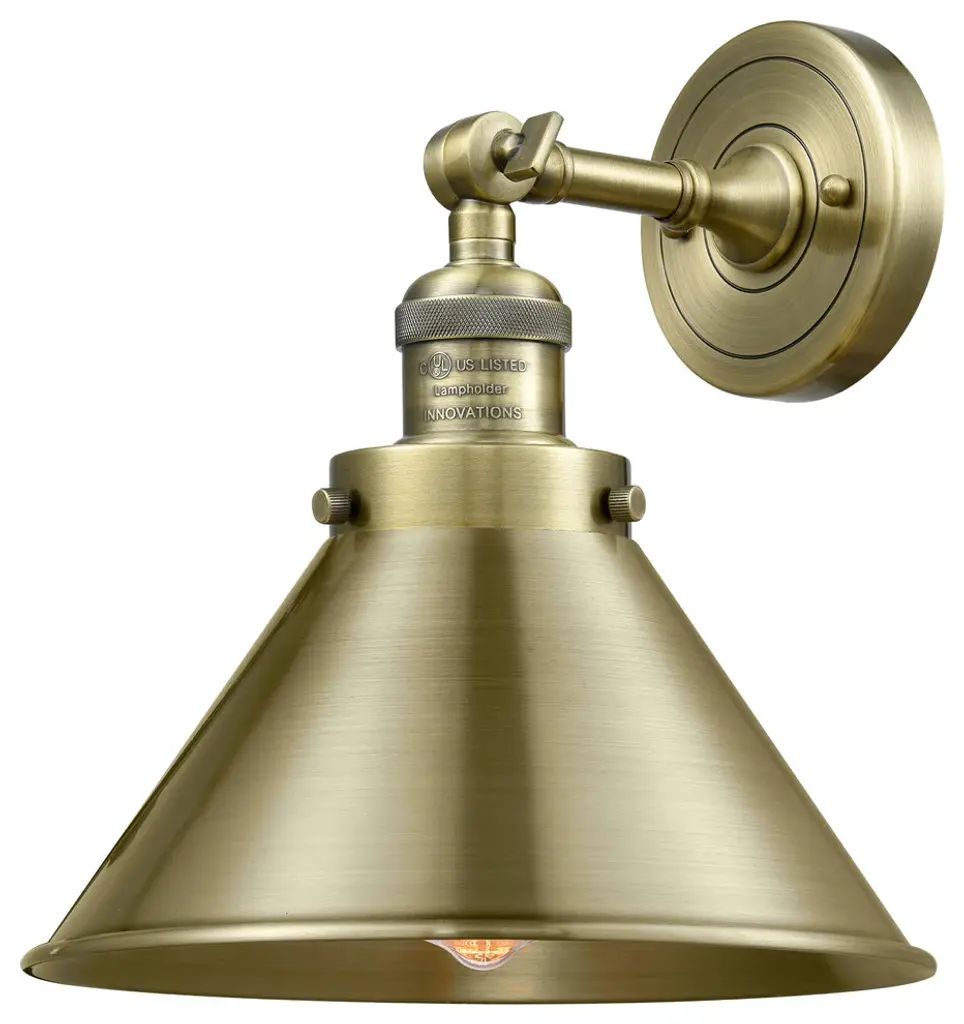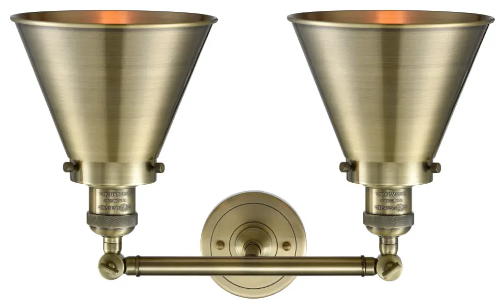 One of our largest and original collections, the Franklin Restoration is made up of a vast selection of heavy metal finishes and a large array of metal and glass shades that bring a touch of industrial into your home.Features:Solid brass 180 degree adjustable swivels with internal teeth that lock in at 5 degree intervalsFixture can be hung with bulbs facing up or down as a wall mount4.5 inch 2mm heavy cast backplateThe interior finish of the shade matches the exterior finish of the shadeRated for 100 watt maximum per socketUL/CUL and ETL/CETL damp ratedCompatible with incandescent, LED, fluorescent and halogen bulbsNumber of Bulbs: 2Bulb Wattage: 60Bulb Type: IncandescentBulb Included: NoVoltage: 120Finish: Antique Brass Finish Shade Finish: Antique Brass Shade.