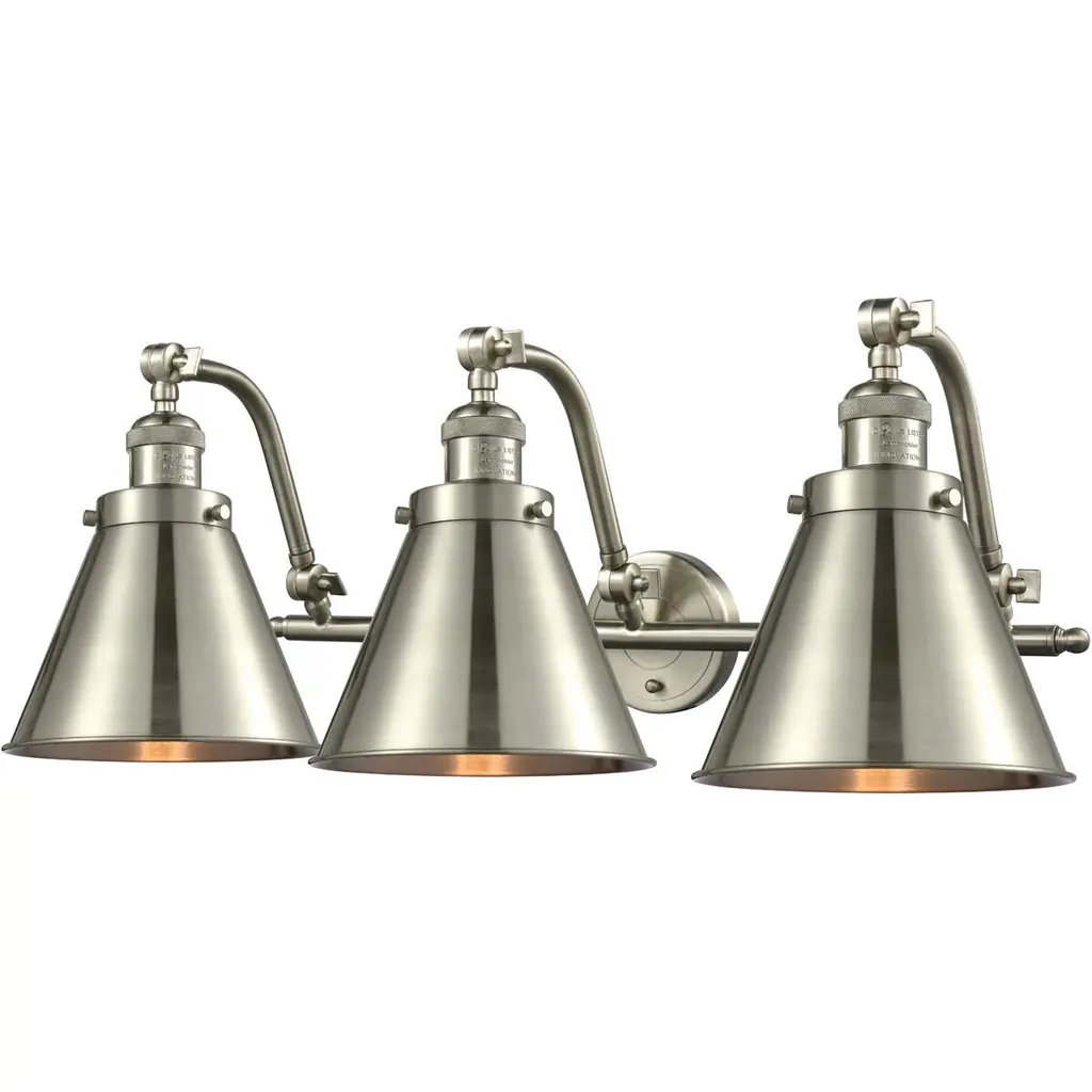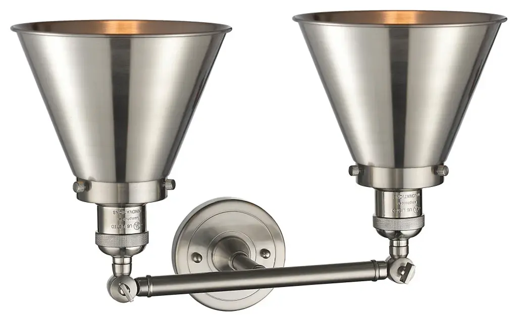 One of our largest and original collections, the Franklin Restoration is made up of a vast selection of heavy metal finishes and a large array of metal and glass shades that bring a touch of industrial into your home.Features:Solid brass 180 degree adjustable swivels with internal teeth that lock in at 5 degree intervalsFixture can be hung with bulbs facing up or down as a wall mount4.5 inch 2mm heavy cast backplateThe interior finish of the shade matches the exterior finish of the shadeRated for 100 watt maximum per socketUL/CUL and ETL/CETL damp ratedCompatible with incandescent, LED, fluorescent and halogen bulbsNumber of Bulbs: 2Bulb Wattage: 60Bulb Type: IncandescentBulb Included: NoVoltage: 120Finish: Brushed Satin Nickel Finish Shade Finish: Brushed Satin Nickel Shade.