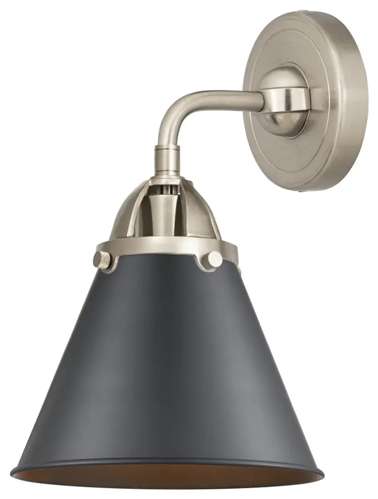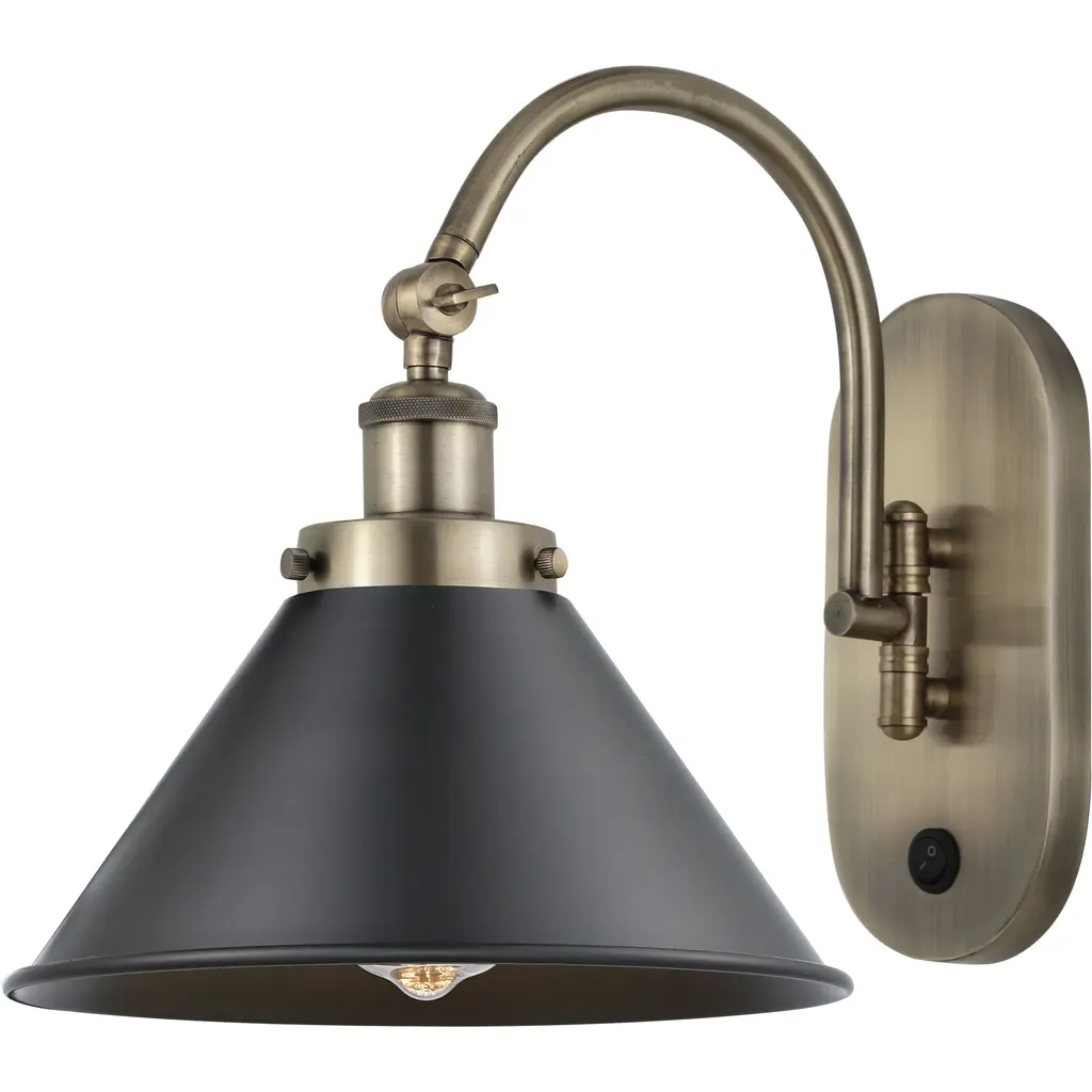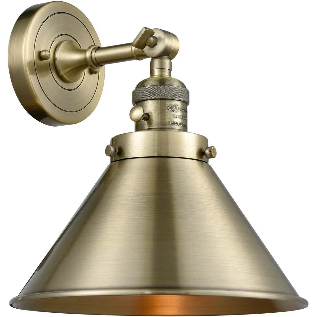 One of our largest and original collections, the Franklin Restoration is made up of a vast selection of heavy metal finishes and a large array of metal and glass shades that bring a touch of industrial into your home.Features:Solid brass 180 degree adjustable swivel with internal teeth that lock in at 5 degree intervals, and engraved cast cup3 way (High-Low-Off) switch included on socketFixture can be hung with bulbs facing up or down as a wall mount, or facing down as a ceiling mountThe interior finish of the shade matches the exterior finish of the shadeDistance from outlet opening to top of fixture 2.25 inchRated for 100 watt maximumUL/CUL and ETL/CETL damp ratedCompatible with incandescent, LED, fluorescent and halogen bulbsNumber of Bulbs: 1Bulb Wattage: 60Bulb Type: IncandescentBulb Included: NoVoltage: 120Finish: Brushed Brass Finish Shade Finish: Matte Black Shade.