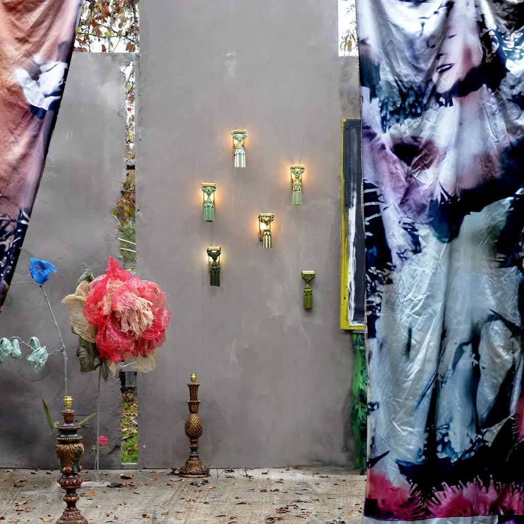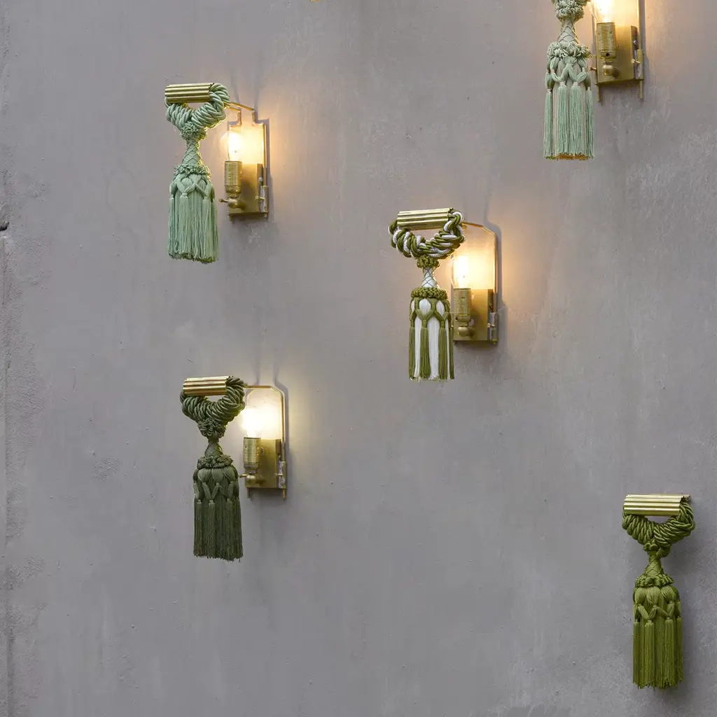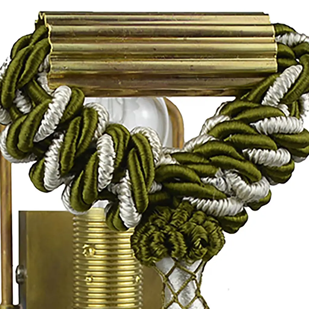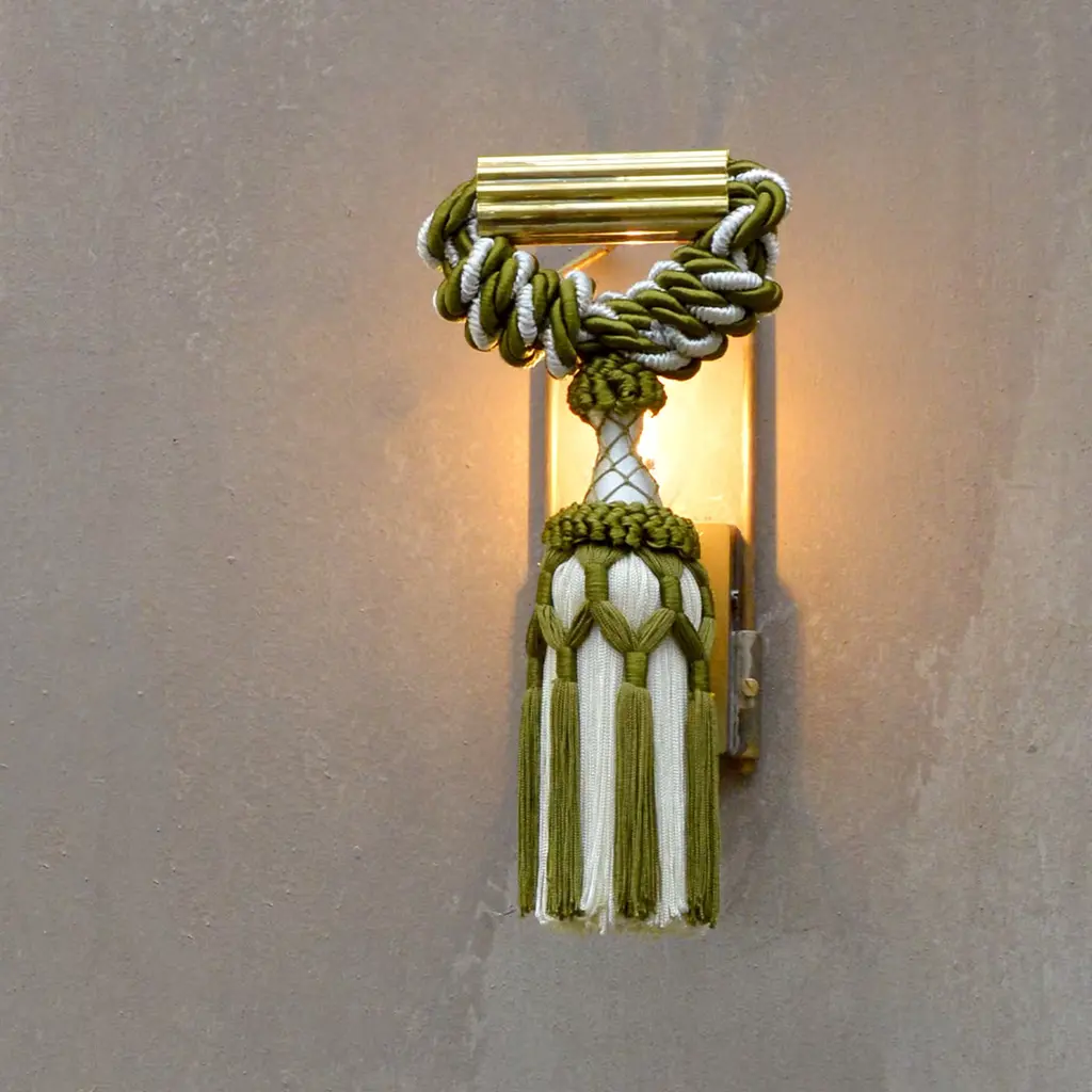 Characterized by a vintage aesthetic flair, this wall lamp is inspired by the French curtain tieback tassel from Scene II of the play "L’incantatrice di serpenti". This unique and glamorous piece of the Applique Changeant Imperiale Collection is mounted on an unpolished brass structure and showcases a superb silk and viscose tassel in a sophisticated combination of white and forest green woven strands. Holds a single E14 light bulb.