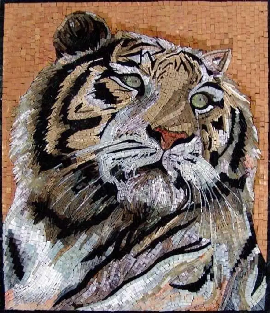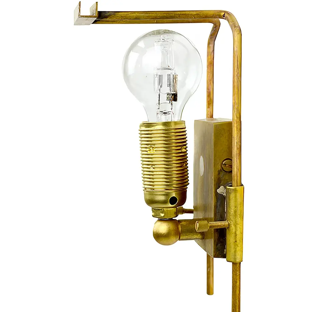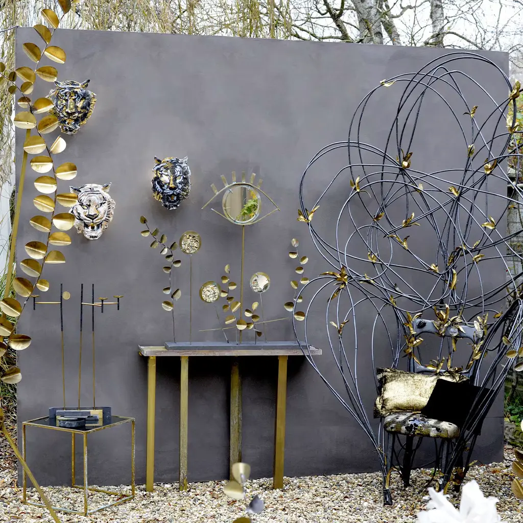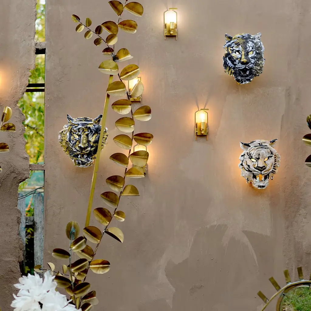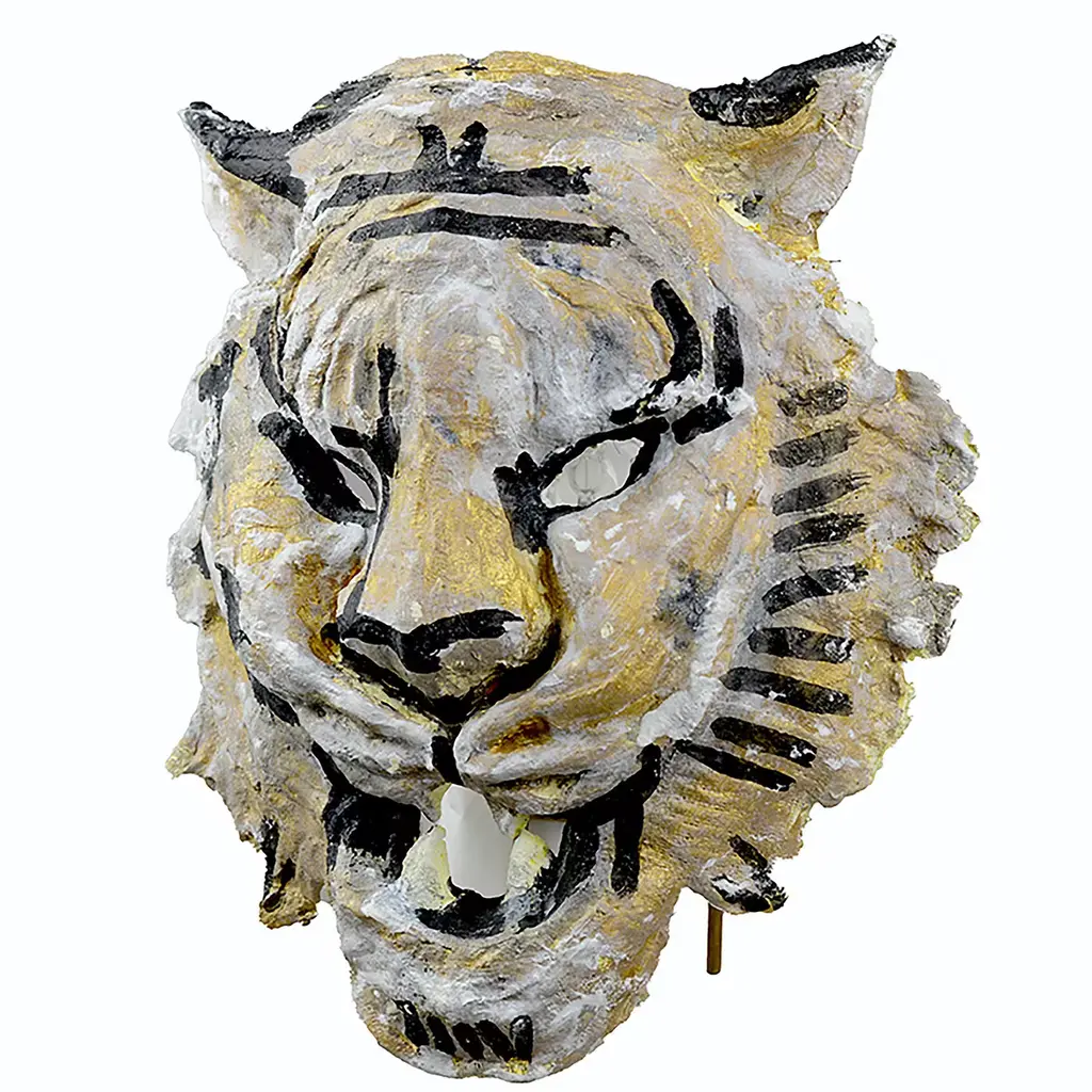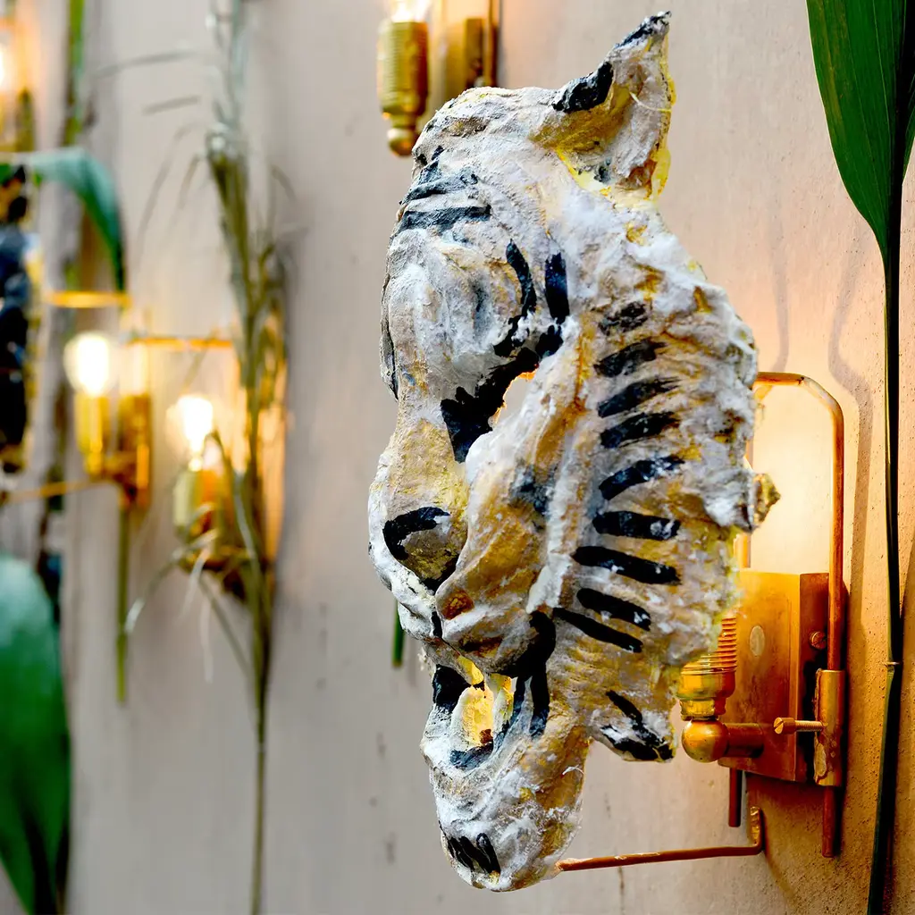 Flawlessly finished with black brushestrokes enhancing the feline profile, this sconce in the shape of a tiger's head makes a sculptural statement thanks to its artisan and highly decorative energy. A faithful reproduction of the theatrical masks from Scene I of “Il grande felino”, this white plaster mask is modeled and painted by hand and mounted on an unpolished brass plate that can be used with the various models from the Changeant Applique collections. Holds a single E14 bulb.