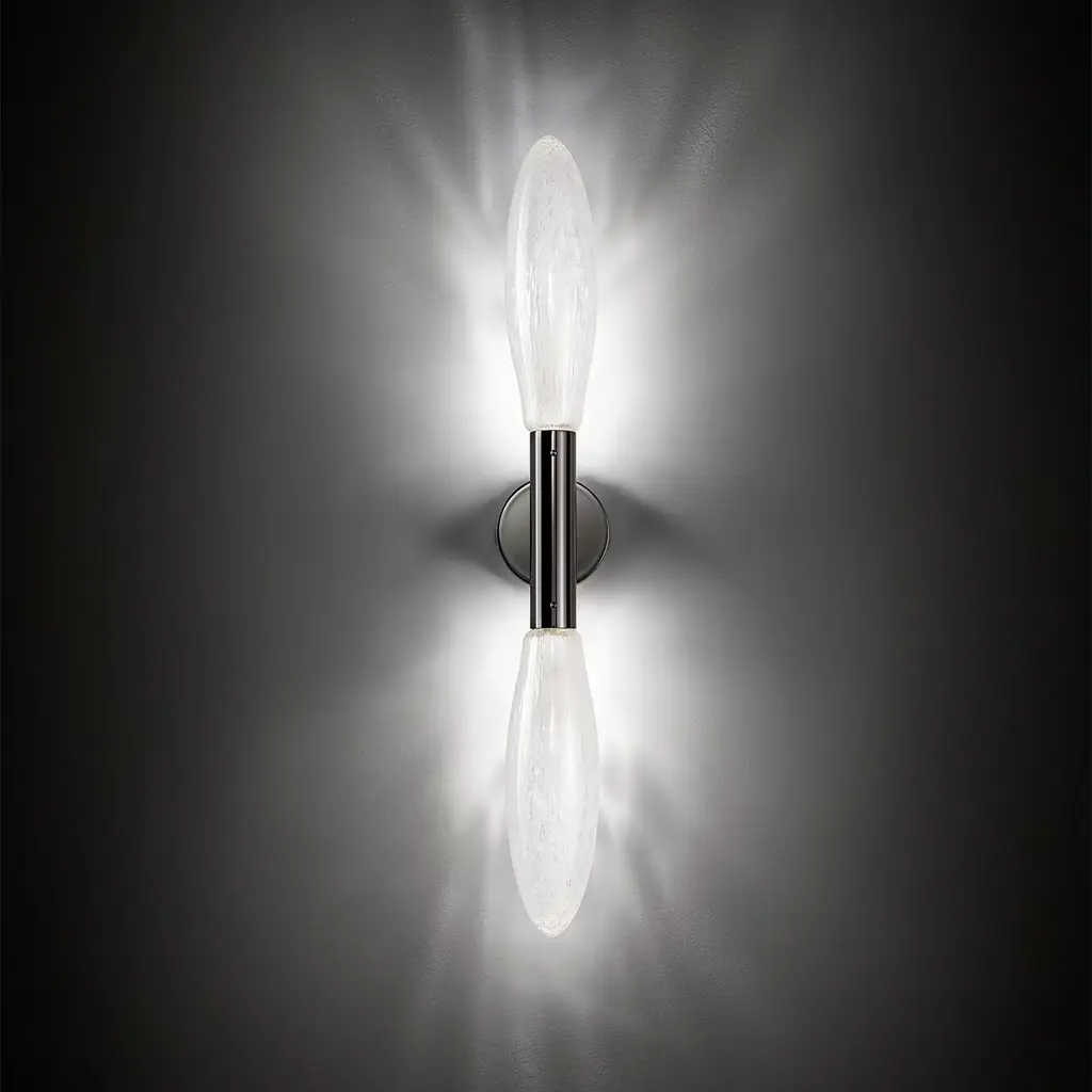 Belonging to a minimalist collection that embodies a distinctive personality, this wall sconce merges elements from both past and future, combining metal and glass. Its metal frame, in a black nickel chic finish, provides the perfect backdrop for the glass diffuser, which infuses the space with a warm ambiance. With its allure, this sconce will enchant the space with its alluring design. Also available in white nickel or matte light gold, please contact the Concierge for more details.