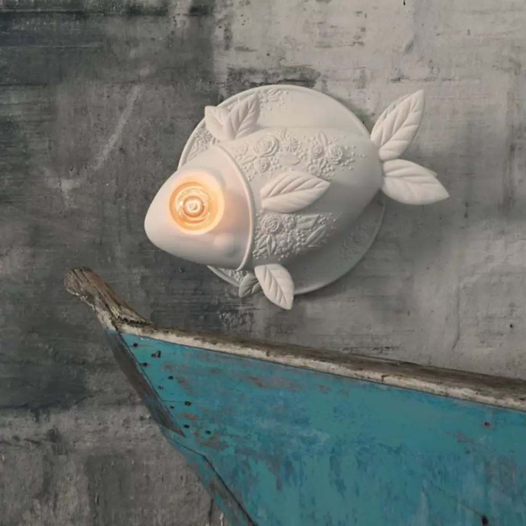 Add a dose of nature to the walls of your modern home with the Aprile Wall Sconce from Karman. Designed by Matteo Ugolini in an attempt to introduce natural forms to human habitats, this piece is made of ceramic throughout and resembles a fish upon a flat disc back. The eye of the fish is made of a crisp LED that brings a warm and even touch of ambient light throughout the room while accentuating the details found on the body and fins.