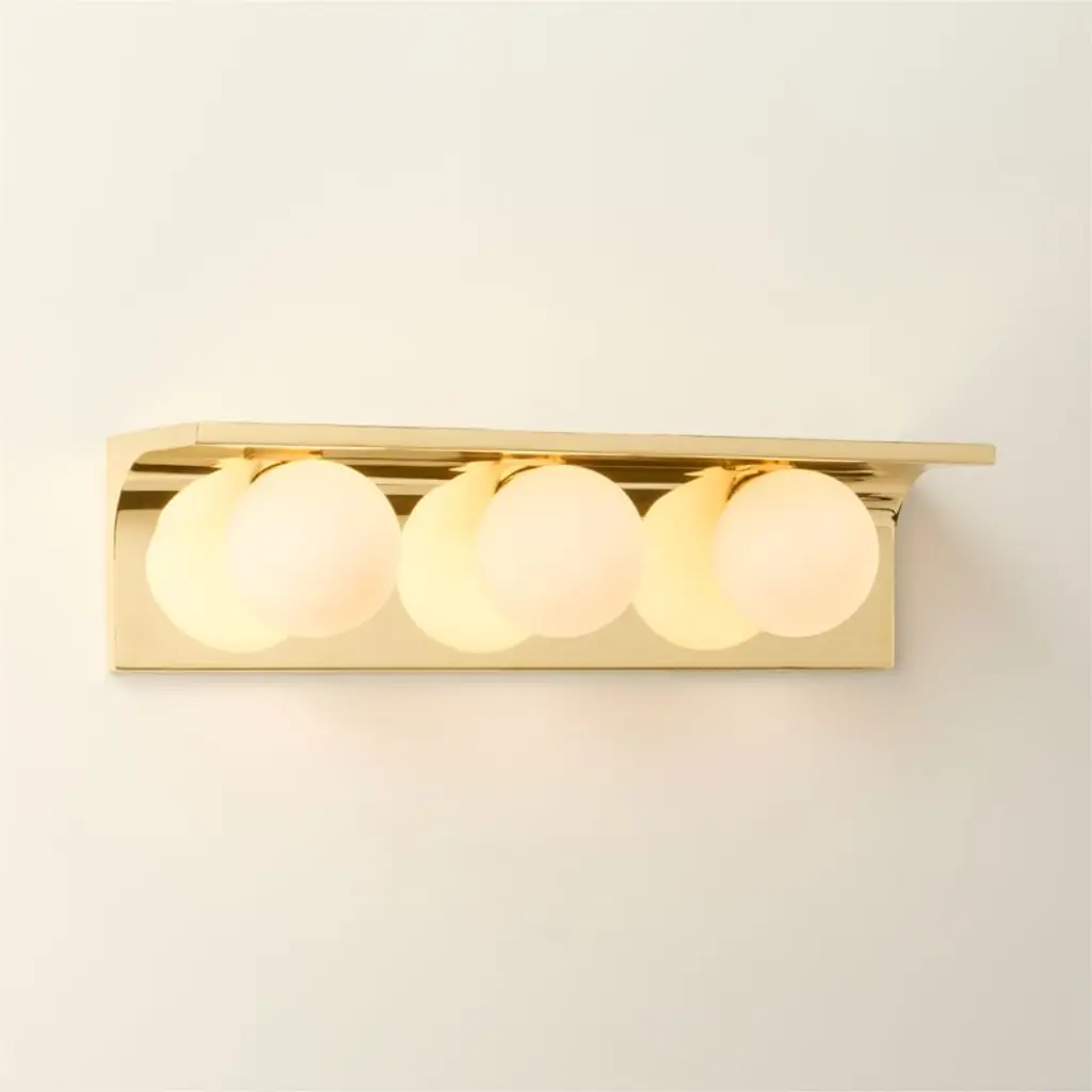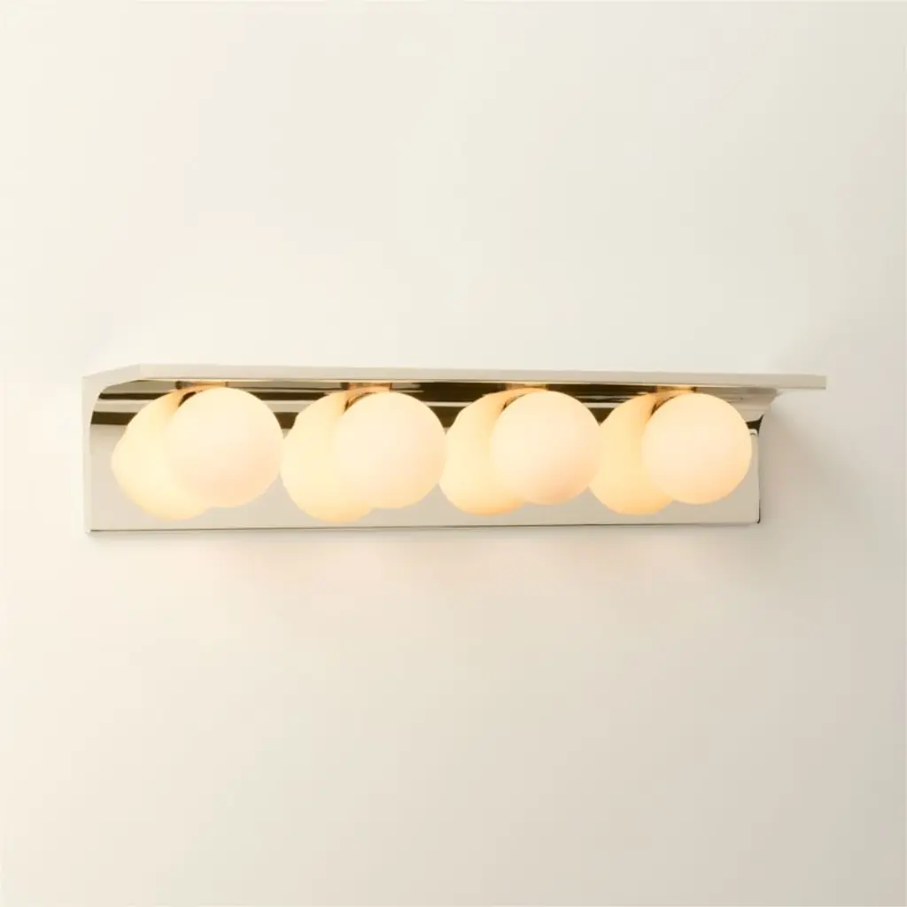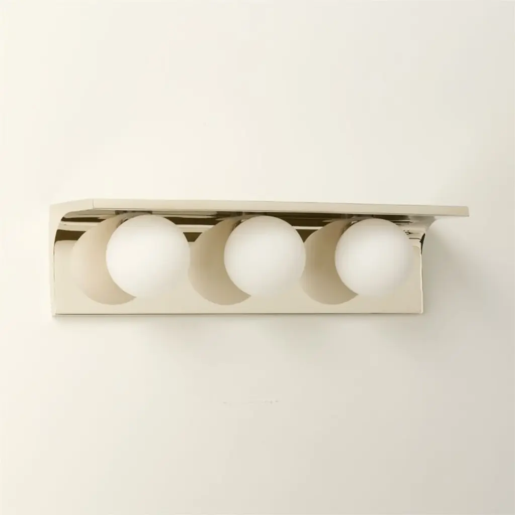 Polished nickel sconce by award-winning Euga Design Studio in Milan echoes one of ancient Rome's greatest innovations: the Aqua Virgo aqueduct. Displaying a purity of geometric form and modern materiality, sconce is suspended from an arc of polished nickel-plated brass, offering a living finish with warm undertones. Paired with three frosted glass globe shades for a warm glow. CB2 exclusive.