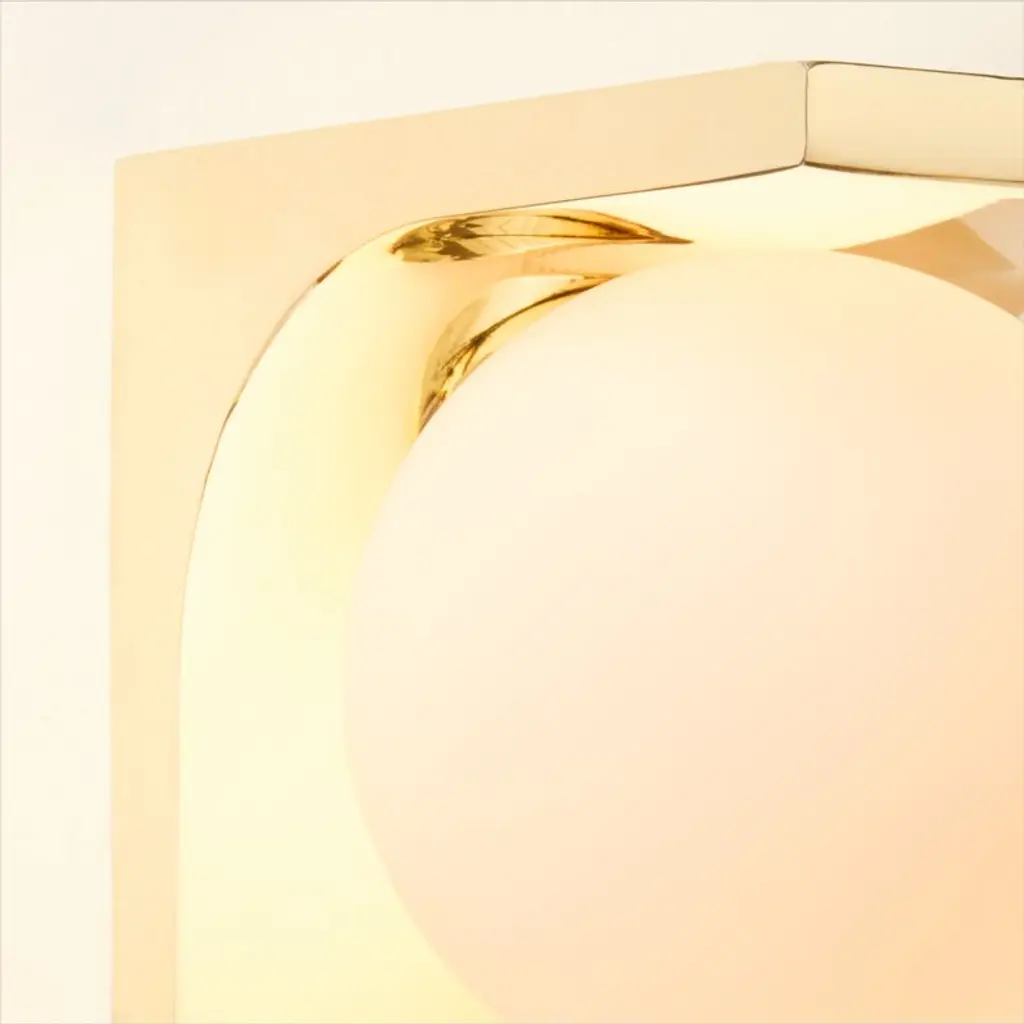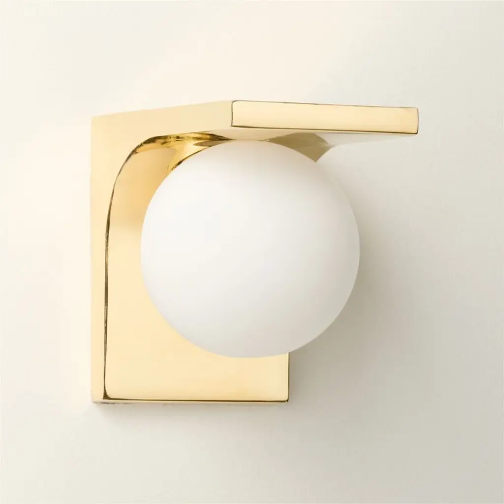 Polished brass sconce by award-winning Euga Design Studio in Milan echoes one of ancient Rome's greatest innovations: the Aqua Virgo aqueduct. Displaying a purity of geometric form and modern materiality, sconce is suspended from an arc of unlacquered brass, offering a living finish that will develop the patina of a vintage find. Paired with a frosted glass globe shade for a warm glow. CB2 exclusive.