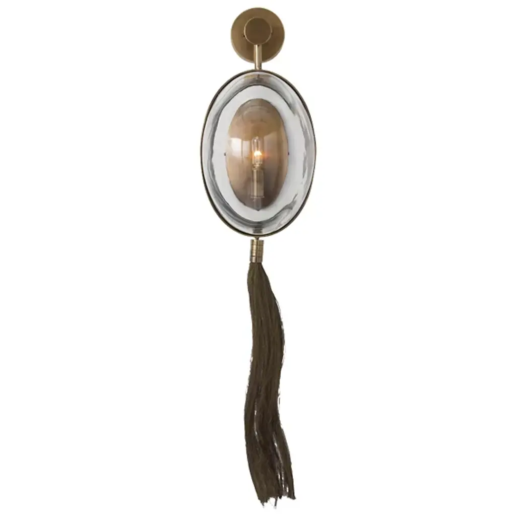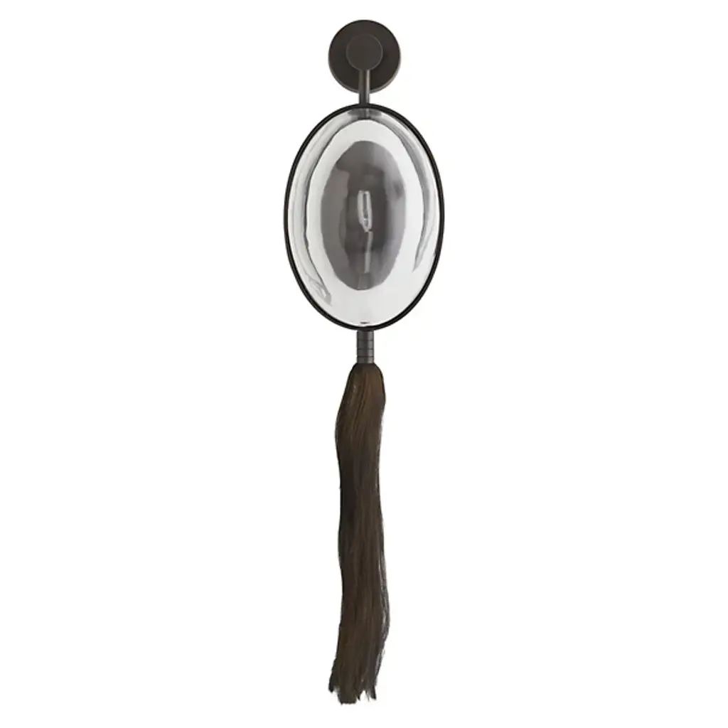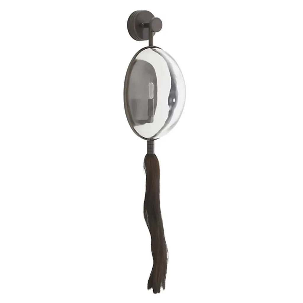 Designer Barry Dixon’s personal favorite from the new collection. The Arteriors Aramis Wall Sconce is a stunning display of engineering and avant garde artistry, drawing inspiration from McQueen’s infamous masked, ponytailed models. The sconce features a convex glass shield “mask” combined with a brass wire “ponytail.” A single tungsten filament bulb is held behind the glass, providing warm, even light that is then distorted and amplified to the surrounding space.
