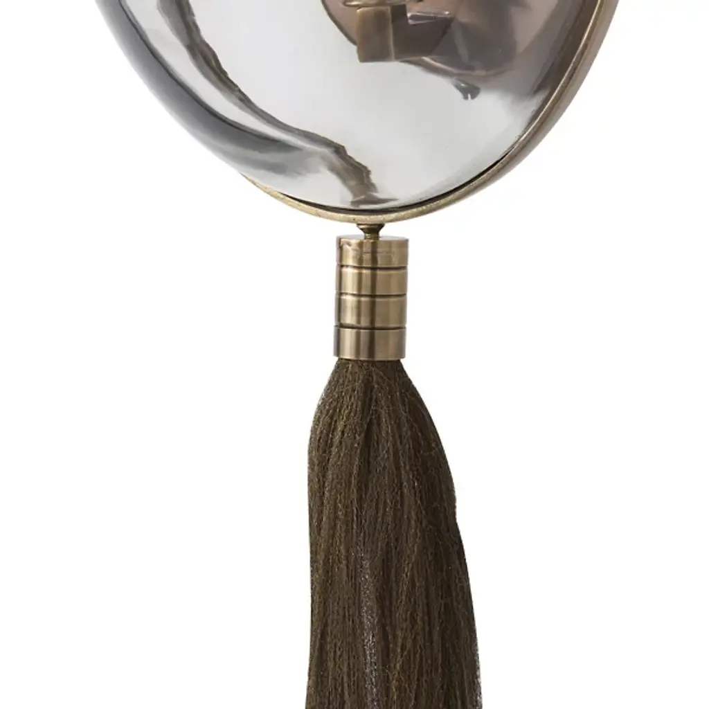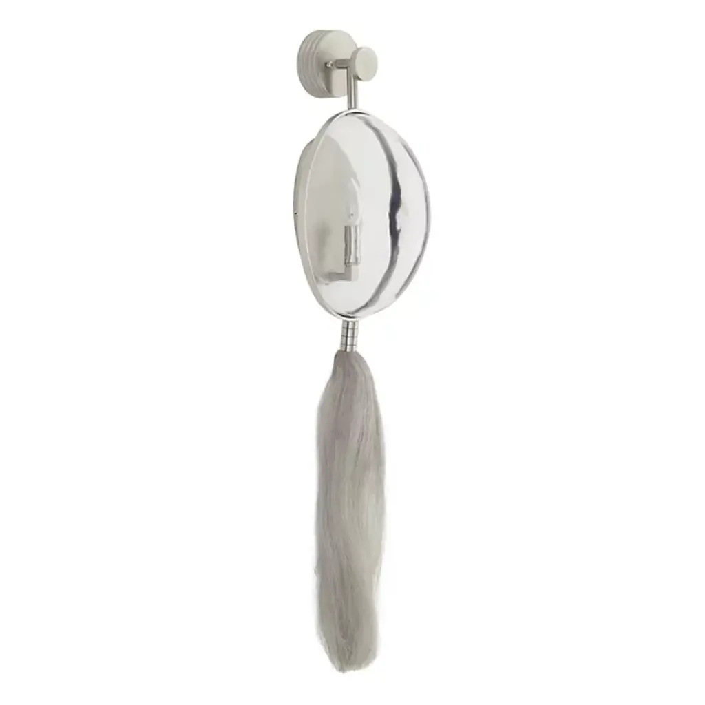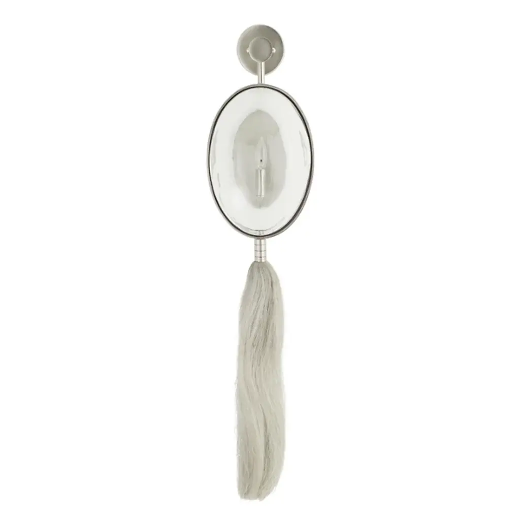 Designer Barry Dixon’s personal favorite from the new collection. The Arteriors Aramis Wall Sconce is a stunning display of engineering and avant garde artistry, drawing inspiration from McQueen’s infamous masked, ponytailed models. The sconce features a convex glass shield “mask” combined with a brass wire “ponytail.” A single tungsten filament bulb is held behind the glass, providing warm, even light that is then distorted and amplified to the surrounding space.