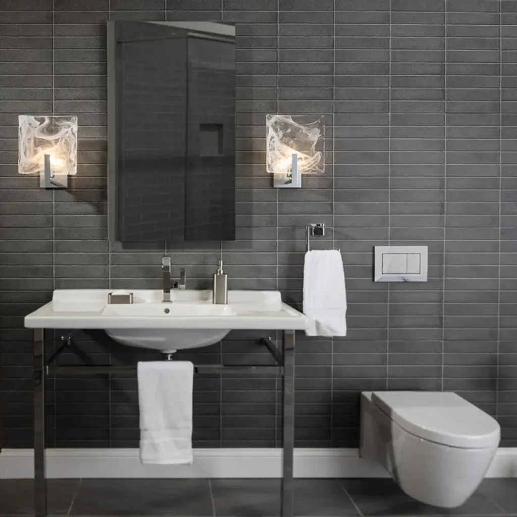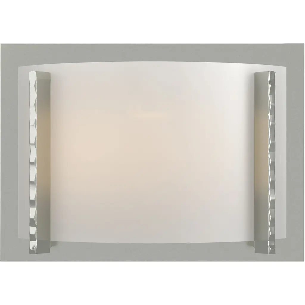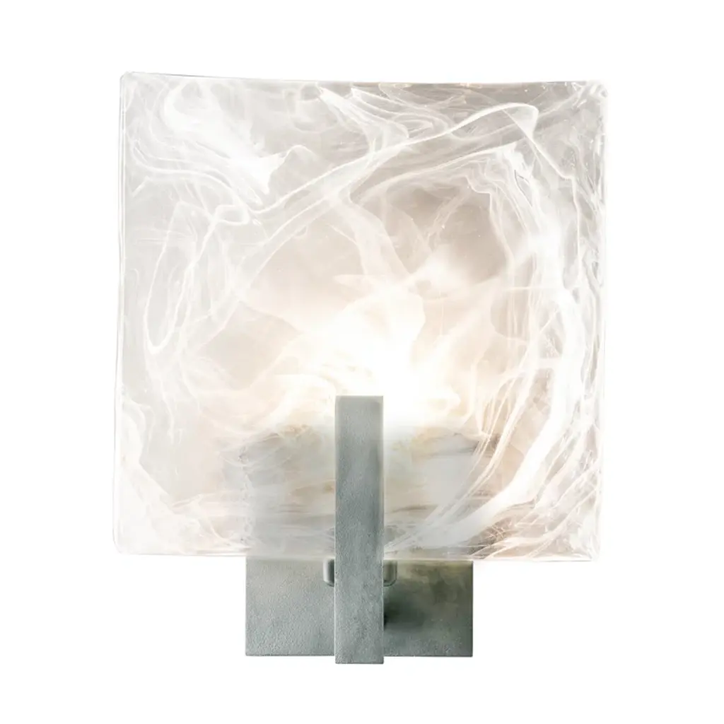 A large square thick convex glass panel that is clear with a freeform white swirl is held by a single, vertical handcrafted steel bar in the Arc 1 - light bath sconce. All Hubbardton Forge products are hand-crafted to last one at a time in Vermont.