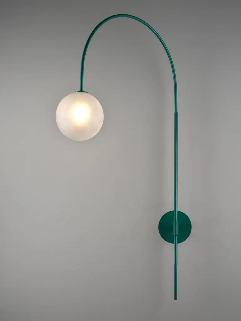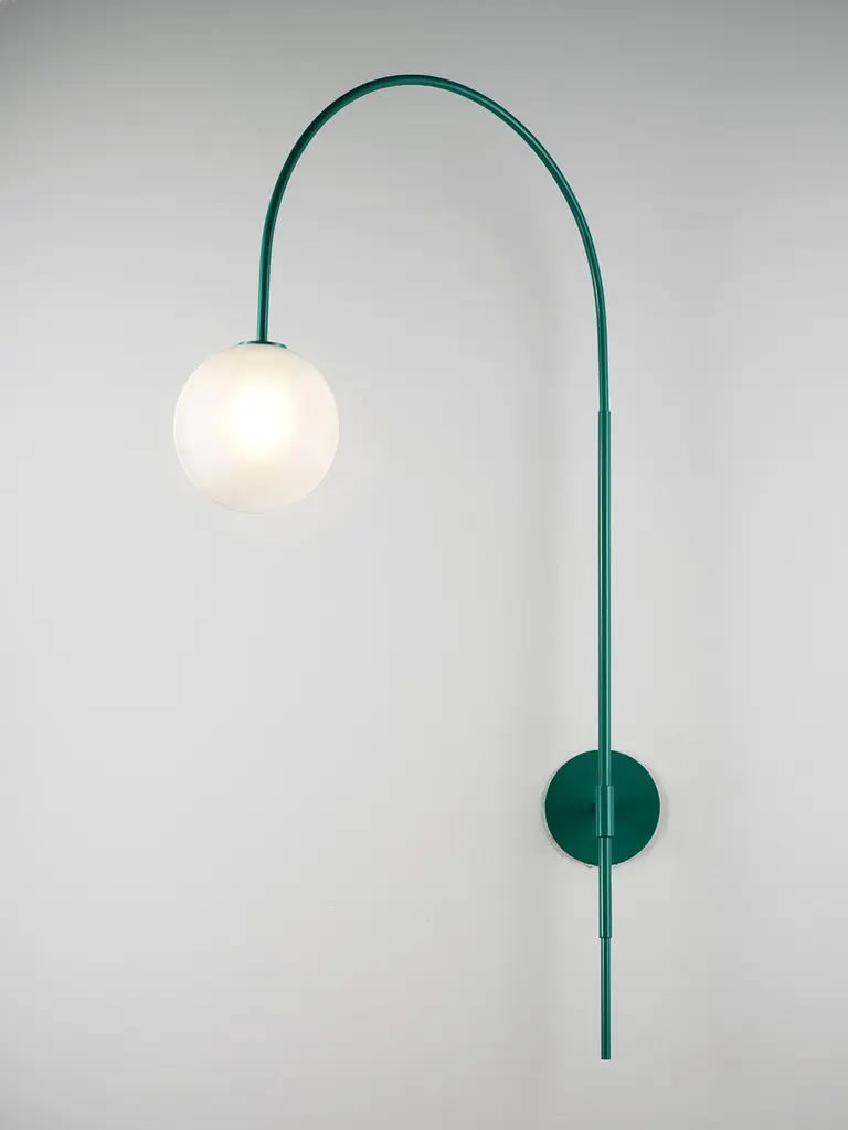 The ARC wall lamp or by Blueprint Lighting is a dramatically overscaled study in clean lines and simple form inspired by the tenets of the Bauhaus, ARC is truly a go-anywhere design and is equally at home in residential, commercial and hospitality projects. This fixture is especially impactful as a bedside lamp when space is at a premium! ARC is shown here in our "Paris Green" enamel, but may be made in any of our 6 in-house metal finishes or 36 in-house enamel colors.Dimensions: 36" H x 6" W x 22" D. For reference, the height from center of backplate to top of arc is 26". Blown opal glass globe is 6" diameter. Backplate is 4.75" diameter and covers a standard wall light junction box. Specs: Uses one (1) G9 socket bulbs (halogen-style socket with 2 pins). We recommend G9 LED bulbs in a T4 shape: 5w LED with 60 watt equivalent. Bulbs not included. Dimmable.All Blueprint Lighting products are UL-listed.