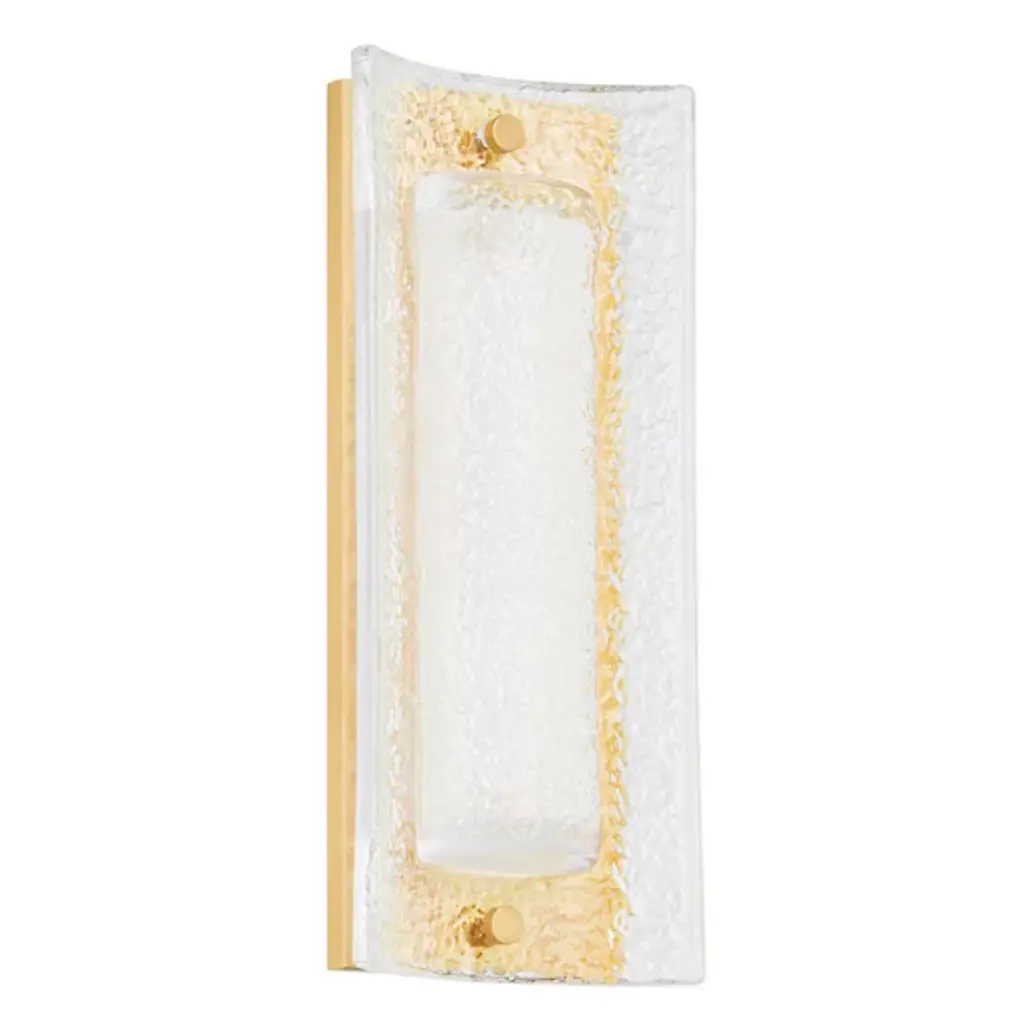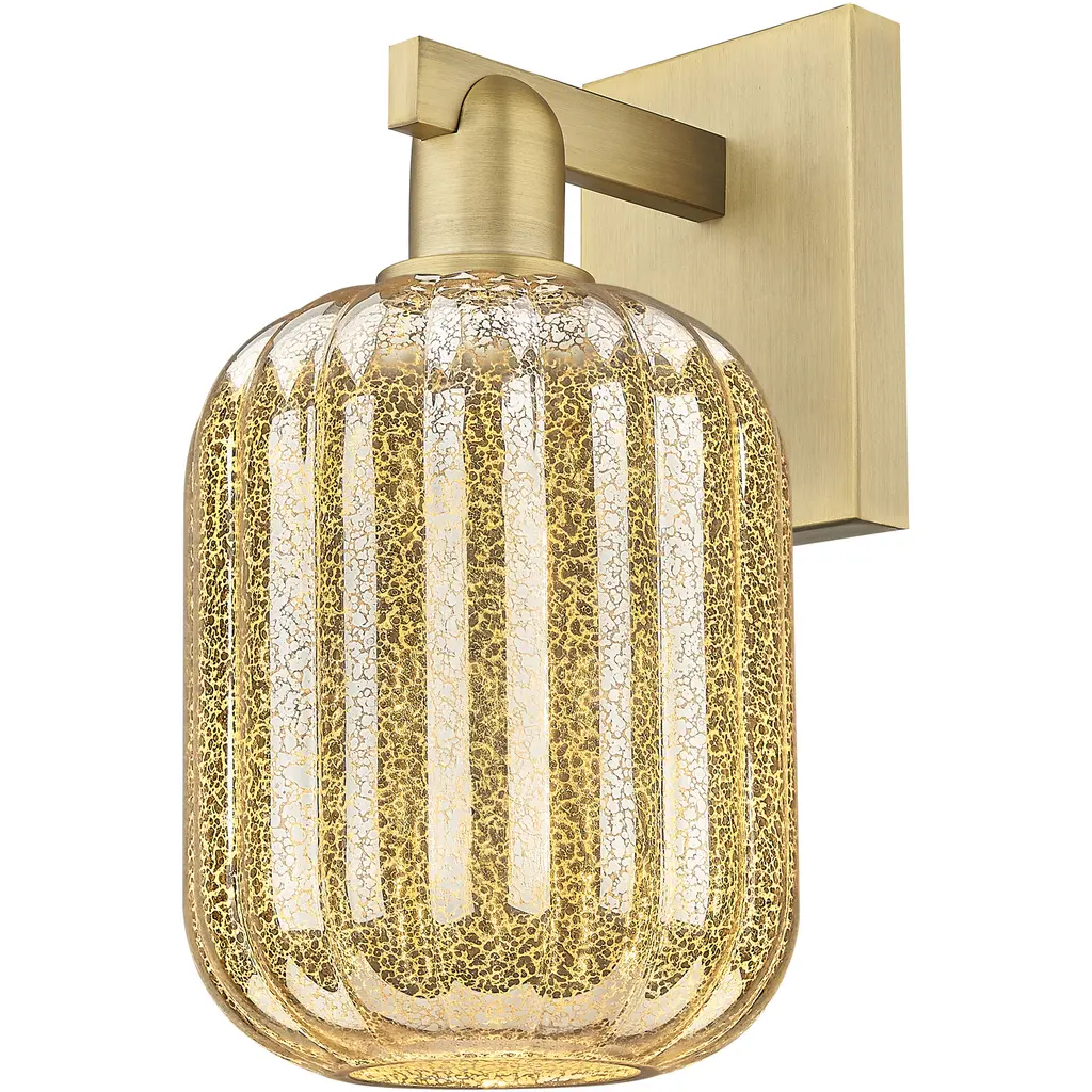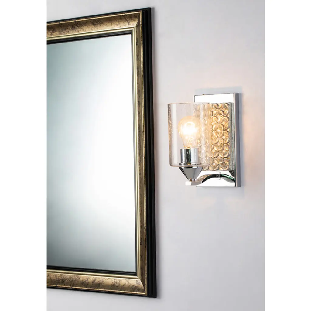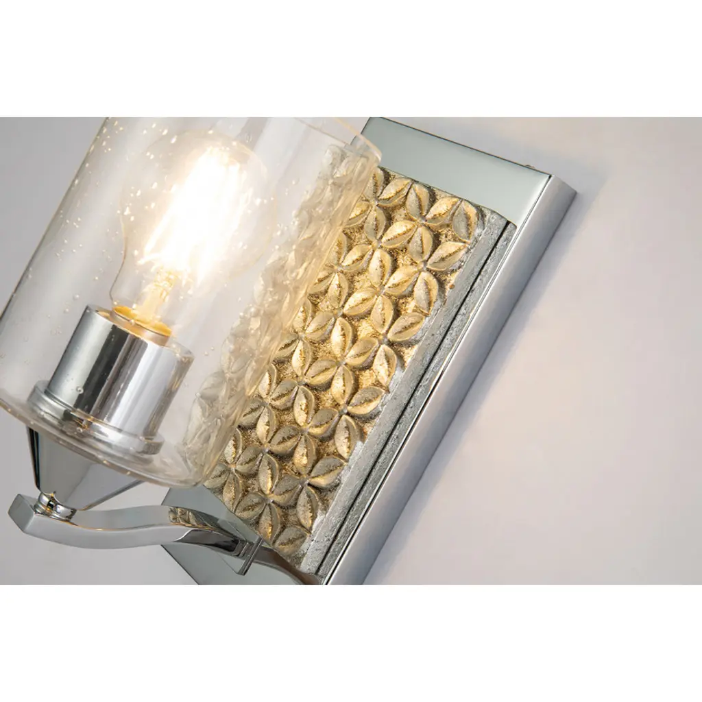 Perfect for brightening your hallway, bathroom or living space, this 1-light wall sconce features a clean-cut rectangle backplate with textured shapes, simple curved arm and a unique two toned finish of polished chrome and antiqued silver. Showing off its contemporary side, this one-light sconce uses a cylinder shaped clear seeded glass to bring attention to the mix of texture and detail that come together in our Arcadia collection.