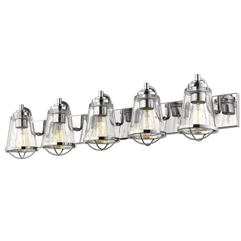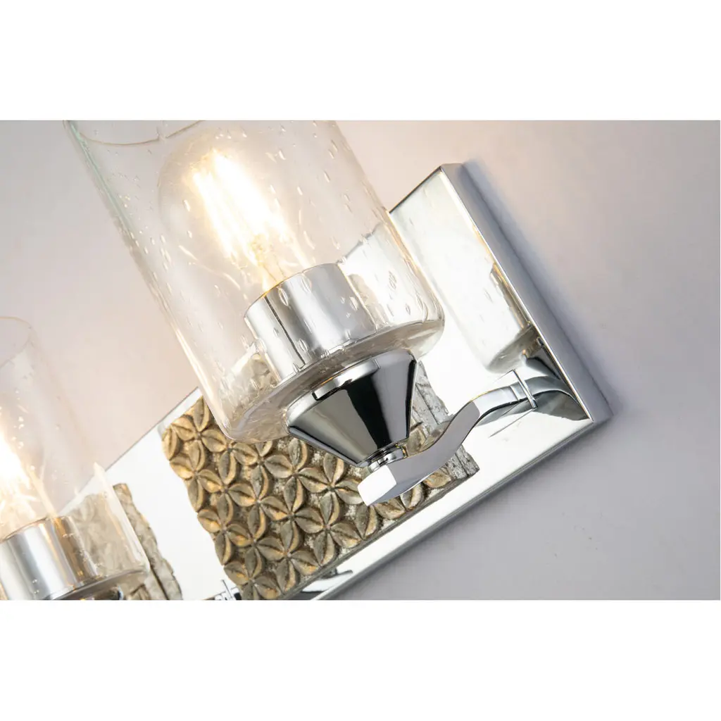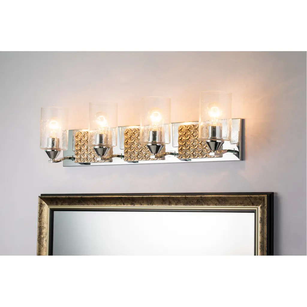 Clean lines and timeless design this 4-light vanity light is perfect for brightening your bathroom space giving it texture and dimension. Featuring a clean-cut rectangle backplate with textured traditional shapes, simple curved arm and a unique two-toned finish of polished chrome and antique silver. Showing off its contemporary side, this 4-light bathroom light uses a cylinder shaped clear seeded glass to bring attention to the mix of texture and details that come together in our Arcadia collection. Measuring 35" Wide, 8" in height and 6.5" in depth, this four-light vanity light can fit in nearly any space.