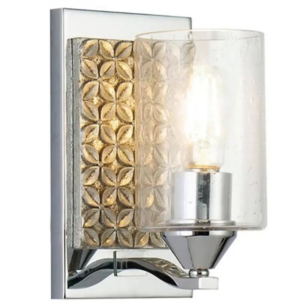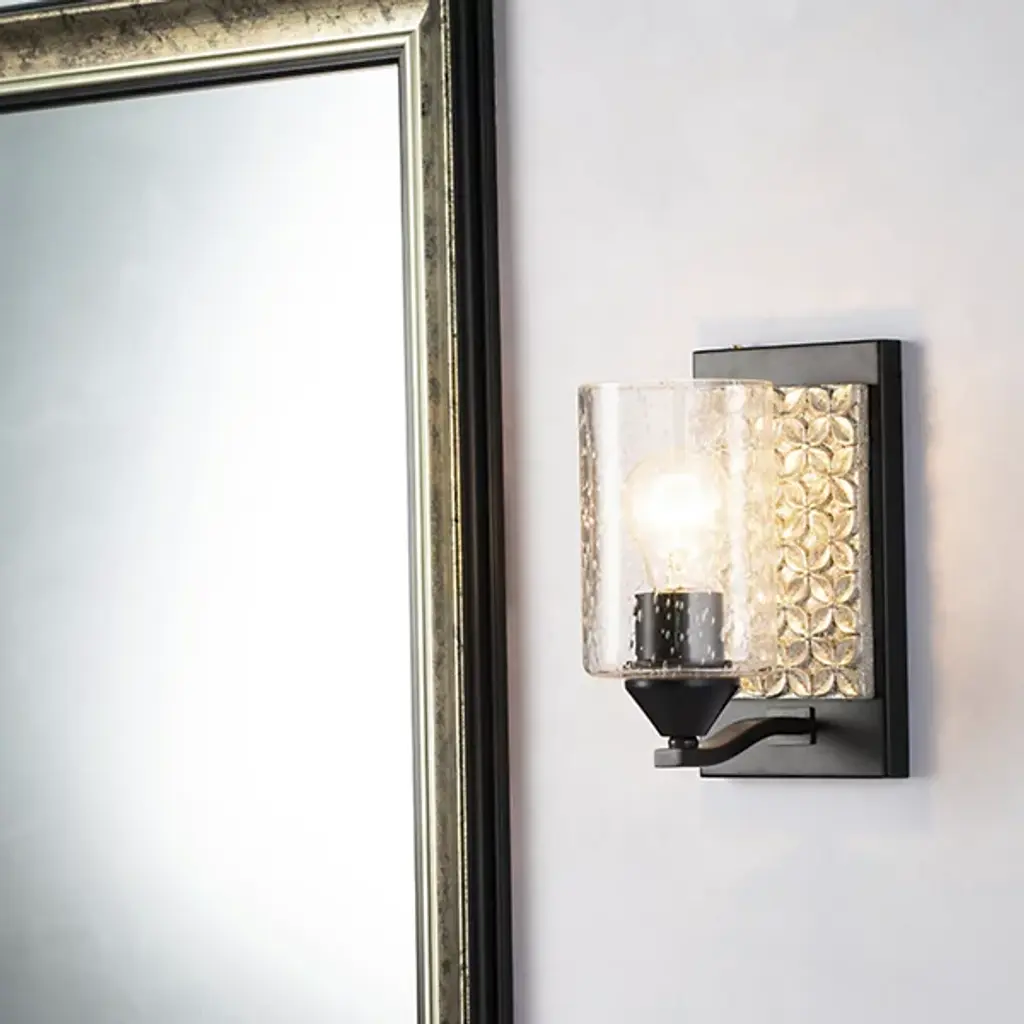 Made for brightening your hallway, bathroom, or living space, the Arcadia Wall Sconce by Lucas McKearn features a clean-cut rectangle backplate with textured shapes and a simple curved arm. Showing off its contemporary side, this wall sconce uses a cylinder-shaped clear seeded glass to bring attention to the mix of texture and detail that come together seamlessly.