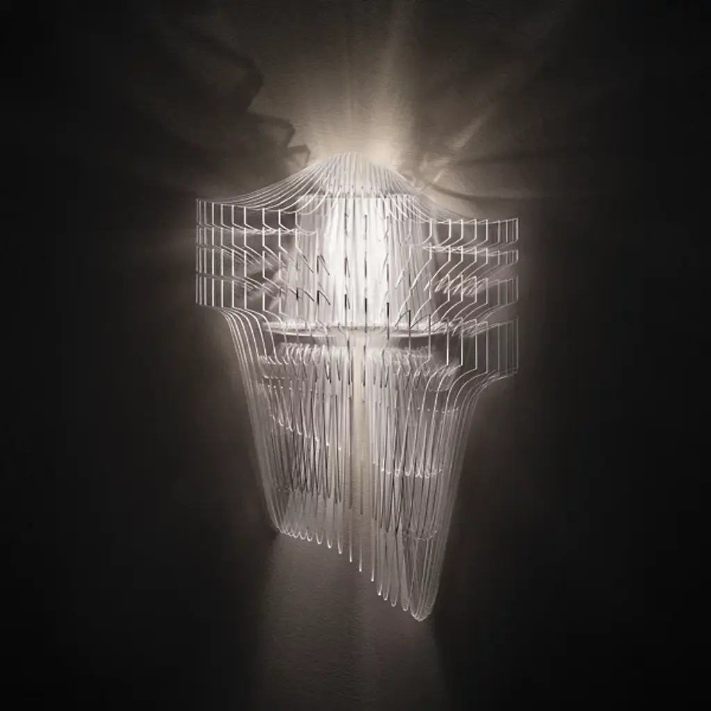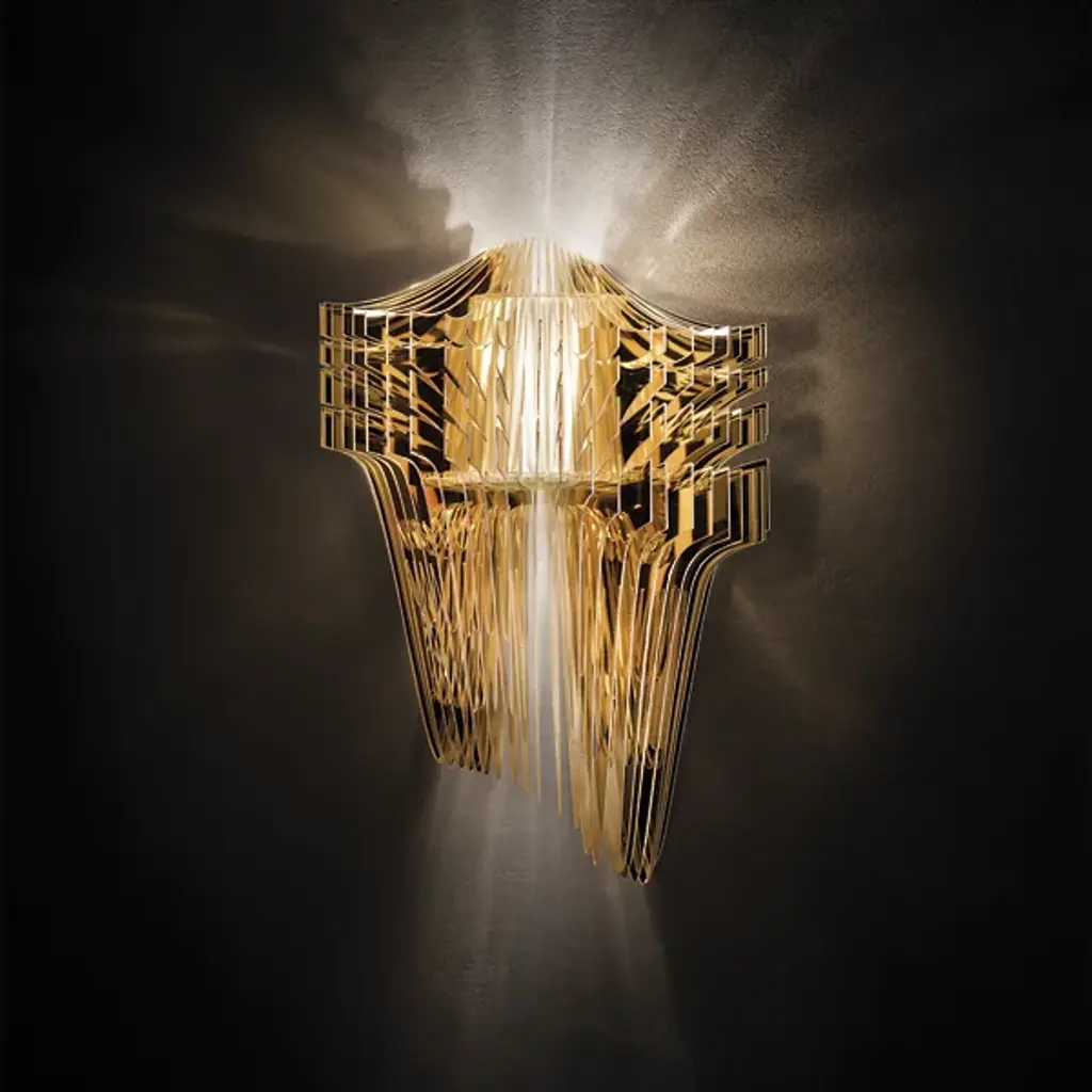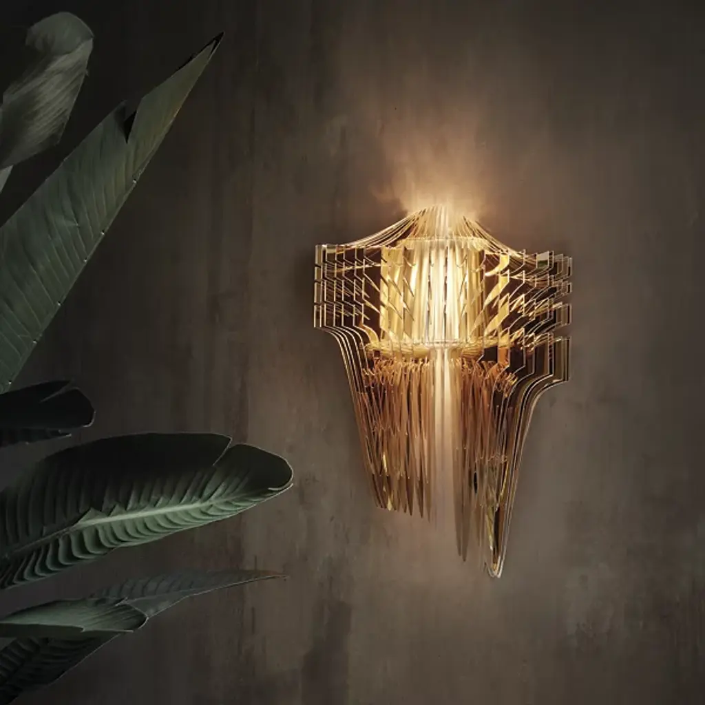 The Aria Wall Sconce from Slamp projects art and artistry in an appealing retro presence. This Zaha Hadid design leverages her experience with varied architecture projects to create something swooping, while an outward-folded fan shape of Lentiflex fins juts out from robust aluminum furniture, adding sparkling style to the radiant reflections. The layered deco style gleams and glitters with reflected light, drawing the eye inward towards it as the inset LED lamping sheds an enchanting ambiance around it.