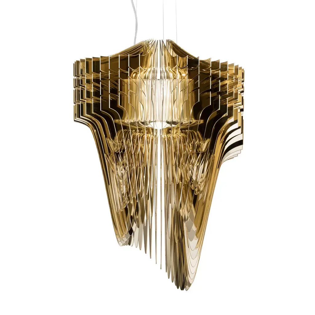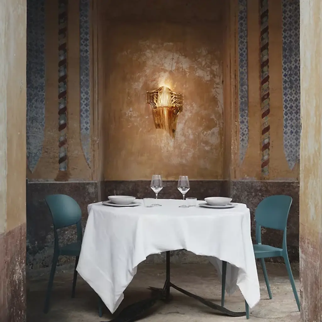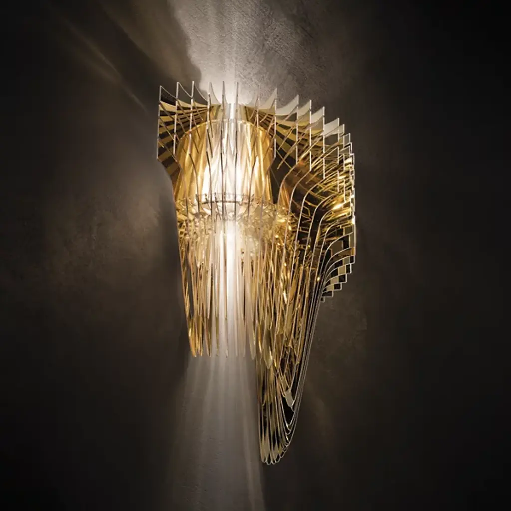 The Aria Wall Sconce from Slamp projects art and artistry in an appealing retro presence. This Zaha Hadid design leverages her experience with varied architecture projects to create something swooping, while an outward-folded fan shape of Lentiflex fins juts out from robust aluminum furniture, adding sparkling style to the radiant reflections. The layered deco style gleams and glitters with reflected light, drawing the eye inward towards it as the inset LED lamping sheds an enchanting ambiance around it.