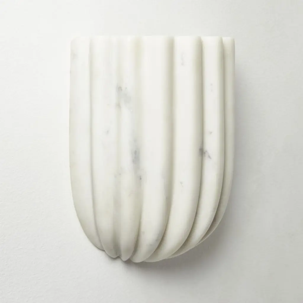 Fluted detailing and elemental materiality lend a vintage quality to the marble sconce from Melbourne-based VUUE. A single slab of white marble is cut into a rippled silhouette, carved so exquisitely thin that it casts a subtle glow. Sconce makes a sculptural statement while illuminating a hallway or flanking a fireplace. CB2 exclusive.