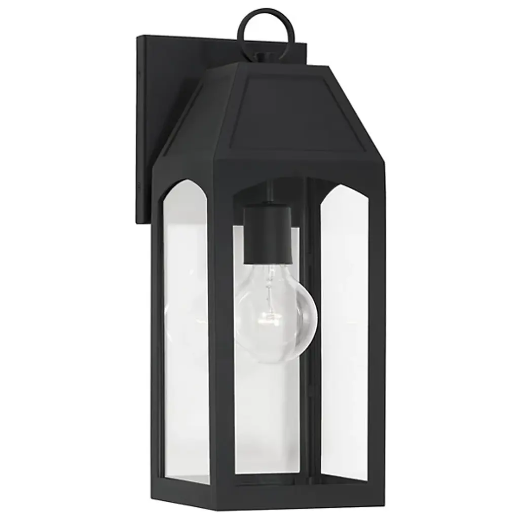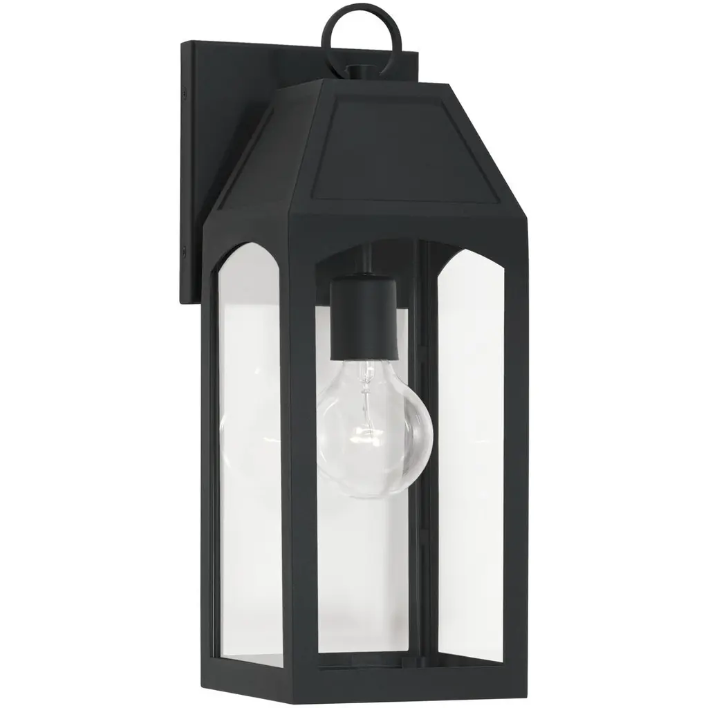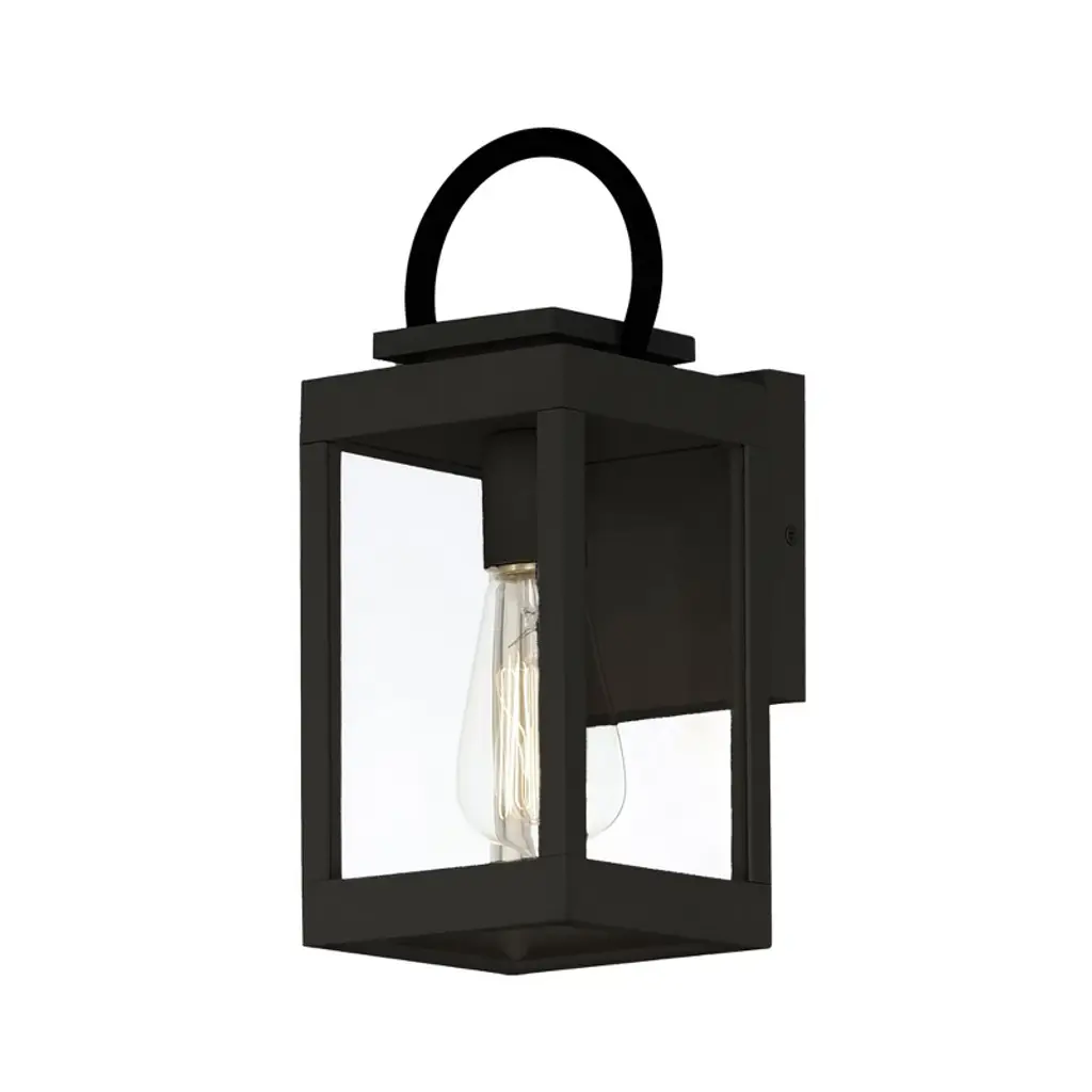 A smooth interpretation of a traditional lantern structure. The Aristide Outdoor Wall Sconce from Huxe extends from a square steel wall mount, placing robust, downward-facing lamping inside a rectangular frame structure capped off by a large finial loop that juxtaposes a curved shape with the sharp angles of the rest of the fixture. Panels of clear glass blunt glare from the wet-listed lamping, transforming it into a warmer ambiance that blazes out to the sides and reflects off its mounting surface.