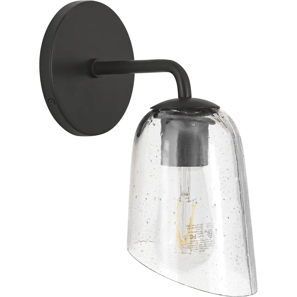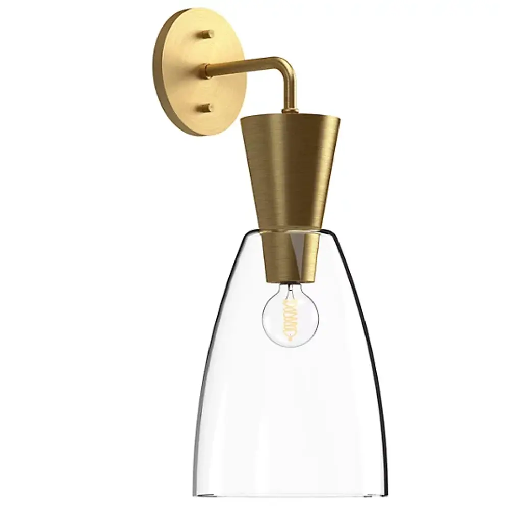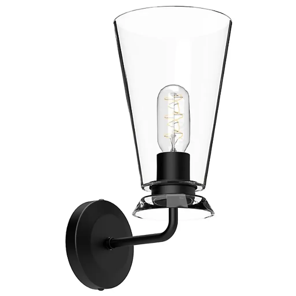 Lend an open, personable appeal to your inside wall spaces with the Arlo Wall Sconce from Alora Mood. Retained by a sleek circular wall mount, it extends a slender central stem out to the side, curving down to position a conical housing and body set partially inside a goblet-shaped shade of clear glass. The shade’s surface disrupts the bright glare to the sides, transitioning it into a warm glow that wraps a focused wash of direct light.