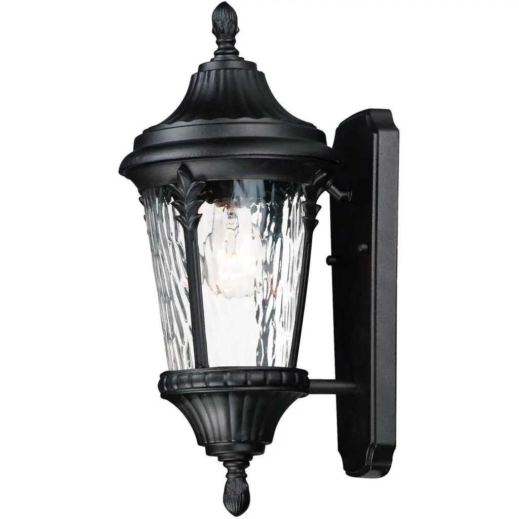 Traditional charm emanates from this small outdoor wall mount fixture, which pairs clear water glass with black hardware for a timeless look.