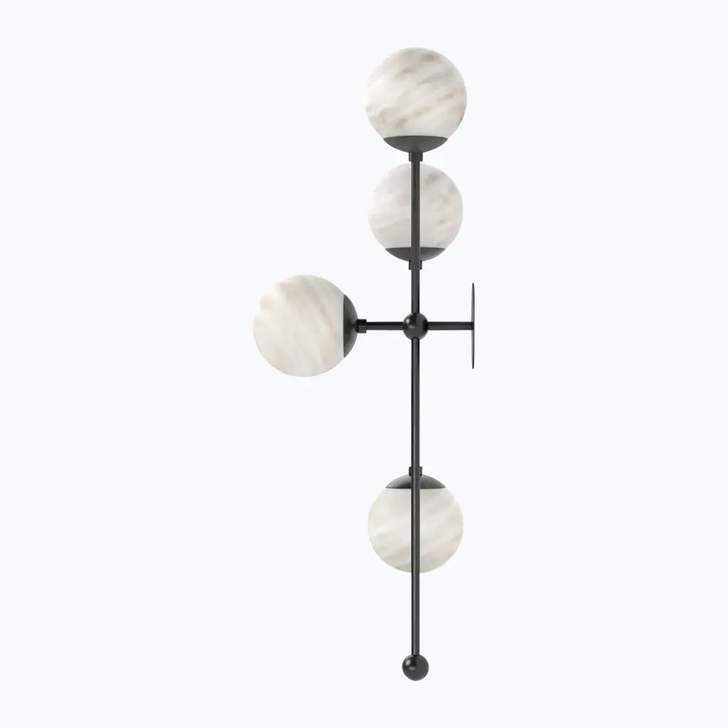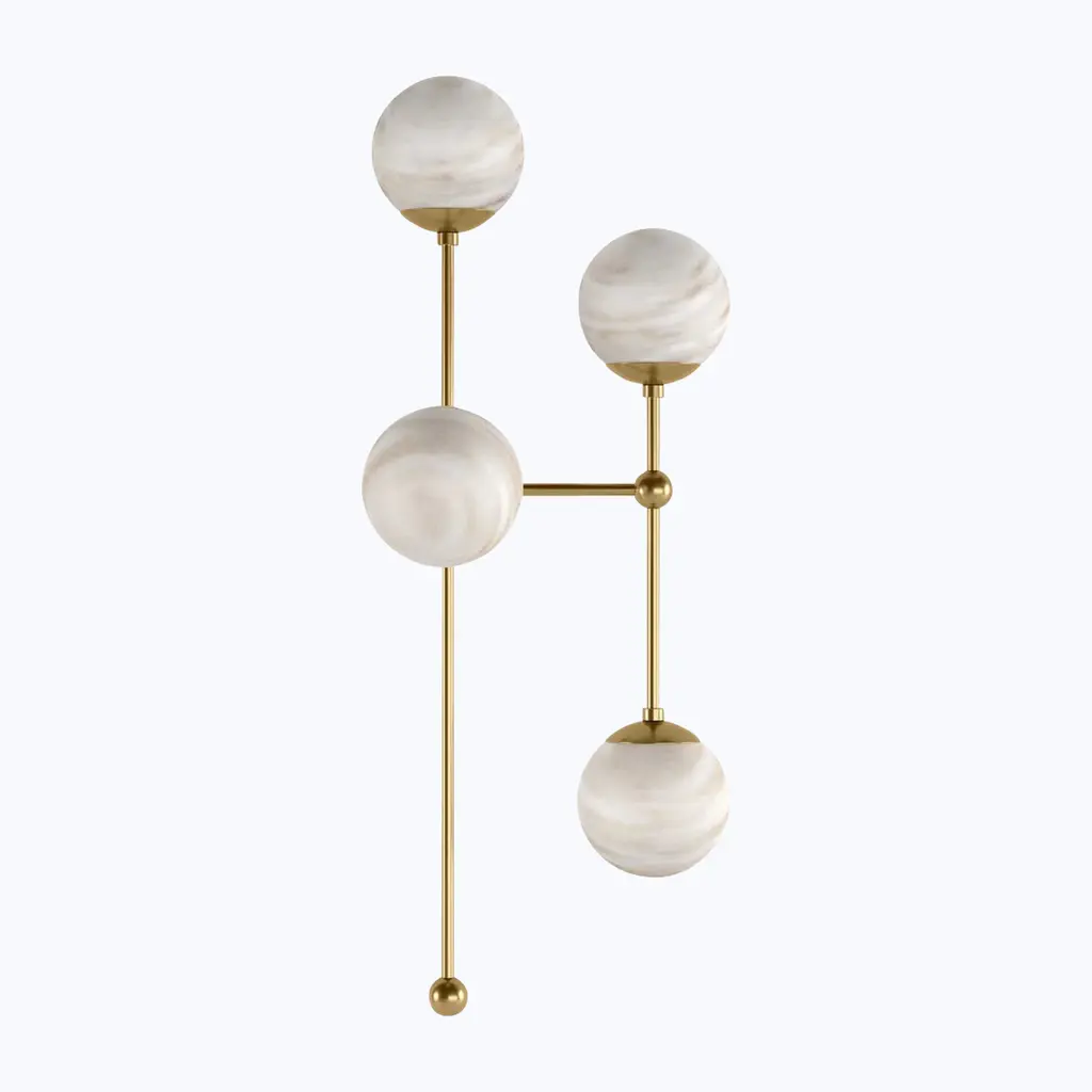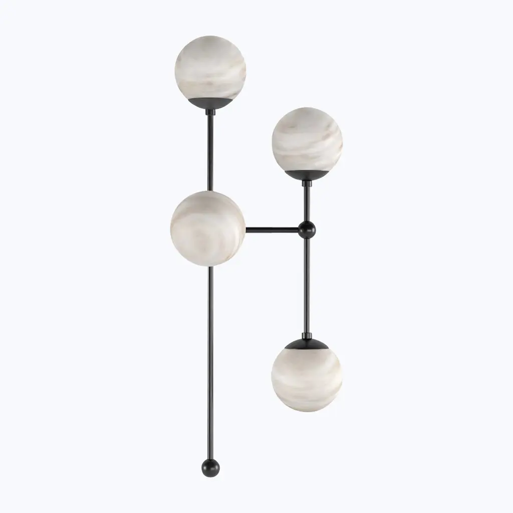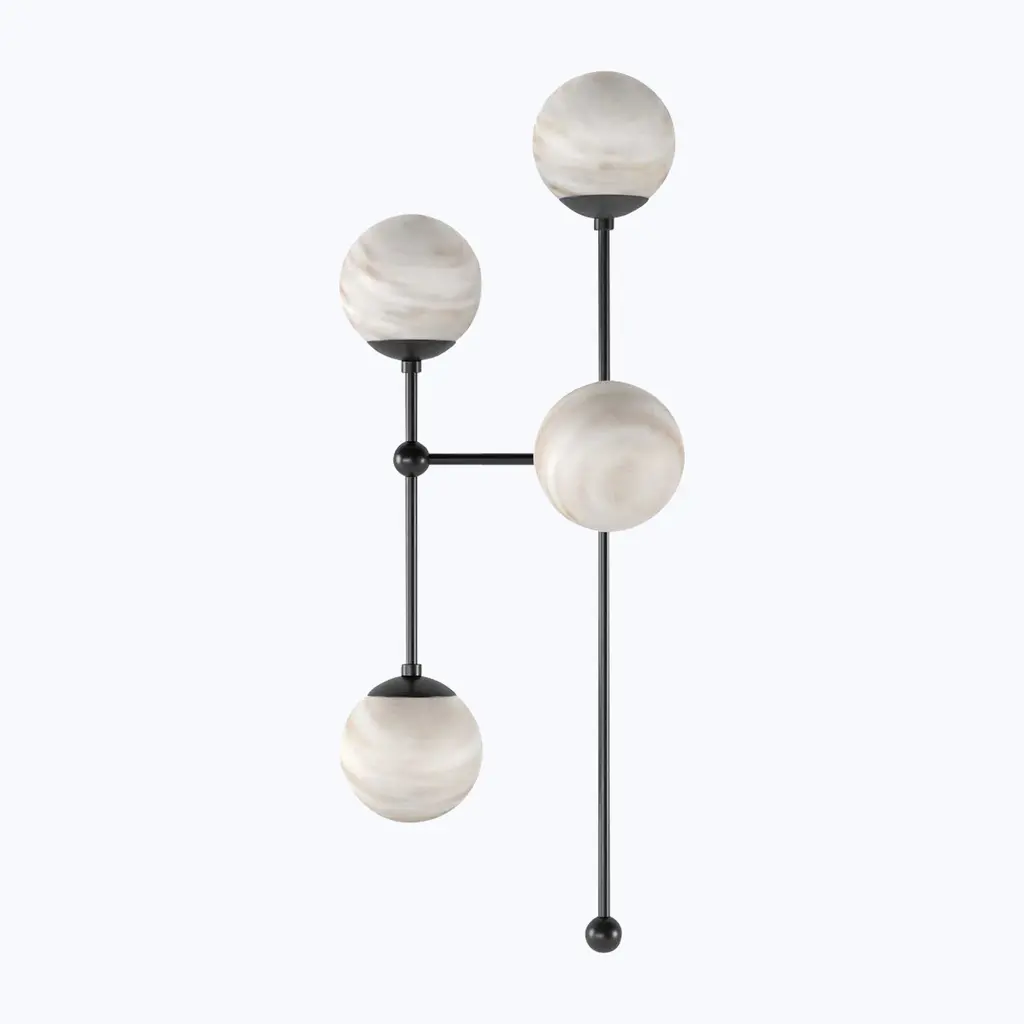 Discover the Armstrong 4 Sconce by Four Hands. Featuring exquisite symmetry and beautiful marbled glass spheres, this eye-catching sconce blends art deco elegance with modern sophistication. Each globe is handblown, shaped, and sculpted in an hour-long process. Designed and sustainably crafted in Poland by Schwung. Available in black gunmetal and burnished brass. Choose from left and right configurations.