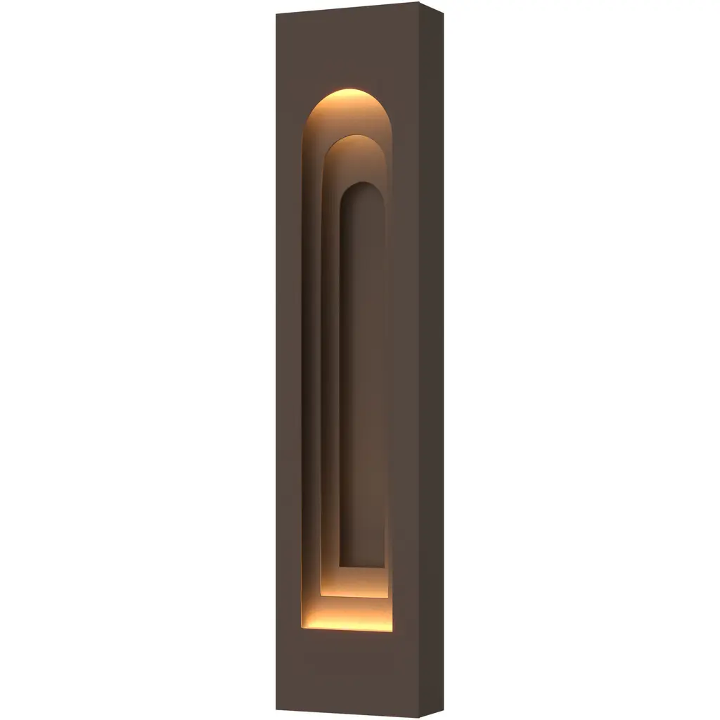 Inspired by a visit to the Grundtvigs Church in Copenhagen, the Procession Arch Small Outdoor Sconce takes the idea of spatial progression, utilizing forced perspective to achieve its timeless aesthetic. The original Gothic arch was transformed into a Roman arch in this aluminum wall-mounted sconce. Part of ART + ALCHEMY by Hubbardton Forge. Designed for the outdoors, yet beautiful enough for the indoors, as well.
