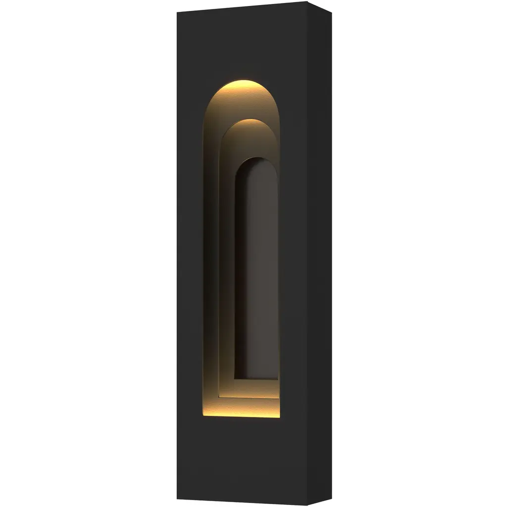 The Procession Arch Large Outdoor Sconce is a creative interpretation of the interior of the Grundtvigs Church in Copenhagen that our designer visited while studying architecture. The varying depth of field created by a trio of aluminum arches provides a balanced aesthetic that's both modern and timeless. Made for the outdoors, yet elegant enough for indoor use, as well. Part of ART + ALCHEMY by Hubbardton Forge.