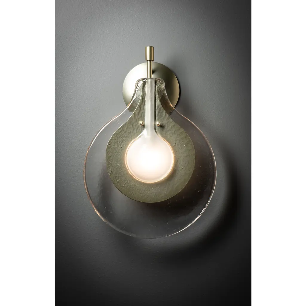 Italian Venetian glass sets the tone for this beautiful wall sconce. Twin layers resembling a large "drop" of handmade, tactile glass encase a sculptural piece of steel that nestles the bulb within a frosted glass. HF's Jason Hancock designed this with a very small wall mount that complements this unique and stunning piece, part of the ART + ALCHEMY by Hubbardton Forge Collection.
