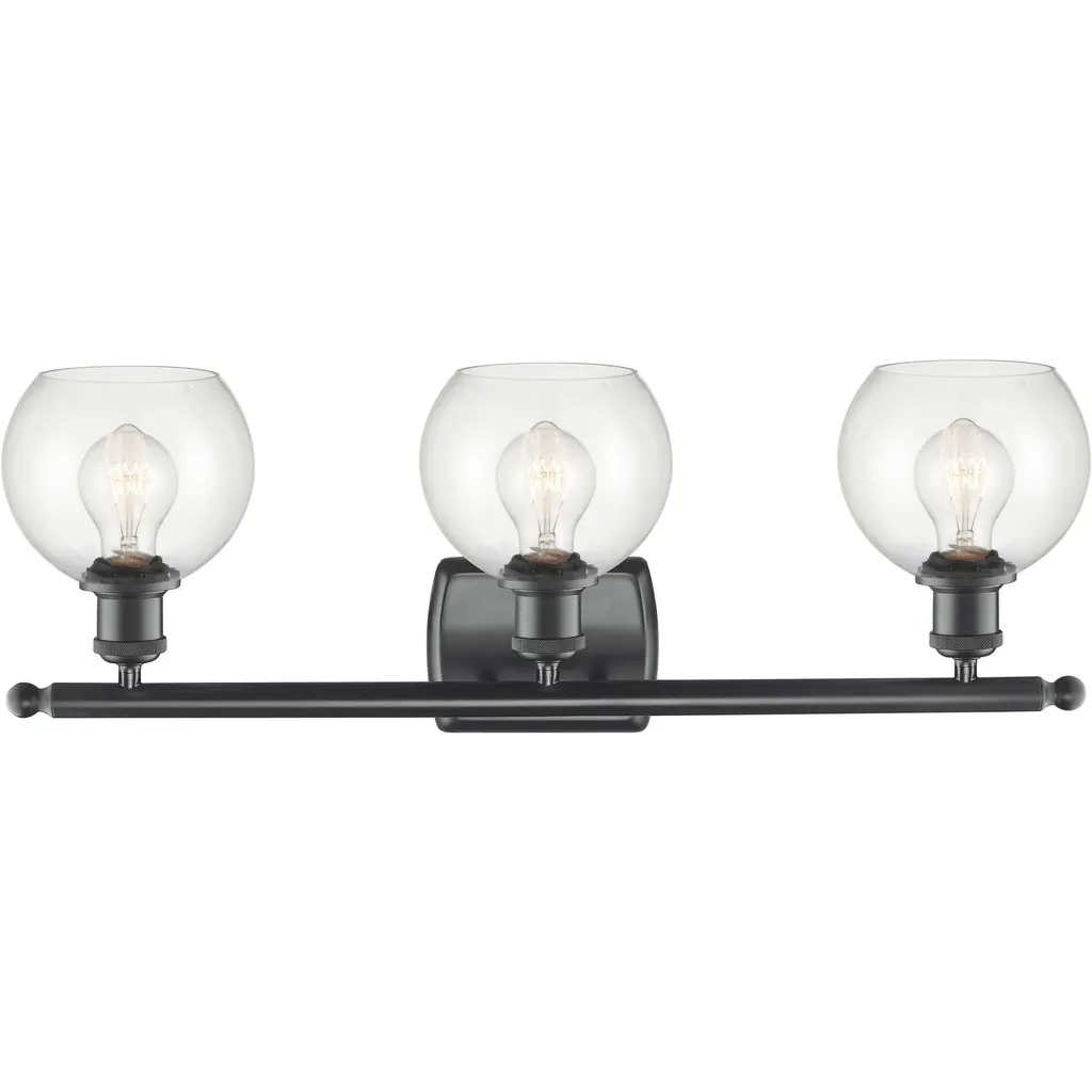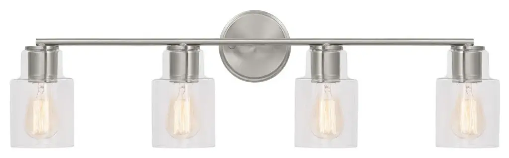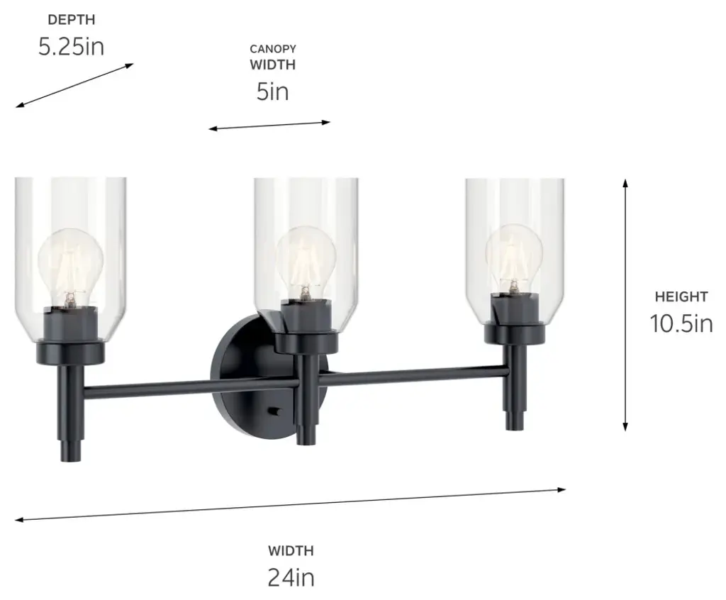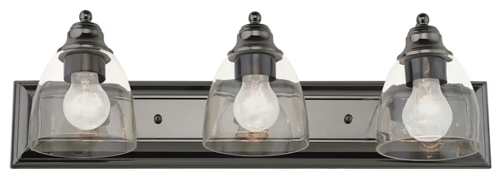 Material: Glass, Finish Color: Black/Brushed Nickel, Width: 21.65", Height: 7.79", Length: 21.65", Depth: 6.41", Backplate Width: 7.87", Backplate Length: 5", Lamping Type: Incandescent, Number Of Bulbs: 3, Wattage: 60 Watts, Dimmable: Yes, Moisture Rating: Damp Rated