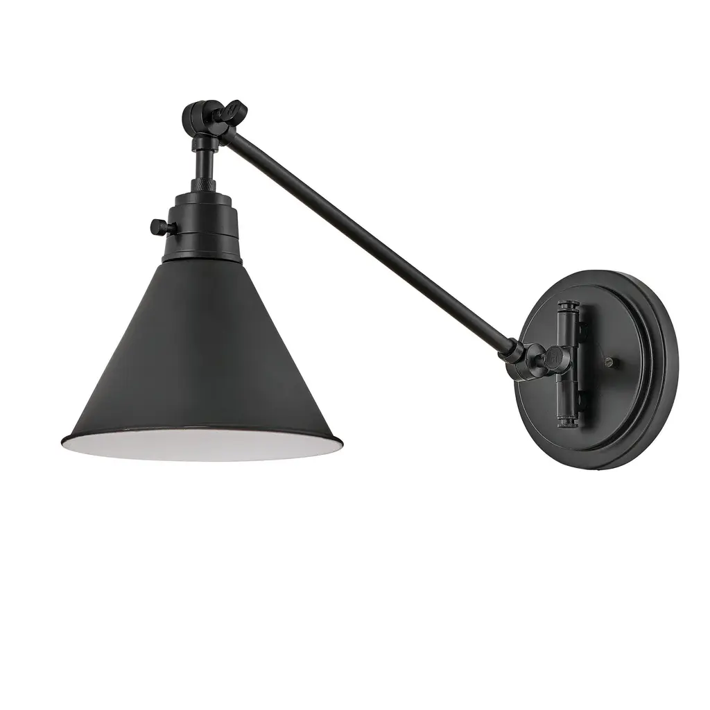 Taking a streamlined approach to the traditional task light fixture, the Arti Wall Sconce from Hinkley lends traditional appeal to any contemporary home. Featuring a conical, steel shade attached to a slim arm, two hinges allow you to adjust the shade and focus the light on specific areas within your room. Elegant and versatile, this sconce is perfect for highlighting artwork or shelving within your home, bringing a touch of brightness to your bedside, or lighting up a workstation in your kitchen. Highlights