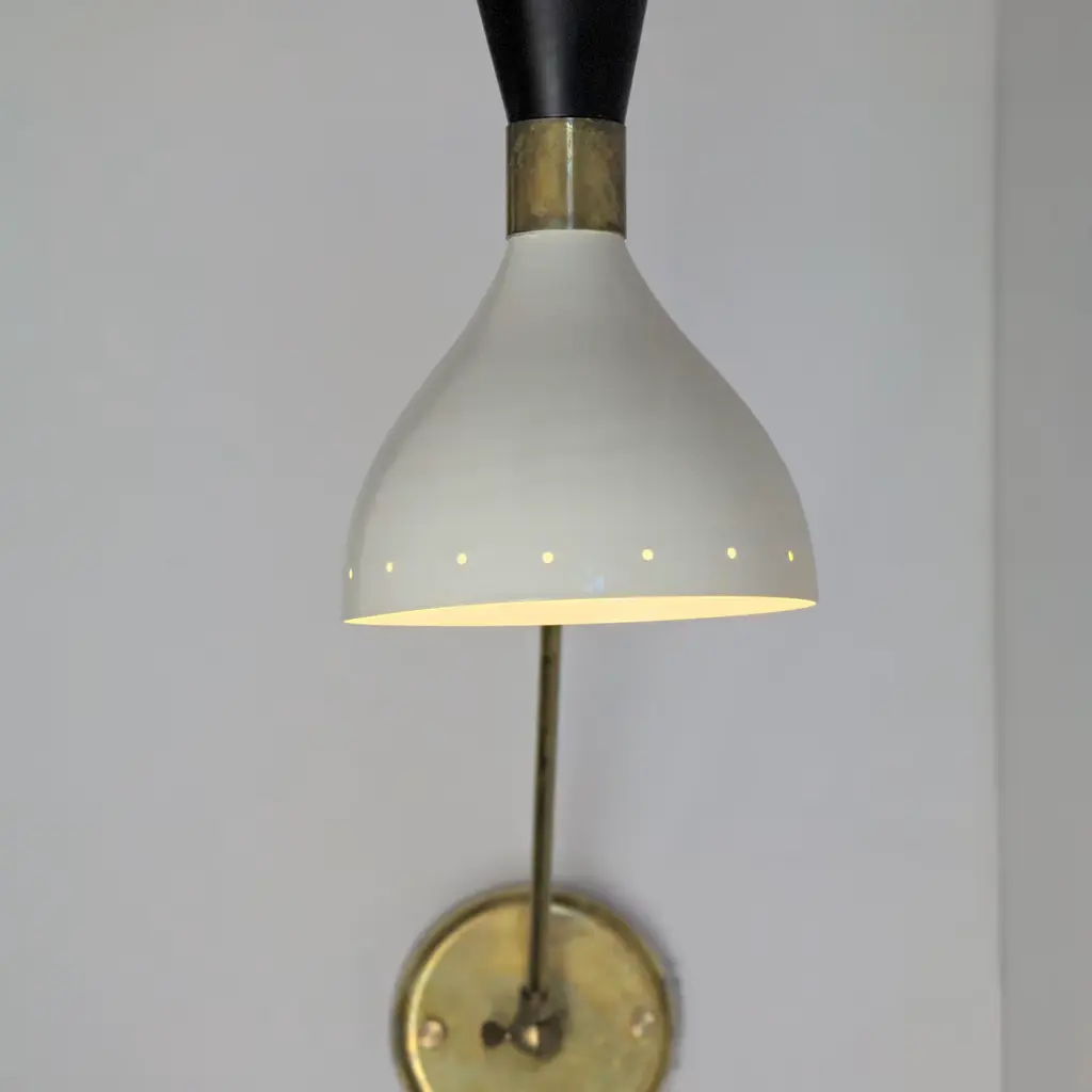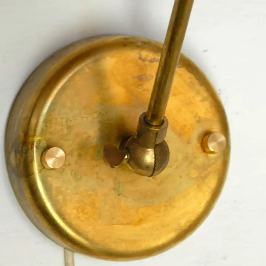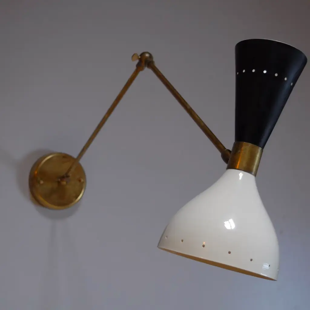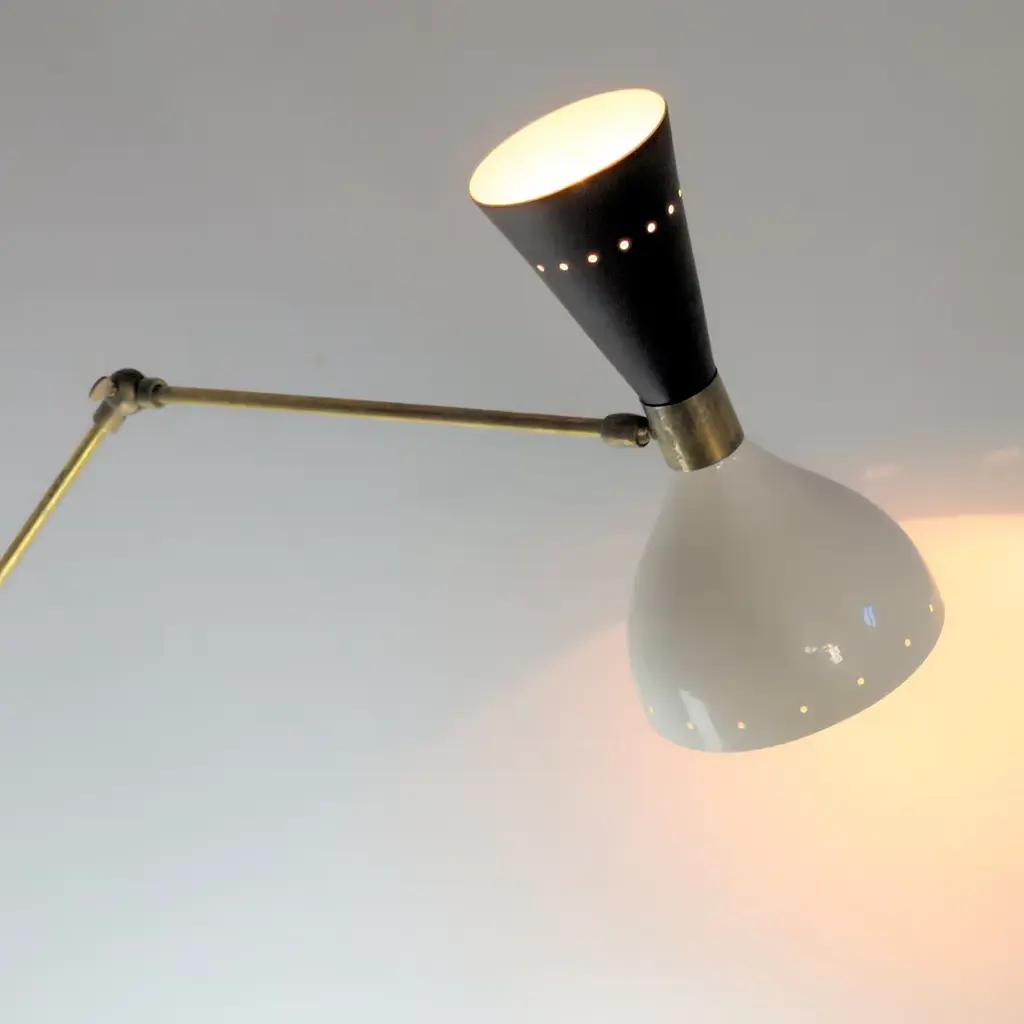 A dynamic addition to a modern home, this sconce can be an accent piece in an entryway, or in pair flank a mirror or a sofa in a living room. Its brass structure features two moving joints and a third operated by a thumb key. The base can move at a 30 degree angle, while the double shade pivots on its support of 360 degrees. Made of aluminum, the shade measures 12.5 cm in length and 15 cm in maximum diameter. It has lacquered color block finish that can be changed upon request with interior in ivory or gold. For customization please inquire with the Concierge.