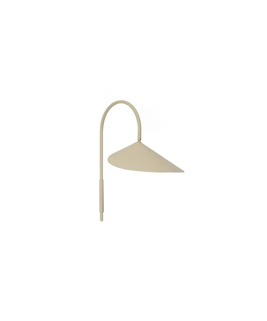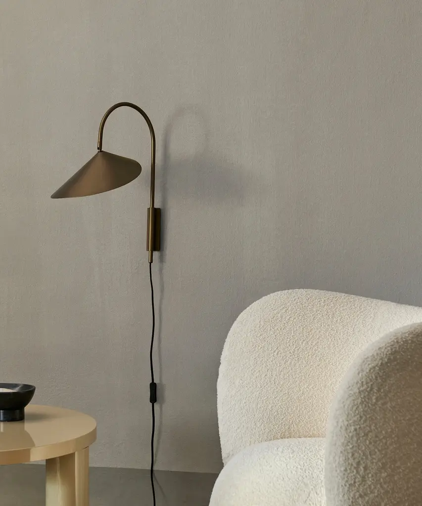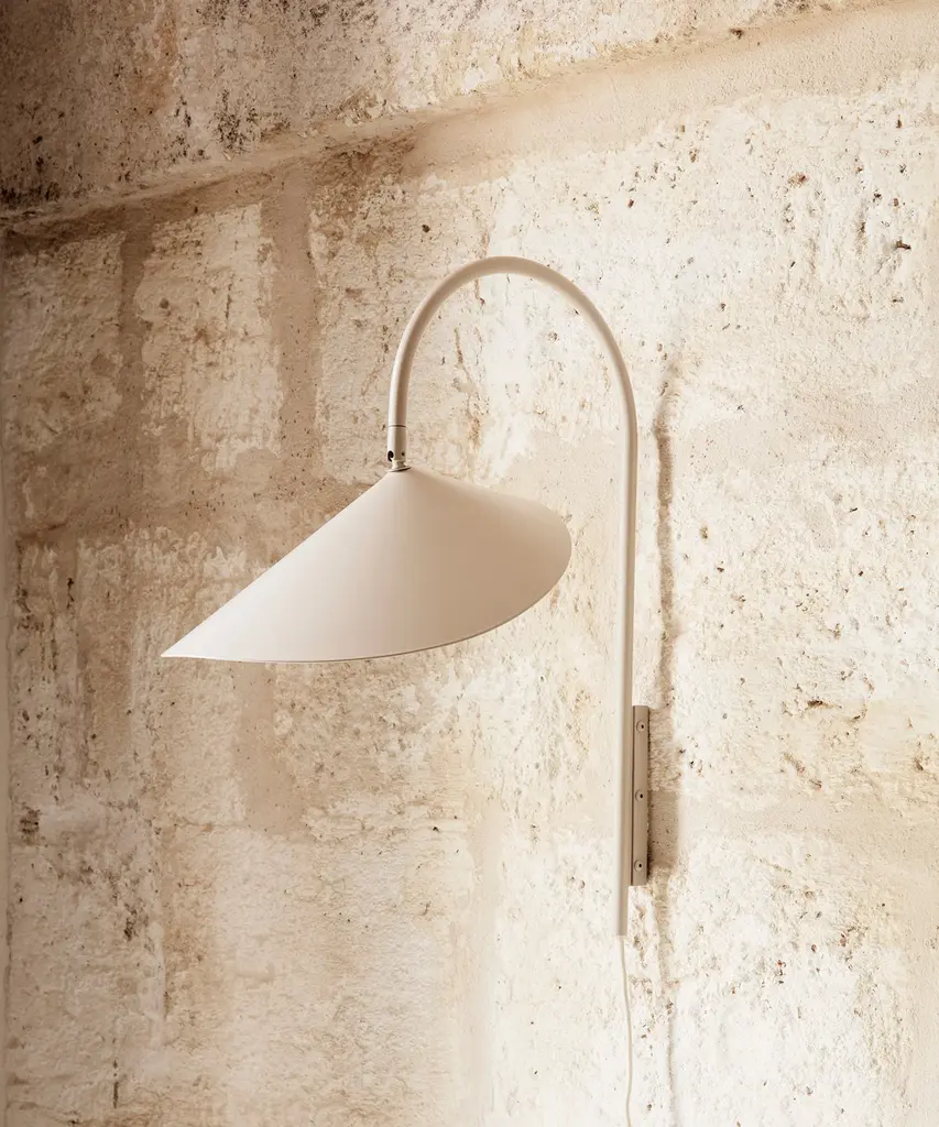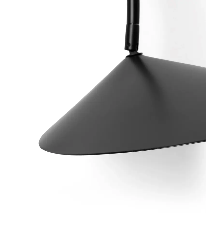 The Arum Wall Lamp is characterised by the organically shaped shade suspended from curved metal arch in a leaf-like manner. With the matte, off-white inside of the shade, the lamp provides a soft, evenly distributed light, and the lampshade can be adjusted to ensure optimal light conditions in all situations. The lamp is delivered with a wall bracket, so it is easy to mount on a wall. Designed and produced by the Copenhagen-based studio Ferm Living.